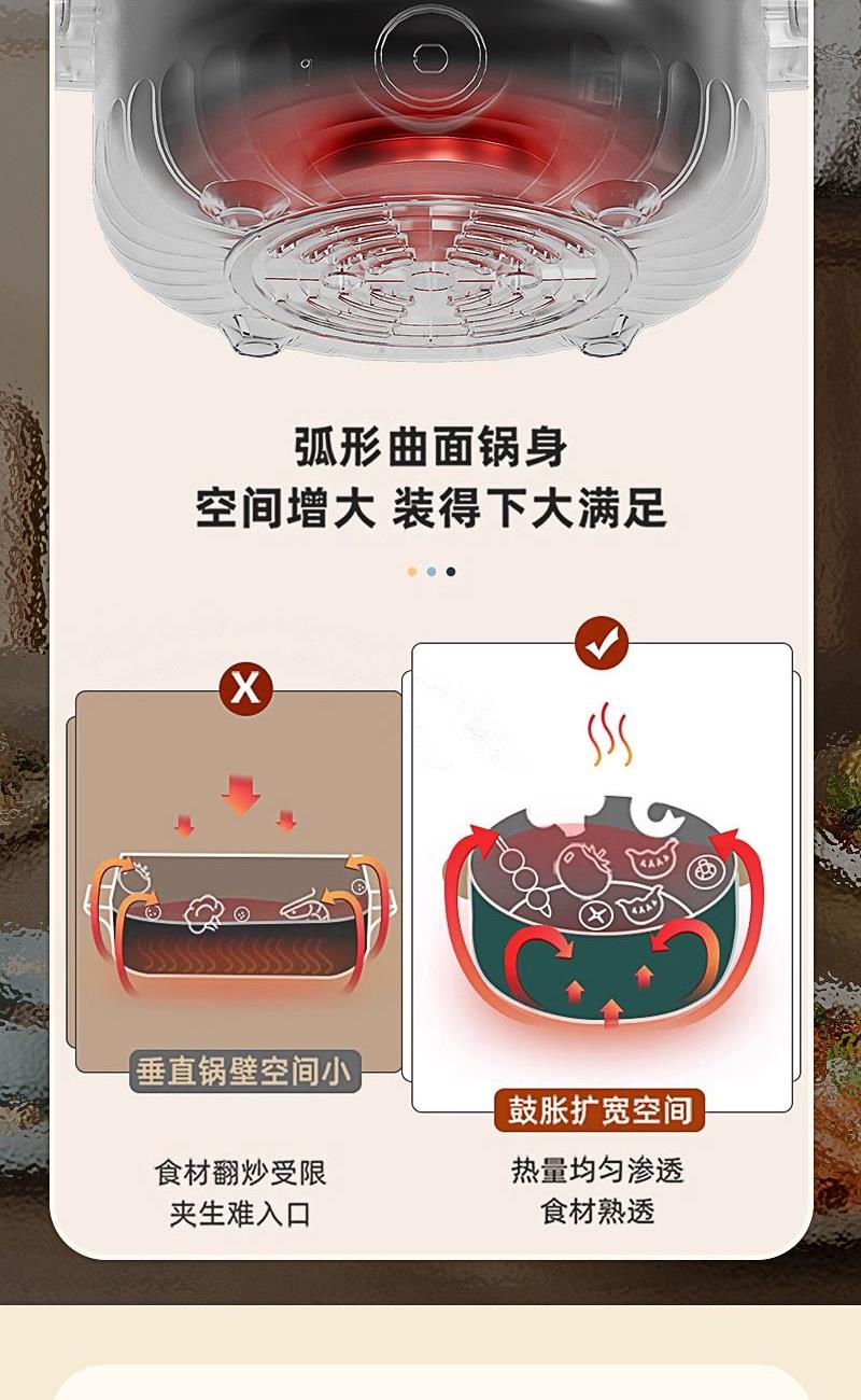 额定电压:220V~ 额定功率:1350W 额定频率:50Hz 容量:6L 产品尺寸:6L: 360*355*200mm(长x宽x高 1、优质基材,不粘锅身; 2、加大功率,超强导热,高效储热,节能省时; 3、旋钮式控制开关,简易操作; 4、蒸煮焖炒多功能为一体。