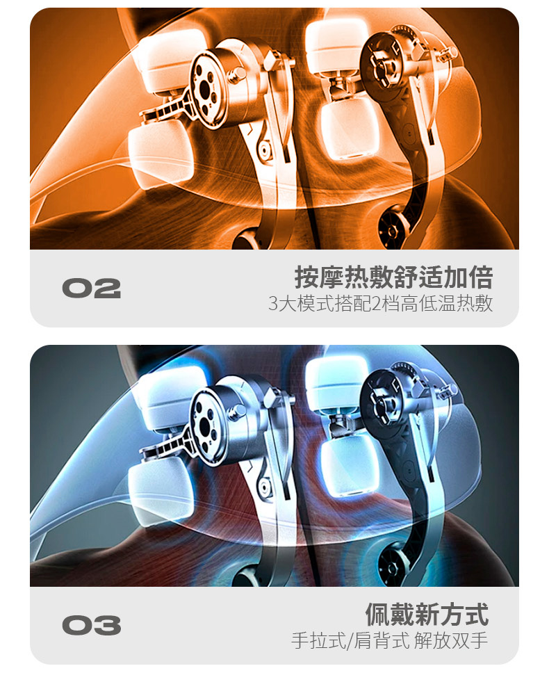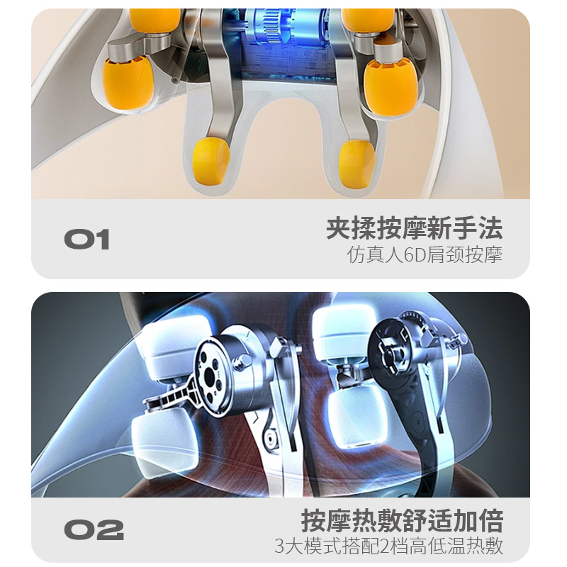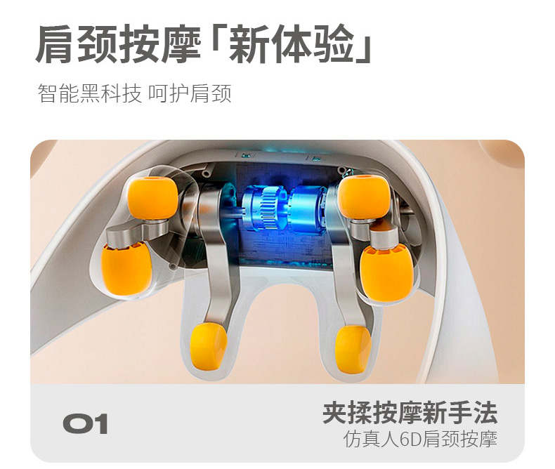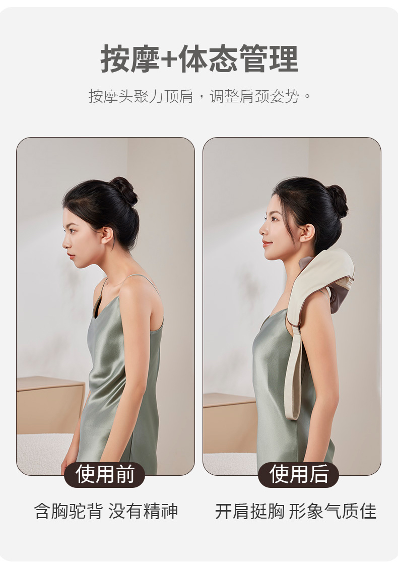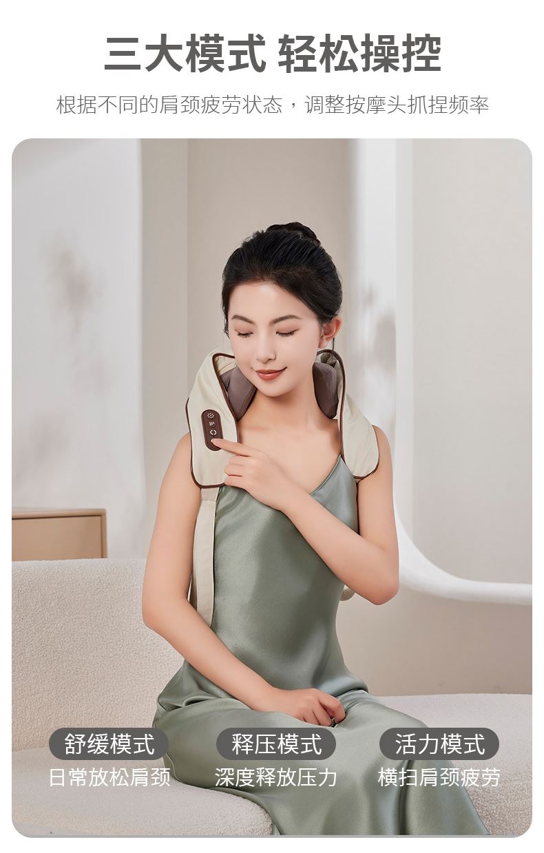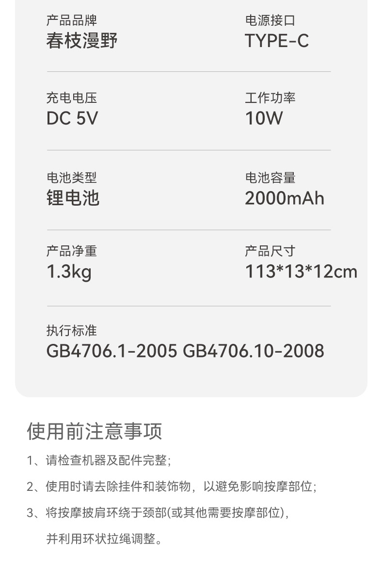 额定电压:5V 额定功率:10W 默认定时:10分钟 电池容量:2000mAh 净 重:1.3kg 模拟人手八字揉捏,肩颈×斜方肌倍享轻松 2档热敷温养,快速舒缓酸胀感 2大模式一键心选,强劲揉捏斜方肌 无线灵活穿戴,轻便实用双在线 一机拿捏多部位,10分钟舒颈松肩刚刚好