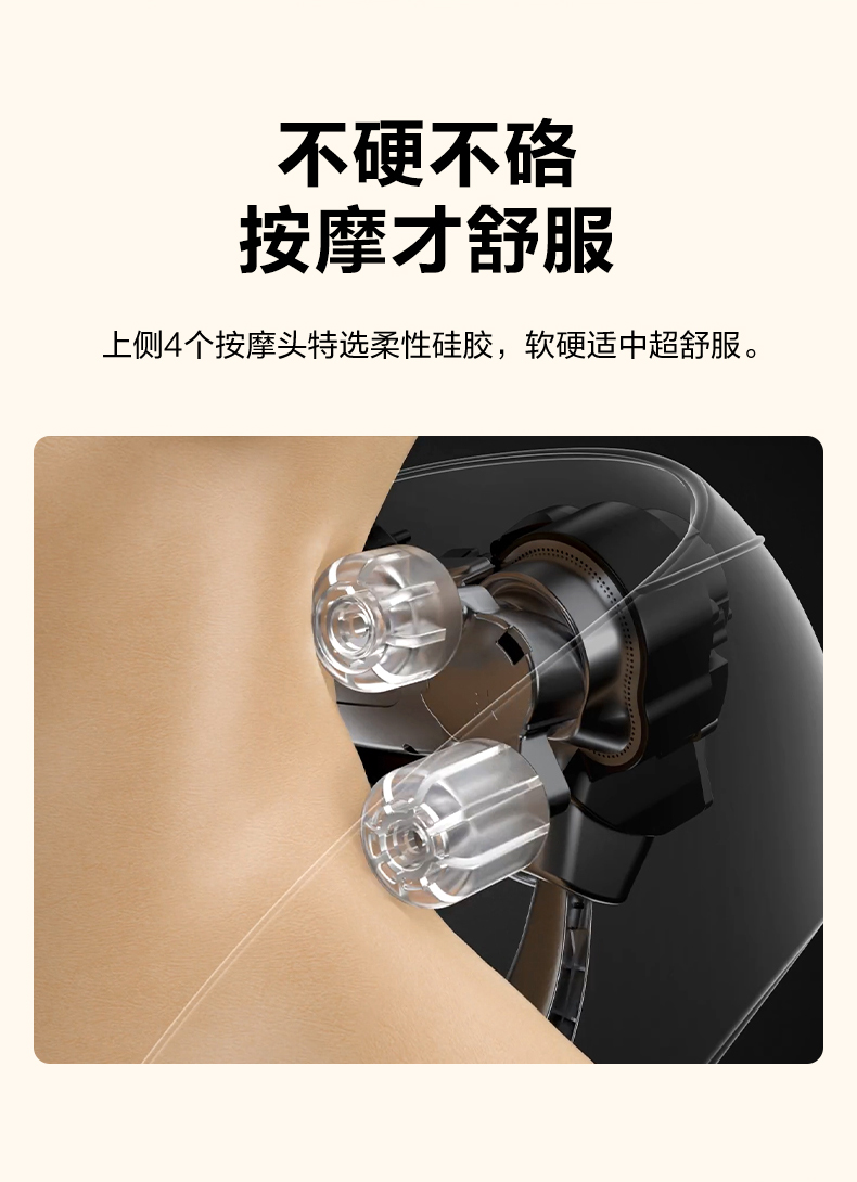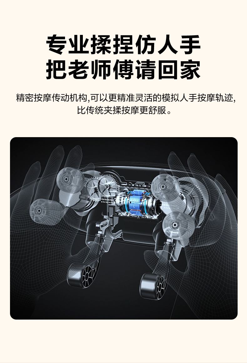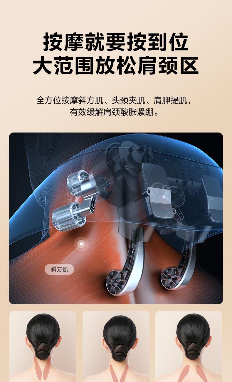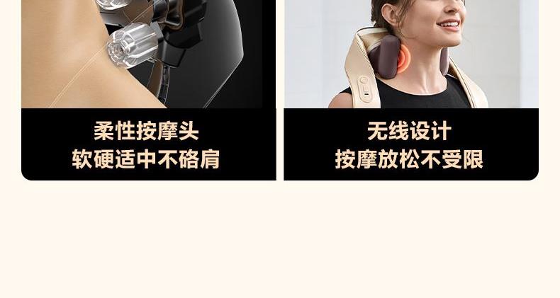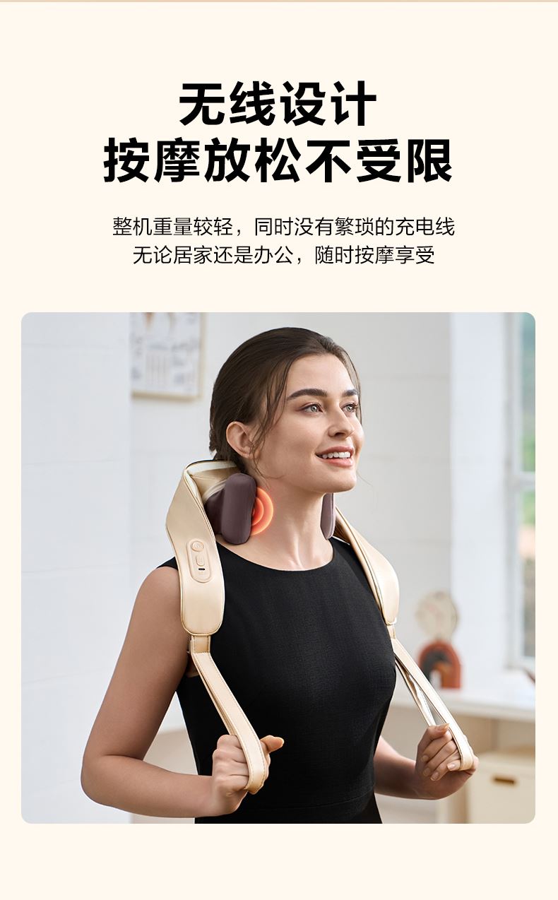 产品描述: 颈椎夹揉,斜方肌推揉 传动机构 肩背式一体化设计 硅胶可回弹按摩头 布套可拆卸水洗 颈、腿、腰全身可用 产品参数: 机身材质:PU皮革 电源电压:5V/10W 充电接口:type-C 控制方式:机身按键 语音播报:无 电池容量:2200mAh锂电池 续航时间:4次(60分钟) 按摩时间:15分钟 按摩模式:3种 热敷档位:2档 温度挡位:41/45 ℃ 单台毛重/净重:1.53/1.35kg 彩箱尺寸:235*148*190mm