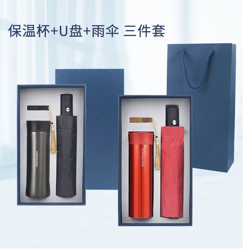 礼盒配置: 1、 400ML LOCK&LOCK 保温杯 2、全自动8骨三折伞 尺寸:280*56mm 3、金属镂空16GU盘 4、蓝色包装盒尺寸:182x326x75mm 5、蓝色手提袋尺寸:192x346x85mm 6、颜色:黑色、红色 7、重量:25kg/箱