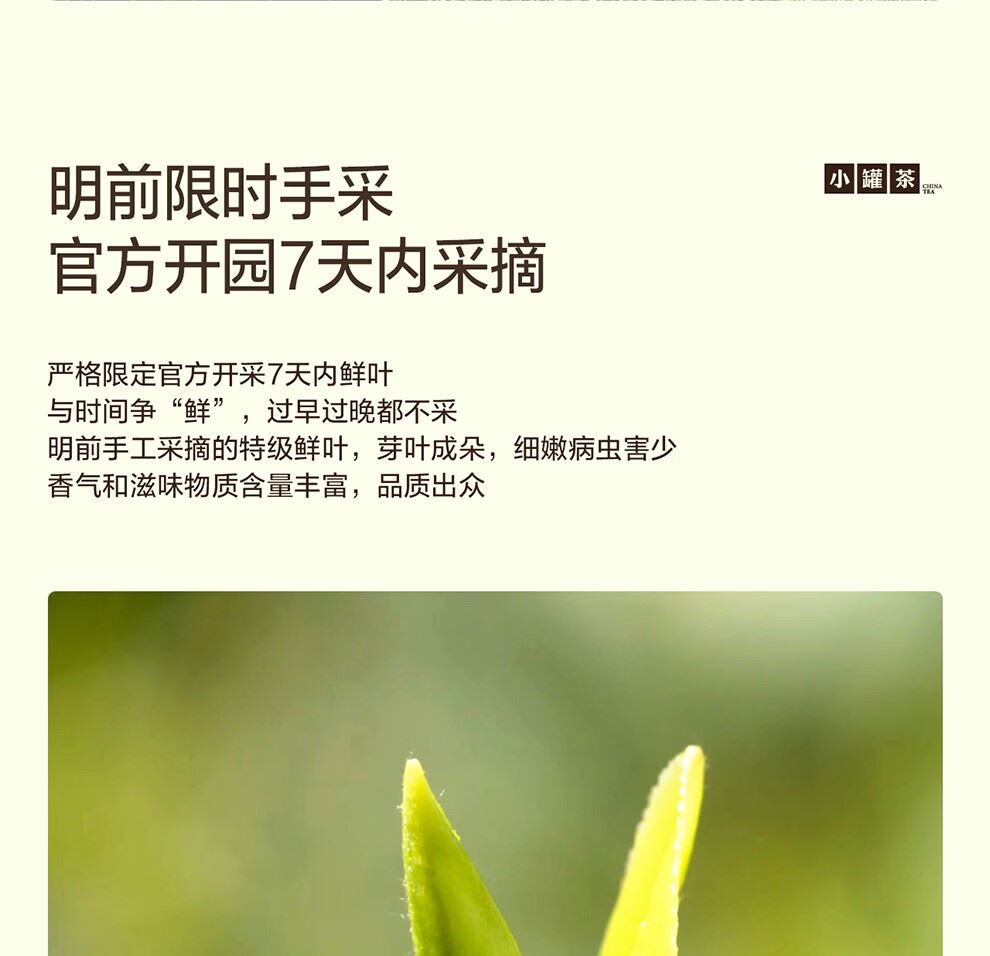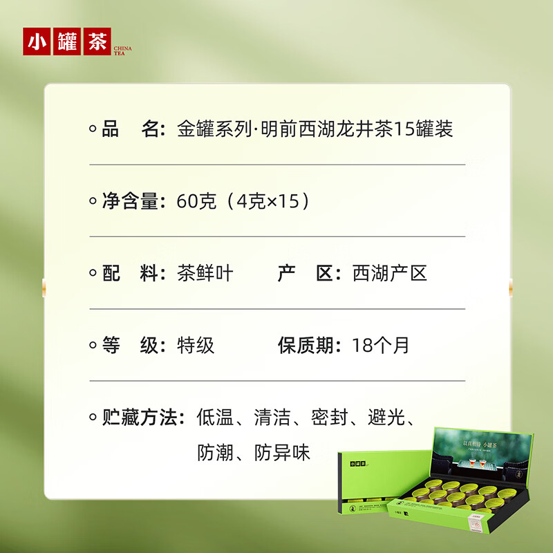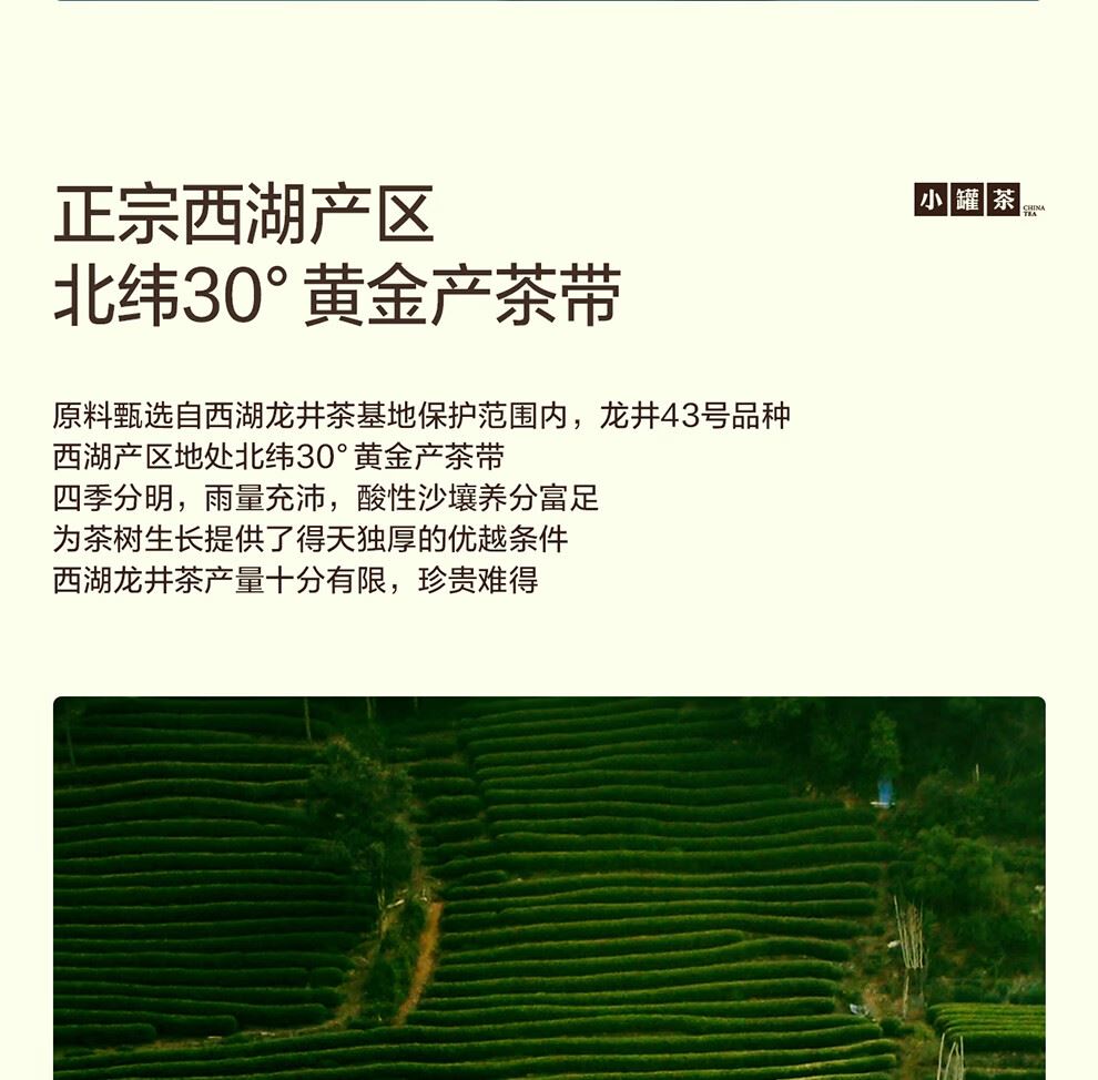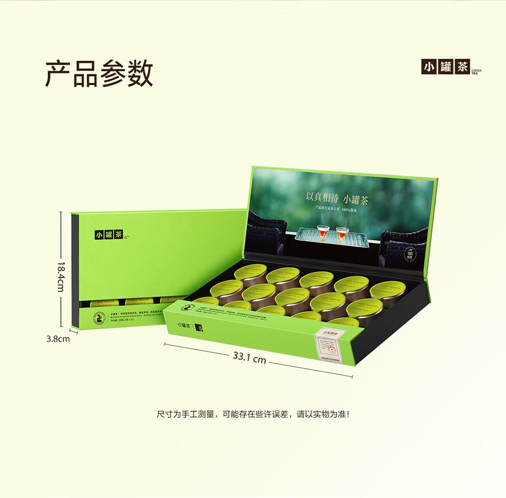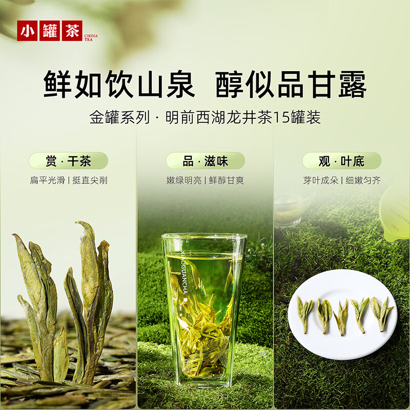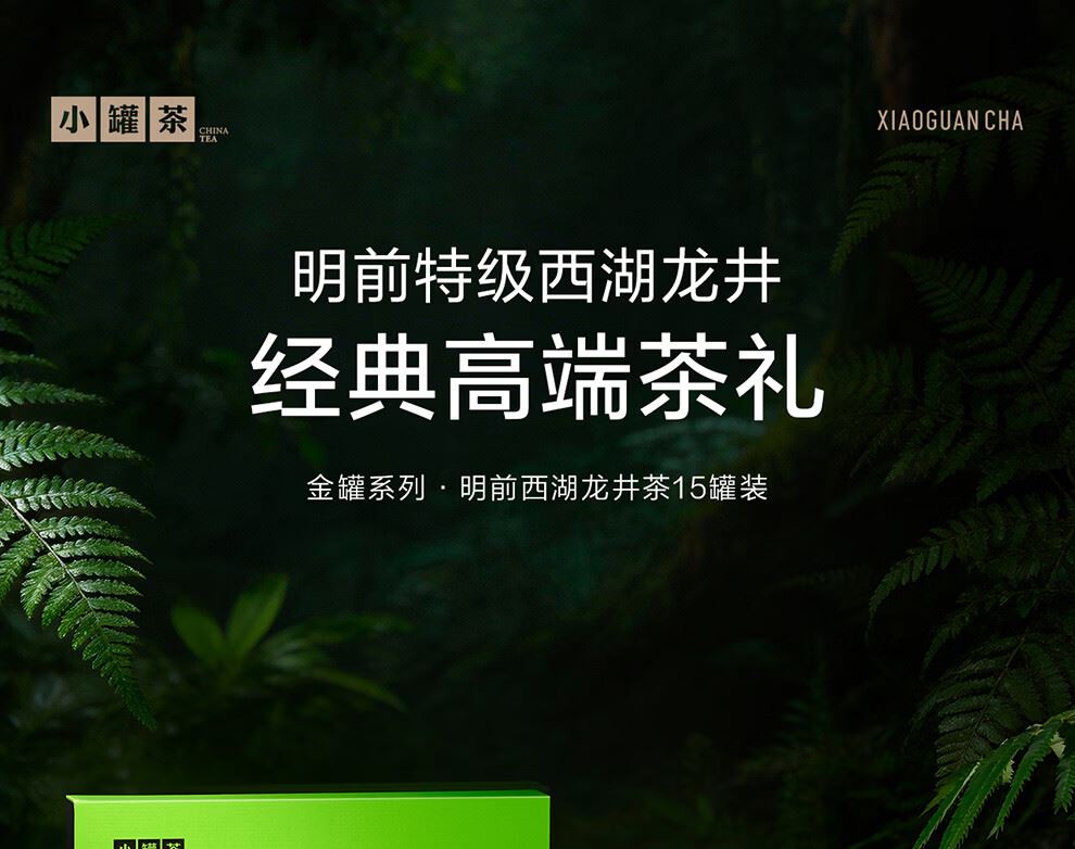 轻奢商务茶叶pin牌-小罐茶 小罐茶全国线下2000+实体门店 公证处公证 x 小罐茶敢保真(产地保真、年份保真、安全保真) 高duan档次商务送礼就送小罐茶 嫩栗鲜香的“江南春” 大师系列·西湖龙井茶15罐装(金罐) 净含量:60克(4g*15罐)等级:特级 礼盒尺寸:33.1*3.8*18.4cm - 西湖产区 | 明前龙井 | 特级品质 正宗西湖产区龙井茶 明前开园7天内采摘 严格限定官方开采7天内鲜叶,手采龙井43号特级原料与时间争“鲜”,过早过晚都不采;明前采摘的鲜叶,芽叶细嫩病虫害少,香气和滋味物质含量丰富,品质出众。 - 让舌尖懂茶 是好茶的责任 精致礼盒包装,送礼体面彰显尊贵。15罐独立包装,传递社交礼赠祝福。一饮一罐,定量封装,手不沾茶,更显品位;一盒满足礼赠贵宾、商务会面、重要答谢等需求。
