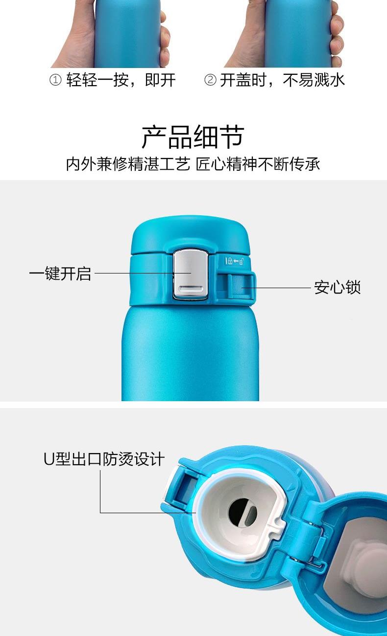 型号:SM-SC60 开盖方式:一键式弹盖 颜色:珊瑚粉色PV,绿松石色AV 容量:600ml 内胆涂层:含防粘涂层 外形尺寸(宽深高):6.5x7x25cm 保温效率:88℃/1h、73℃/6h 保冷效率:8℃/6h 产品特点: 1.单手开合设计方便饮水,防漏安全扣 2.防粘涂层处理内容器,易于清洗,不易附着污垢及异味 3.分离式内栓,可整个拆下,内外皆可清洗,使用更卫生 4.SLIT超轻巧,便于携带,可放置包中 杯身附有防护拴 5.超真空双层保温,24小时超长时间保温 外出旅游方便携带