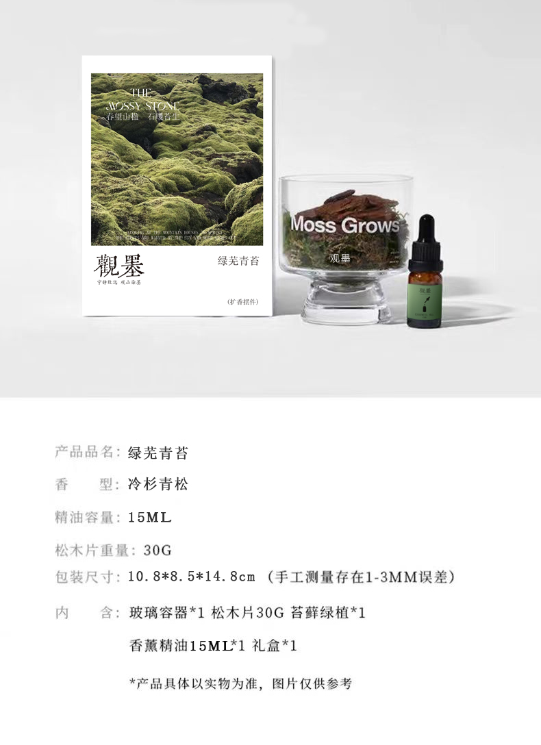 香味:冷杉木松 前调:尤加利/香根 中调:青松/柏树 后调:檀香/龙涎 内容物: 玻璃容器*1 松木片30g 苔藓绿植*1 香薰精油15ml*1 礼盒*1 包装尺寸:10.8*8.5*14.8cm(手工测量存在1-3MM误差)