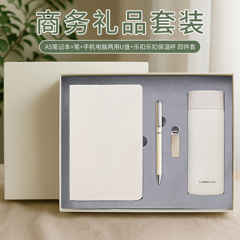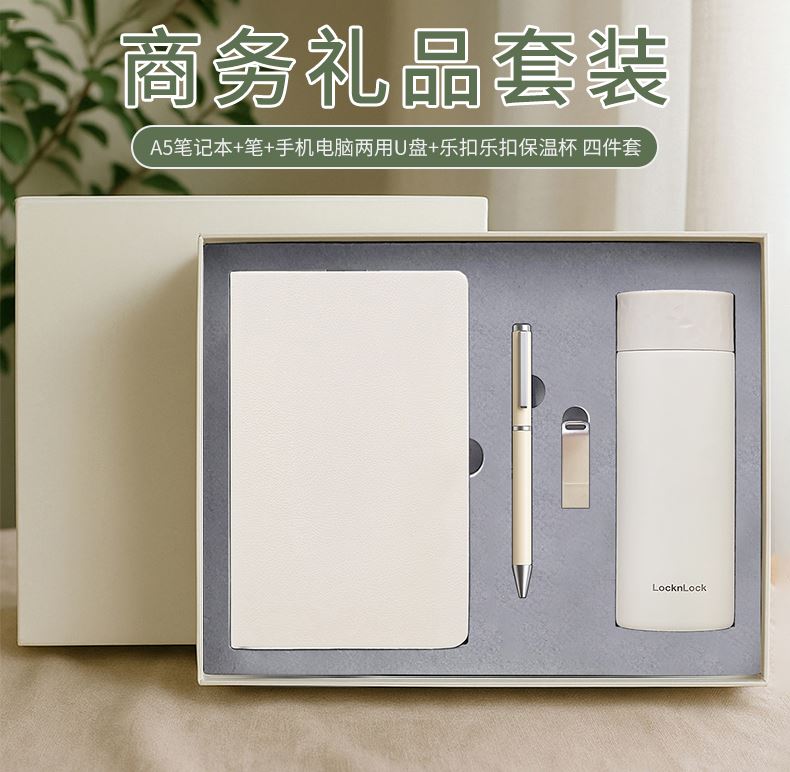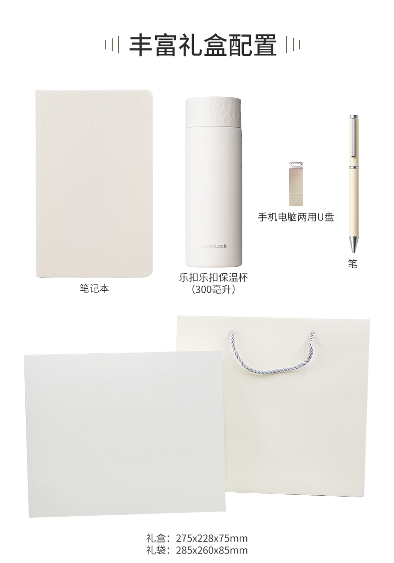 礼盒配置: 1、A6硬皮PU笔记本 2、金属烤漆笔 3、旋转手机电脑两用16G U盘(Type-C/USB) 4、LOCK&LOCK 保温杯 316内胆 300ml 5、包装盒尺寸:275x227x75mm 6、手提袋尺寸:286x260x85mm 7、颜色:米白色 8、重量:25kg/箱