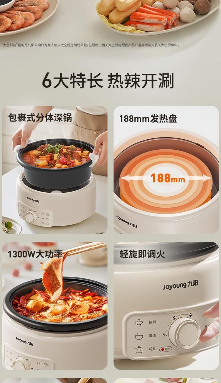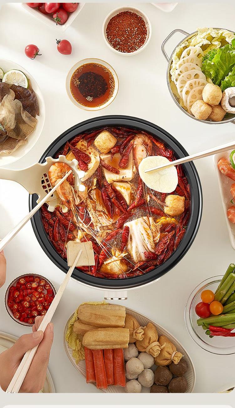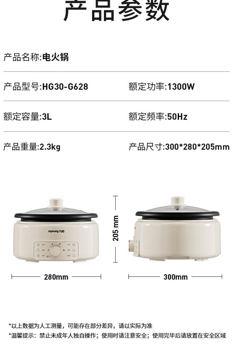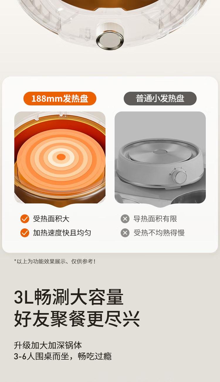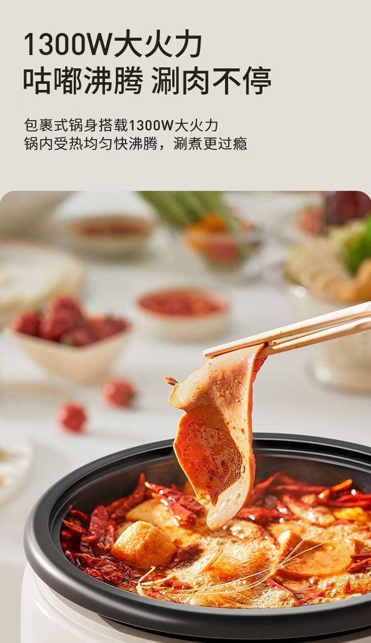 1、包裹式分体锅身,热得快又好洗 2、1300W大火力,快速沸腾 3、188mm大加热盘,受热更均匀 4、3L畅涮大容量,好友聚餐更尽兴 5、多功能、涮煮炖 6、食品级不粘,轻松洁净更省心 包装尺寸:320*195*315 毛重:2.6KG