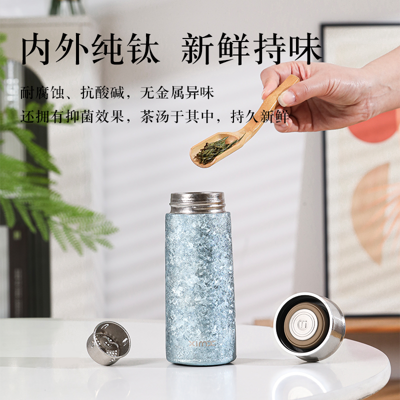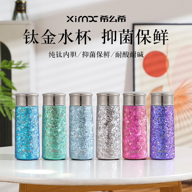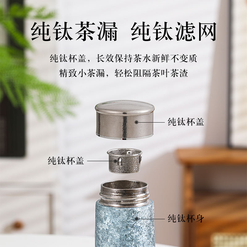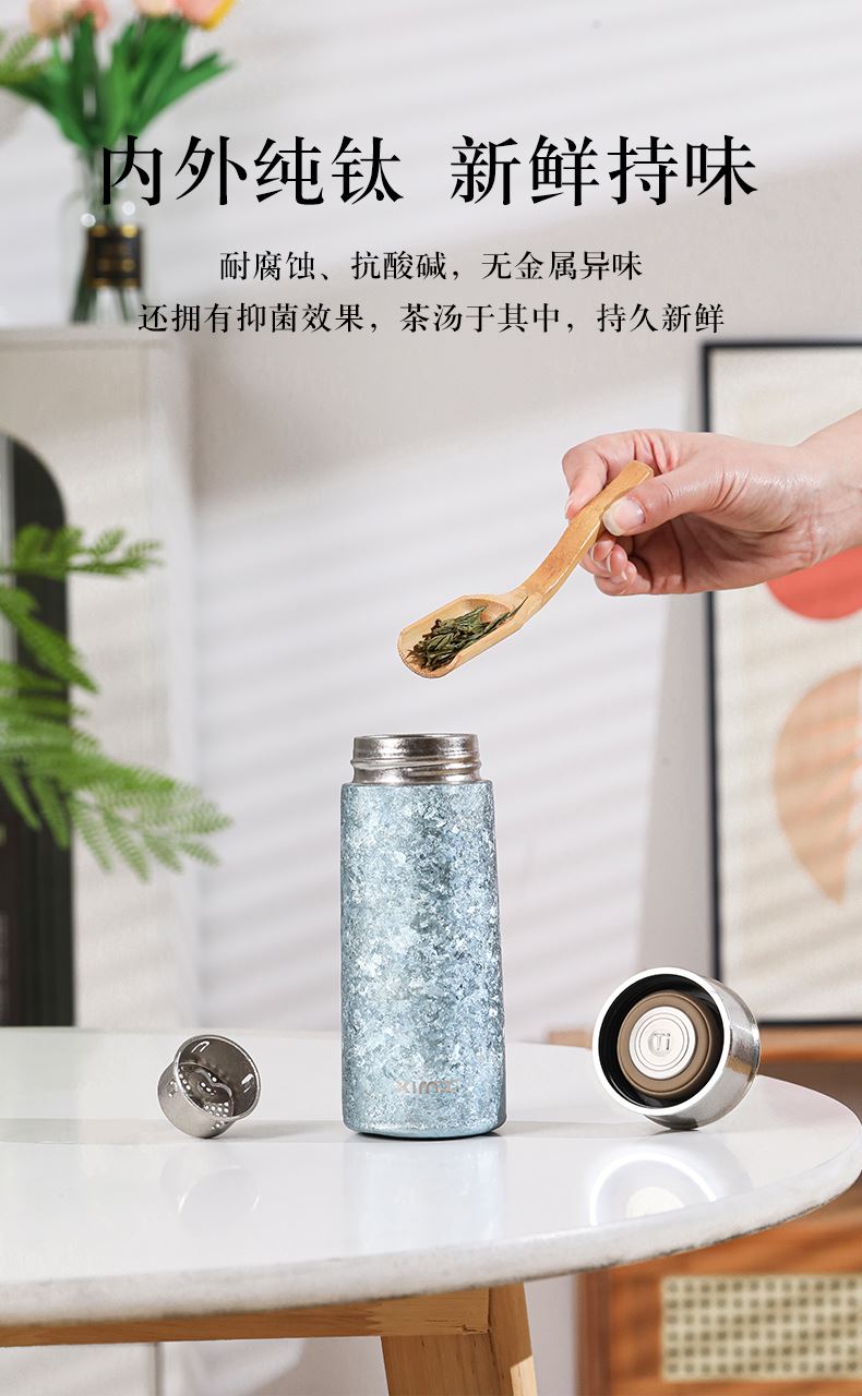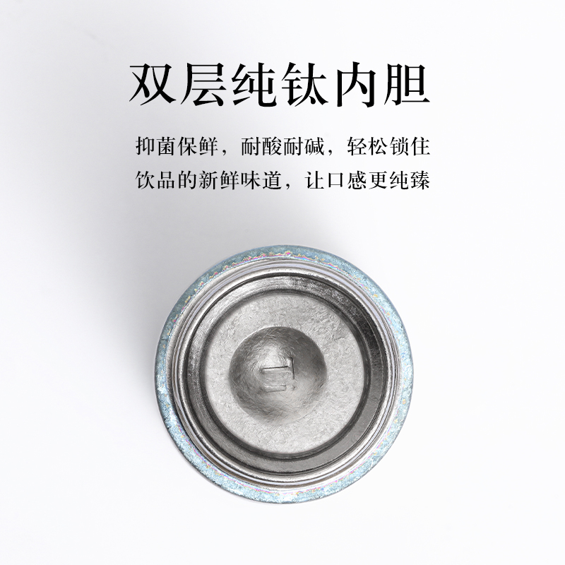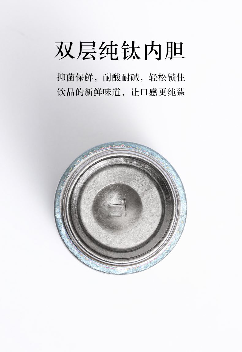 产品材质:钛 杯身样式:直身杯 产品容量:260ml 产品尺寸:65*200mm 颜色分类:孔雀蓝,紫色,冰花银,冰花蓝 ,绿色,冰花粉 高颜值,带茶水分隔,携带方便,适用于多种场合,冰花质感,磁吸款杯盖更方便。 无重金属析出、耐酸碱、耐腐蚀、不含磁、易清洁、抑制细菌保鲜时长可5-7天,杯身外观自然成色,不使用一滴颜料,不存在掉色、“铅”超标等问题