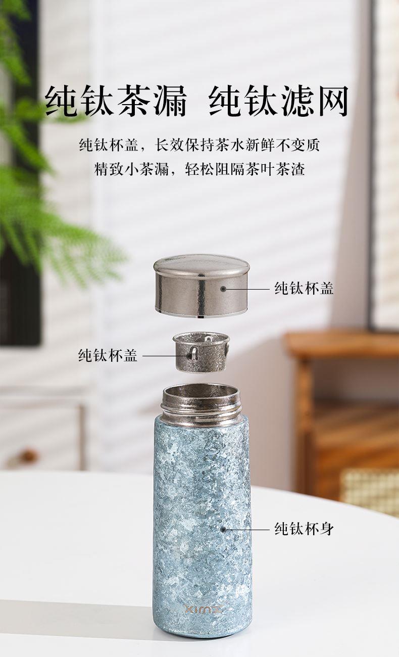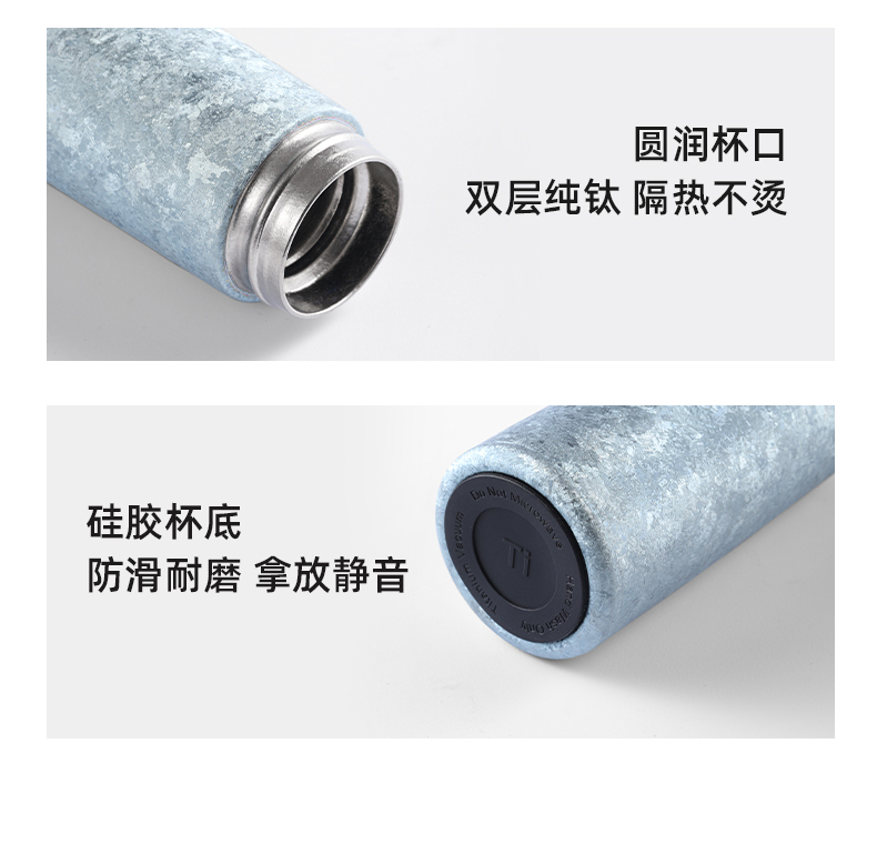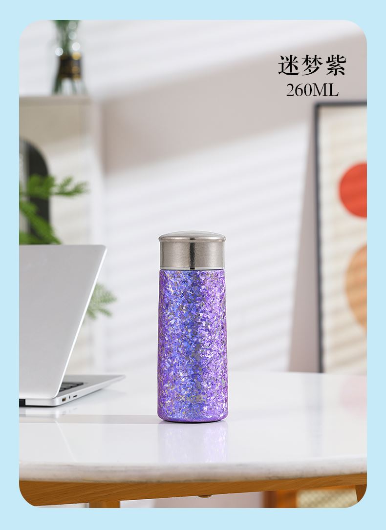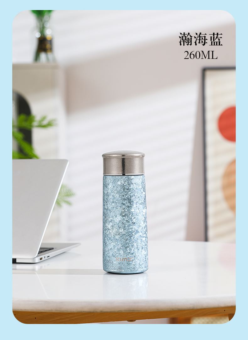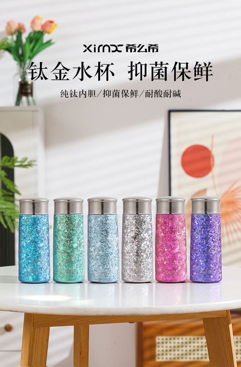 产品材质:钛 杯身样式:直身杯 产品容量:260ml 产品尺寸:65*200mm 颜色分类:孔雀蓝,紫色,冰花银,冰花蓝 ,绿色,冰花粉 高颜值,带茶水分隔,携带方便,适用于多种场合,冰花质感,磁吸款杯盖更方便。 无重金属析出、耐酸碱、耐腐蚀、不含磁、易清洁、抑制细菌保鲜时长可5-7天,杯身外观自然成色,不使用一滴颜料,不存在掉色、“铅”超标等问题