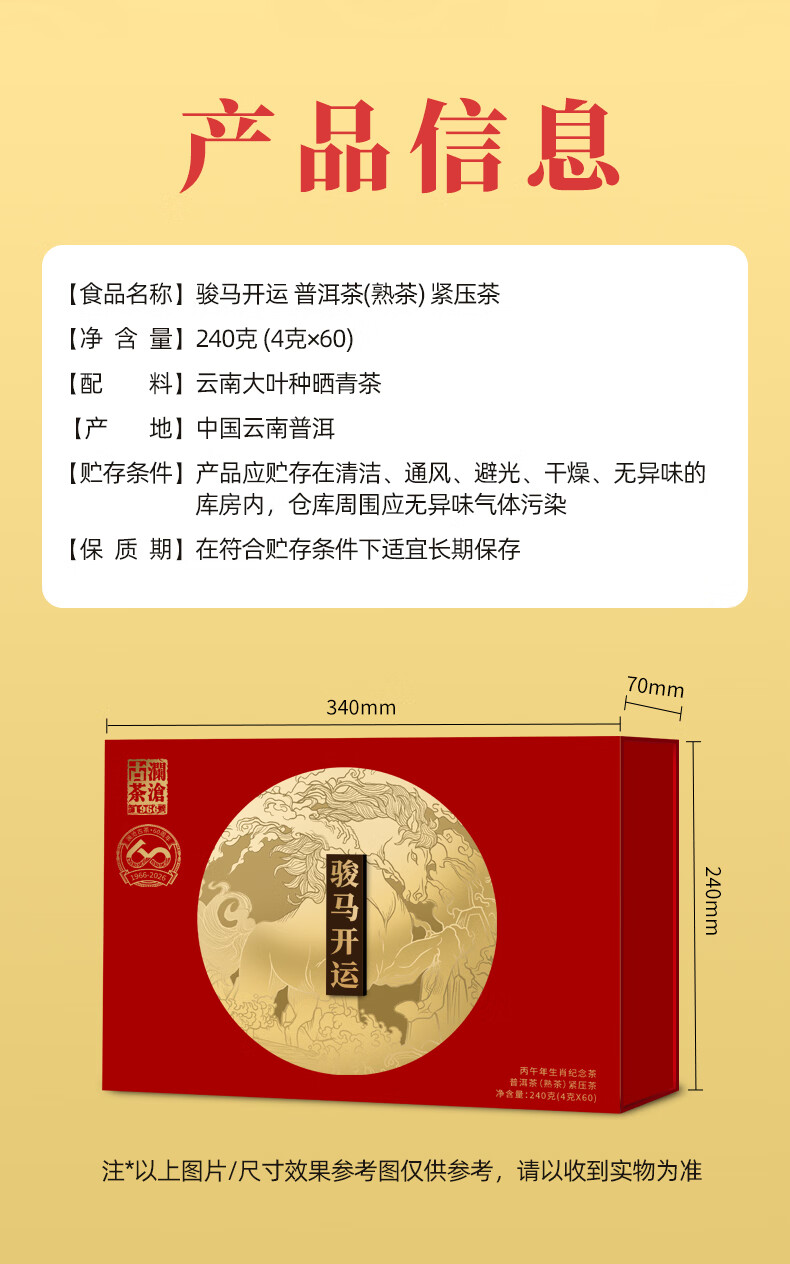 规格:357克 / 片 礼盒采用经典的红金配色,搭配精致的骏马剪纸纹样,视觉上年味十足,契合马年 “马到成功” 的吉祥寓意