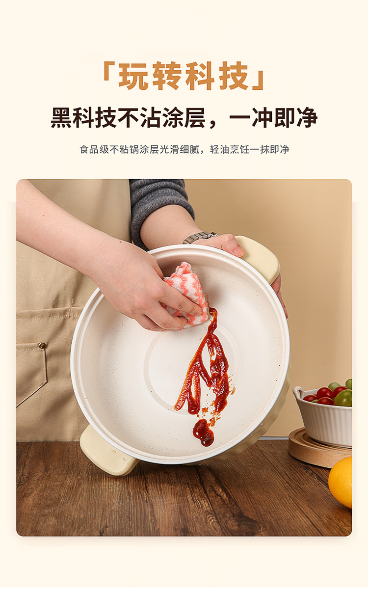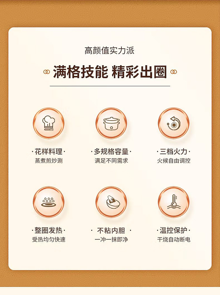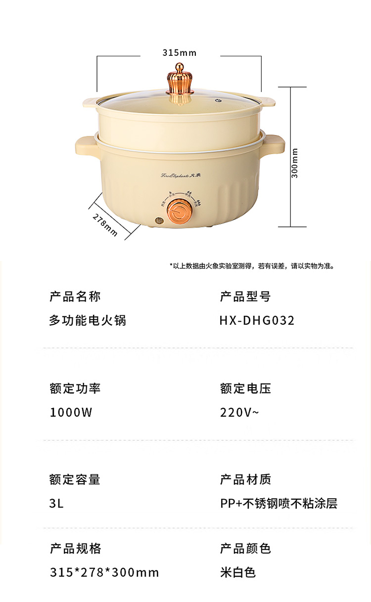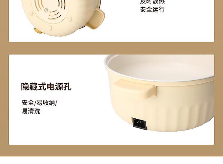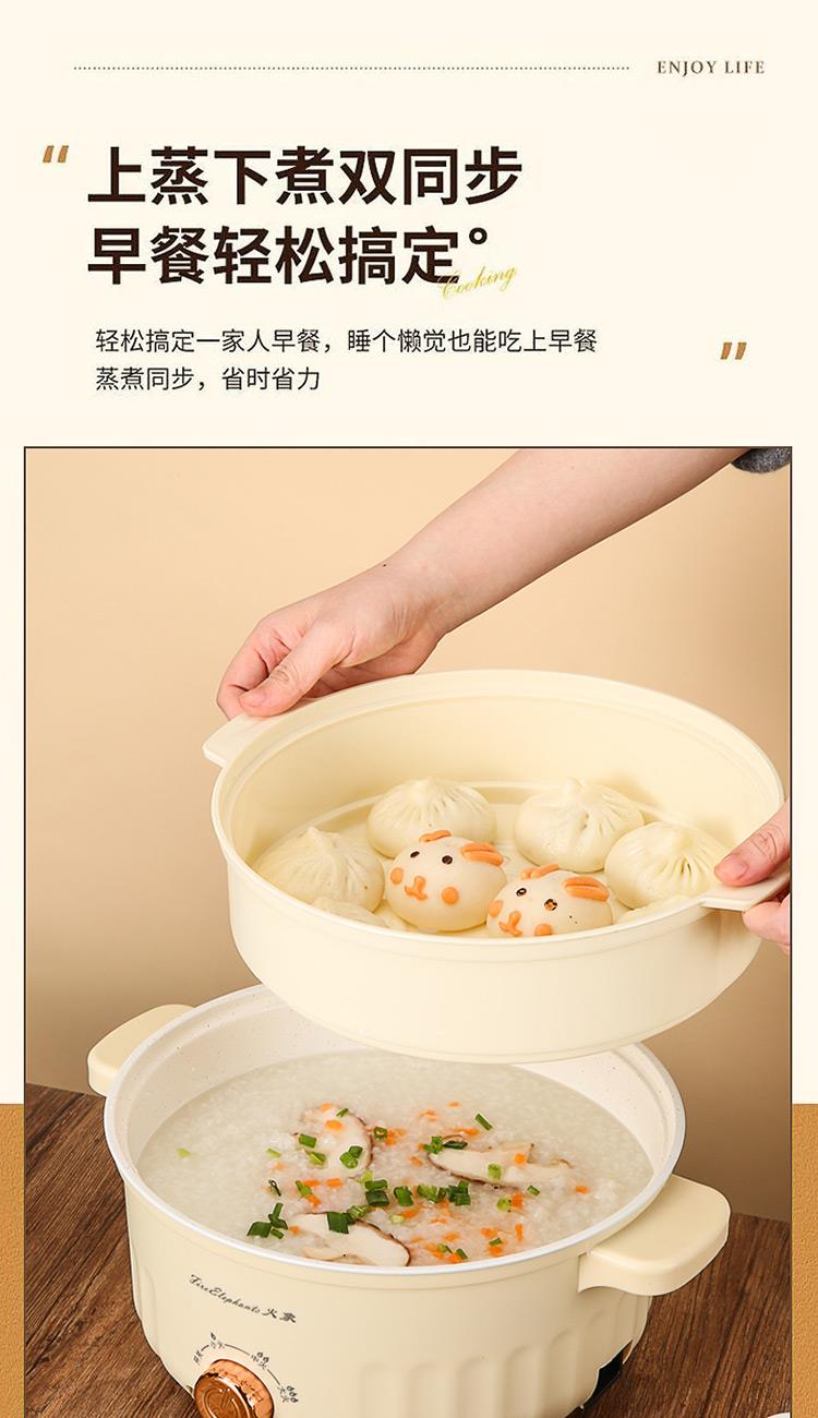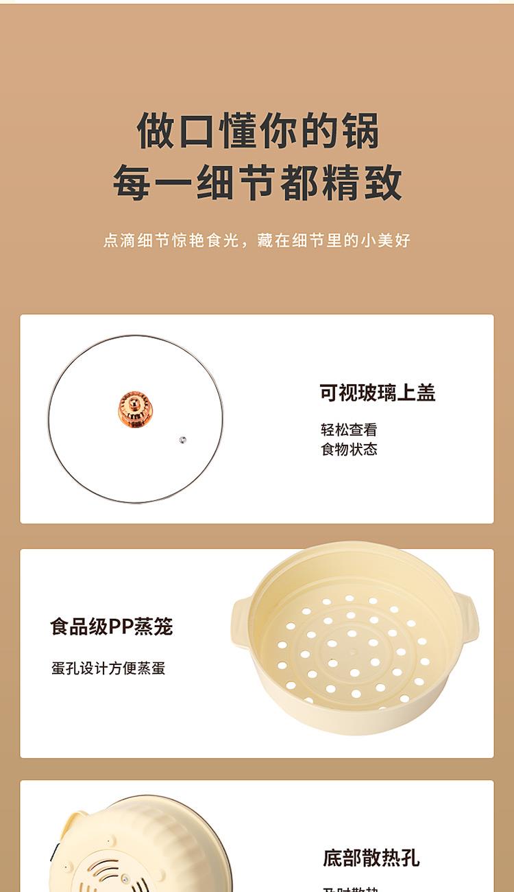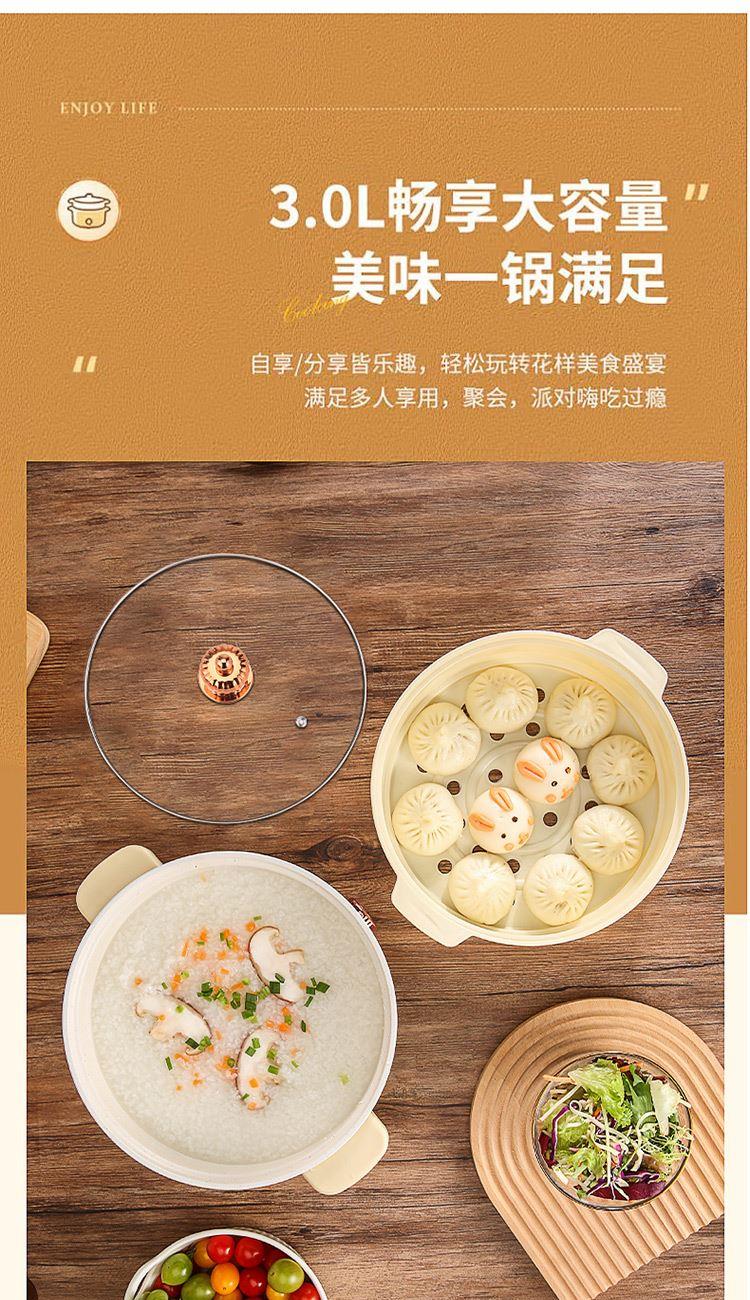 额定功率:1000W 额定电压:220V~ 额定频率:50Hz 额定容量:3.0L 产品净重/毛重:1.1kg/1.3kg 产品材质:PP+不锈钢喷不粘涂层 产品颜色:米白色 产品规格:315*278*225mm 彩盒尺寸:269*184*270mm 外箱尺寸:570*555*550mm 一体式锅体设计,简约便携,节省空间; 带蒸格上蒸下煮,加热更快,受热更均匀; 旋钮控制,操作简单方便; 黑科技不粘涂层,久用不粘,一冲即净; 设有干烧自动跳断保护,安全料理更放心;