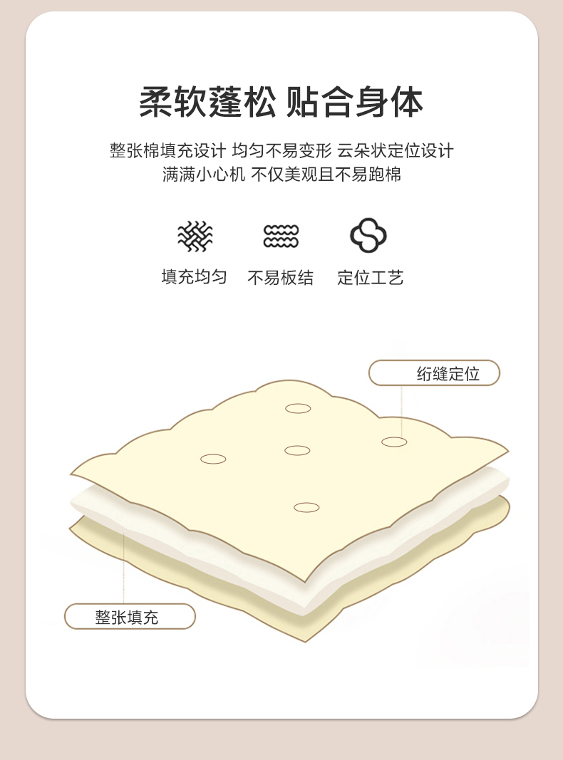 规格:150*200cm 面料:亲肤棉(聚酯纤维) 填充:羽丝棉 重量:700g 执行标准:GB/T22796-2021 安全类别:GB18401-2010 B类 1.甄选优质亲肤绒面料,亲肤磨毛织物是一种功能性织造方式,在保留面料原有性能的同时,通过再加工,使织物表面形成一层层细腻的短绒毛层的感觉,增加了贴身接触的柔软性和亲肤性。 2.采用羽丝棉填充,柔软蓬松,亲肤性佳,回弹性优,贴身覆盖且轻盈。