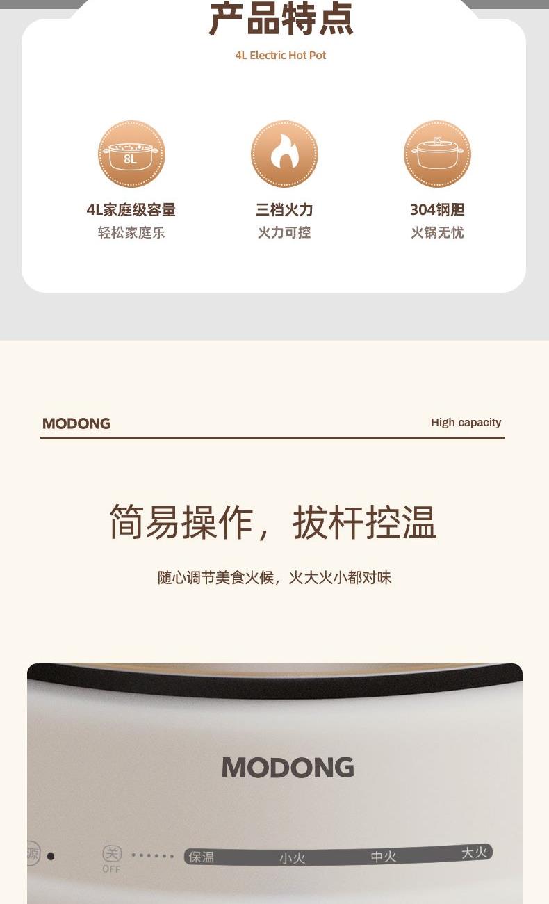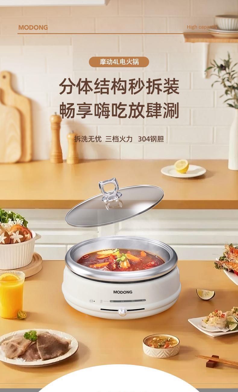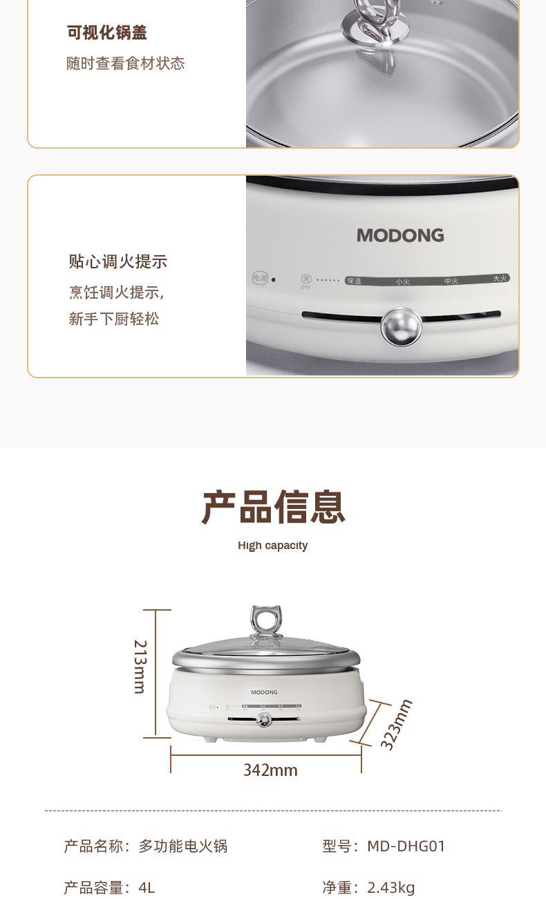 产品净重:2.43KG 产品毛重:3.22KG 额定功率:1300W 额定电压:220V~ 容量:4L 内含:主机x1、304钢内胆x1、说明书x1、 电源线x1 1.大火力1300W,环形加热管,食材全面快速受热; 2.简易操作,拔杆控温,锅体分开洗,餐后轻松收拾; 3.大容量4L,满足3-8人聚会涮火锅; 4.防干烧,断电保护,安全可靠更贴心。