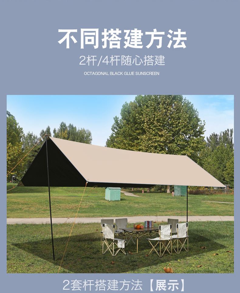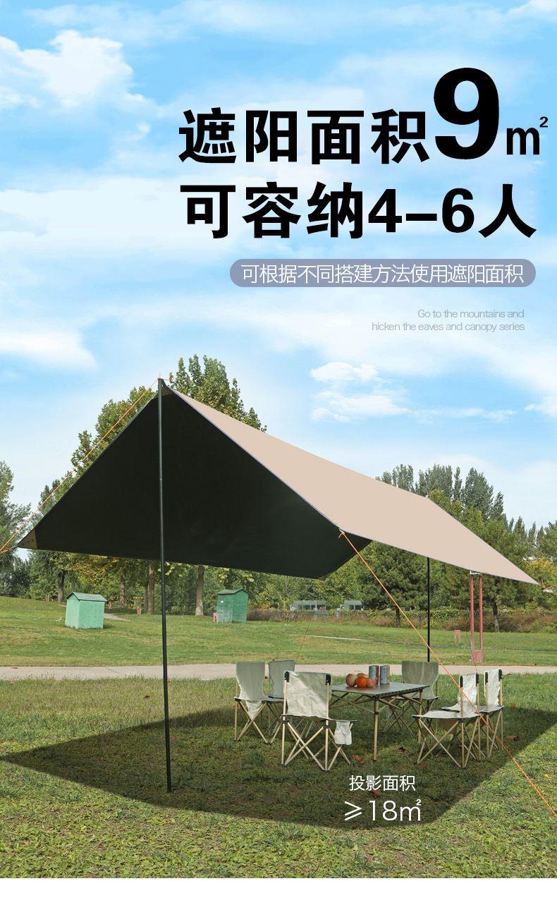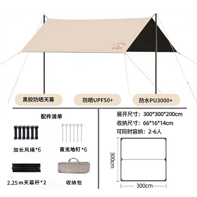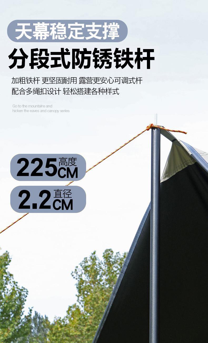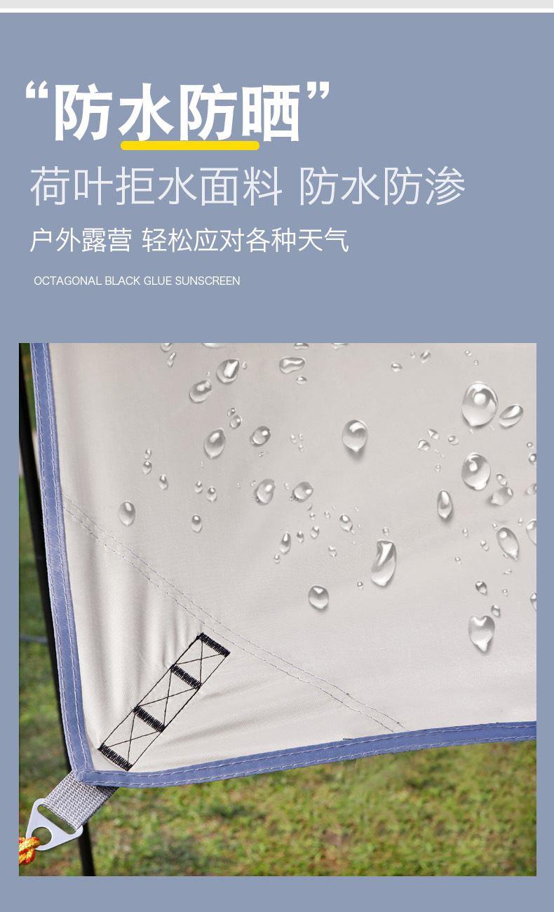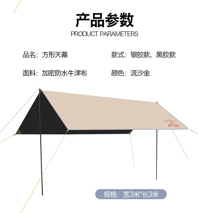 铁管直径:2.2cm 高度:230cm 防晒系数:UPF50+ 防水系数:pu3000+ 材质:210D牛津布 颜色:流沙金 尺寸:3*3m 净重:1.8kg