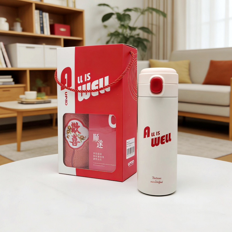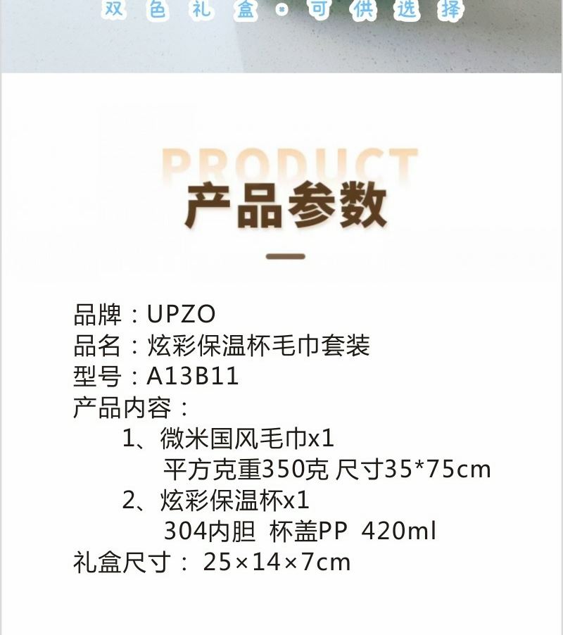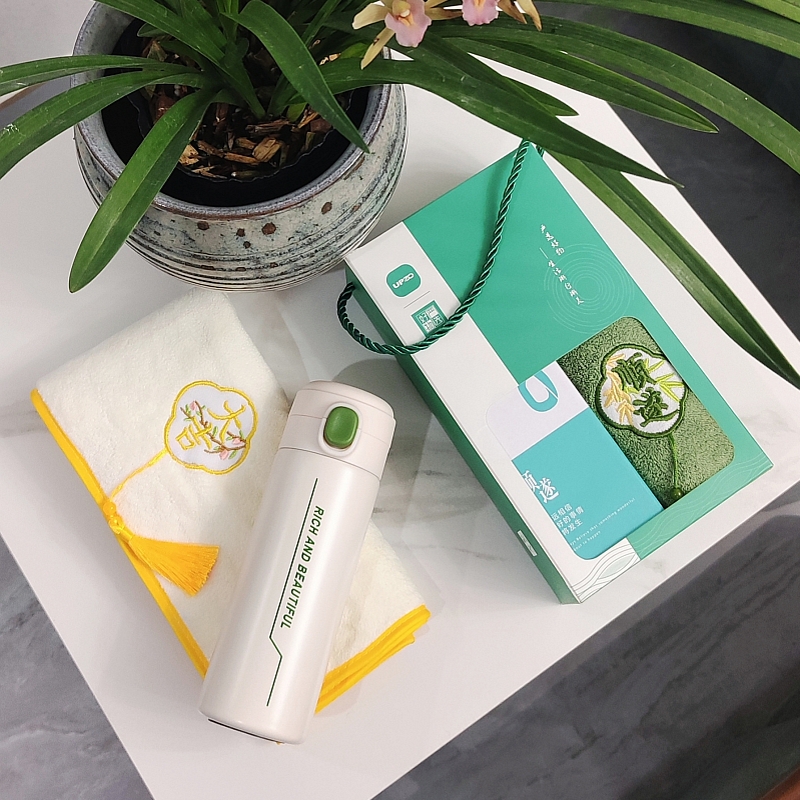 型号: A13B11 产品内容 1、 微米国风系列毛巾×1 微米纱 平方克重350克 规格35*75CM 2、 靓彩保温杯×1 304内胆 PP杯盖 420毫升容量 外盒: 25×14×7cm 炫彩保温杯设计融入祝福 外观和品质同在 国风微米毛巾融入祝福理念 面料升级 精工刺绣 为生活添彩