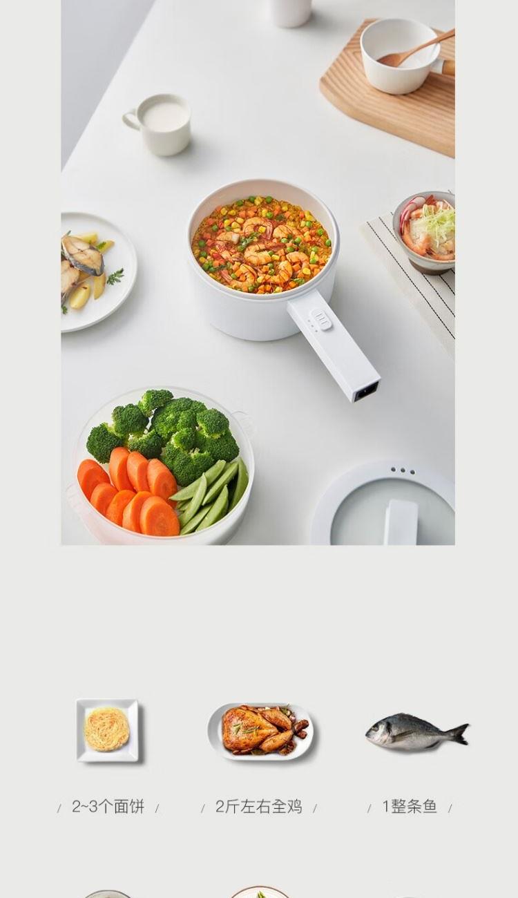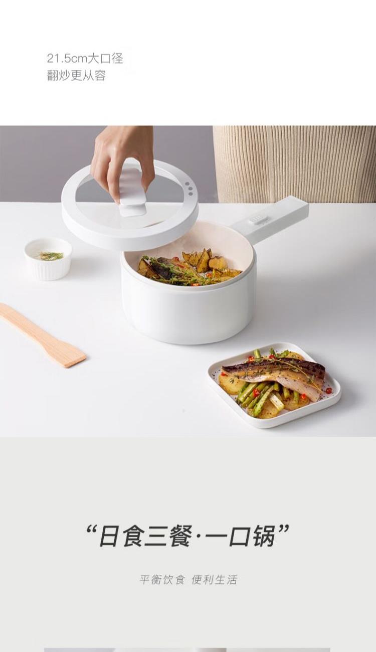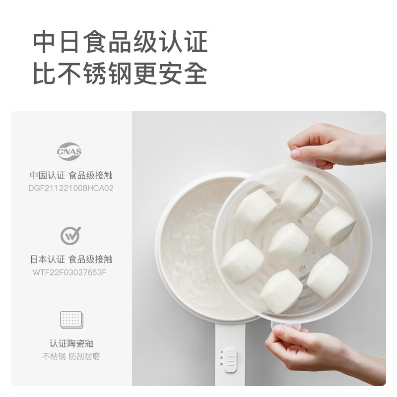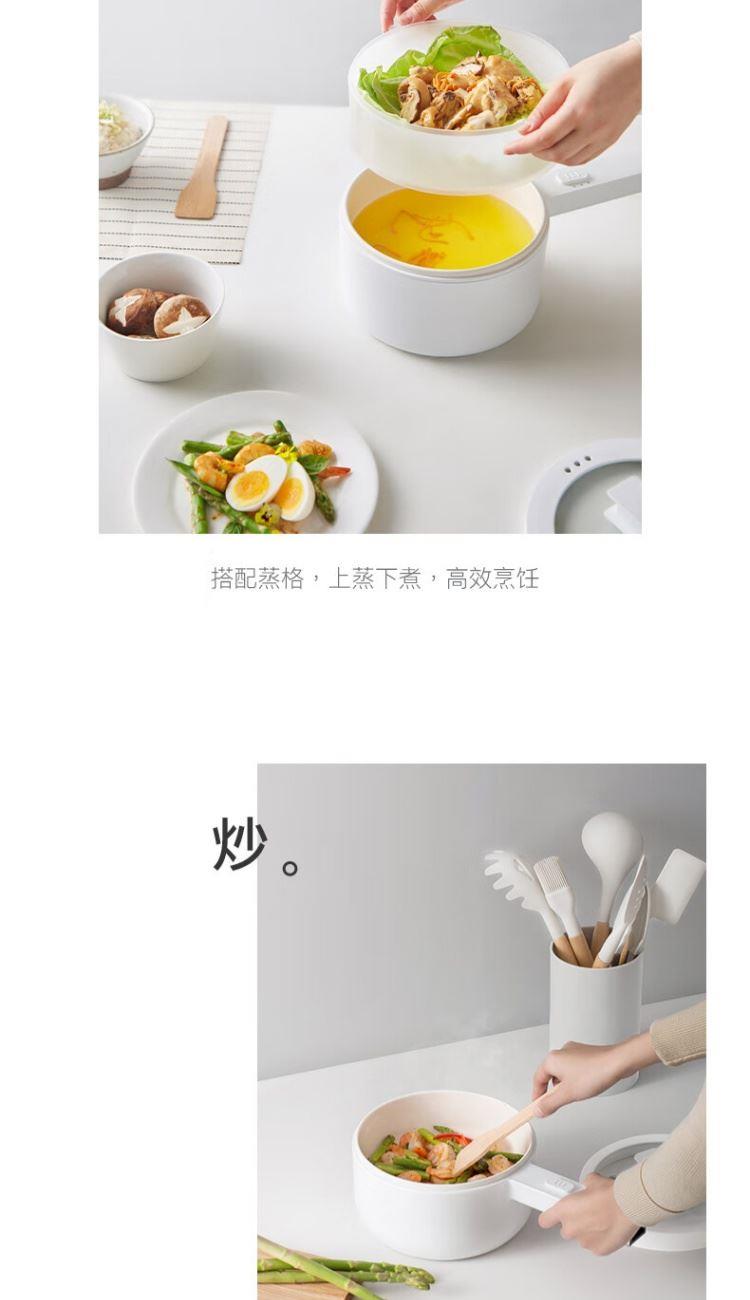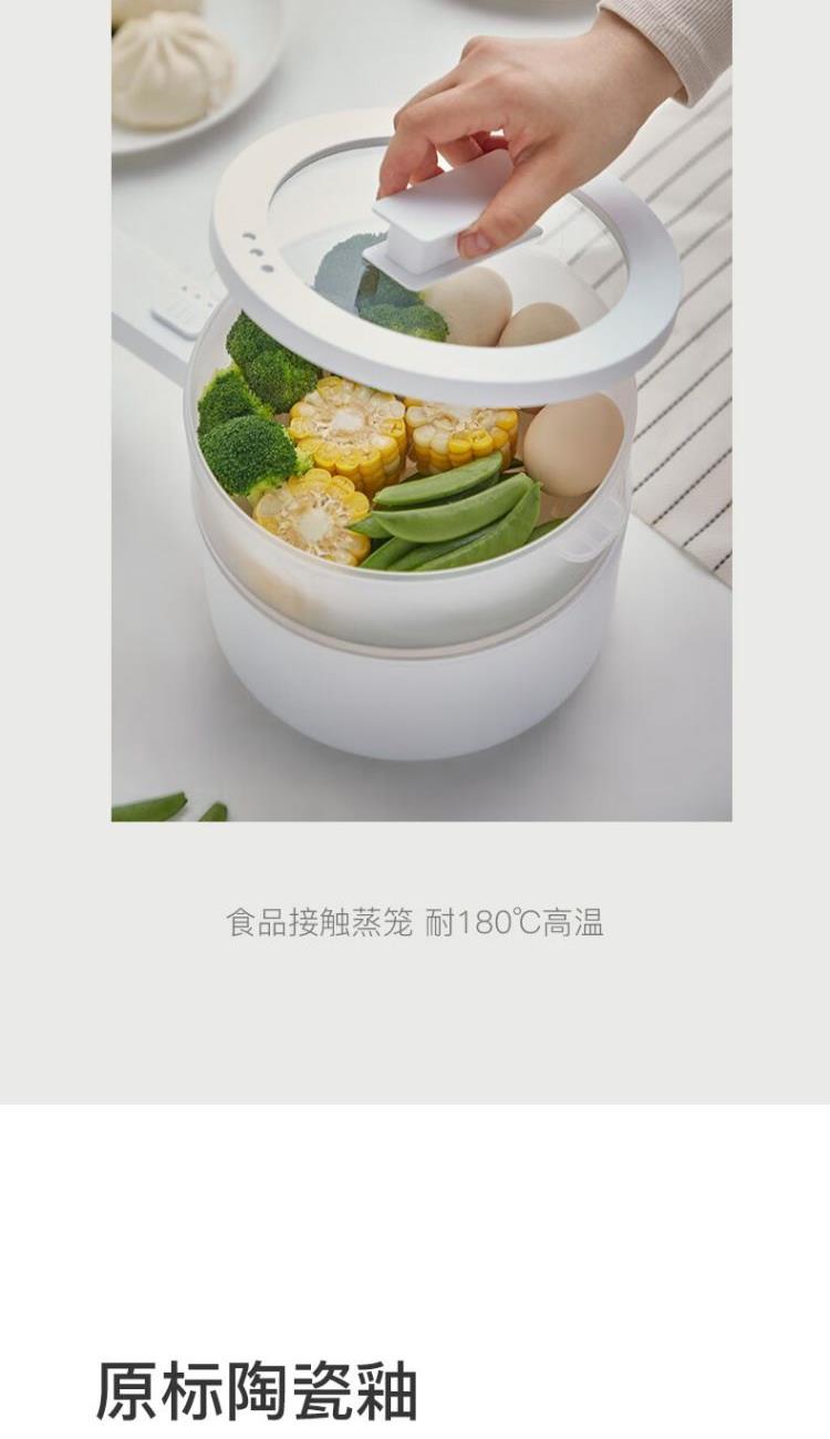 电煮锅:带蒸笼 颜色:陶白 容 量:2L 重量:1.35/2.05kg 额定功率:700W 产品尺寸:376*215*138mm 包装尺寸:462*267*158mm 1. 陶瓷釉内胆,导热快,不糊底 2. 安全易清洗,硬度8H无惧钢丝刷 3. 20cm大口径,锅深7cm,翻炒从容 4. 360°整圈发热,温度稳定,防干烧自动断电 5. 上蒸下煮,高透明食品级PP蒸笼(耐温180度)