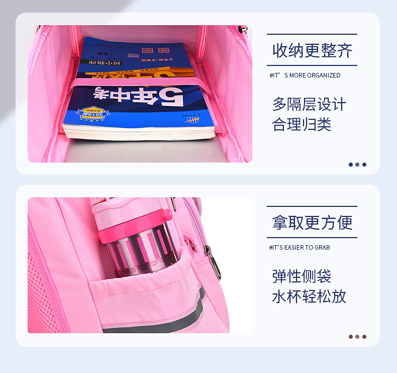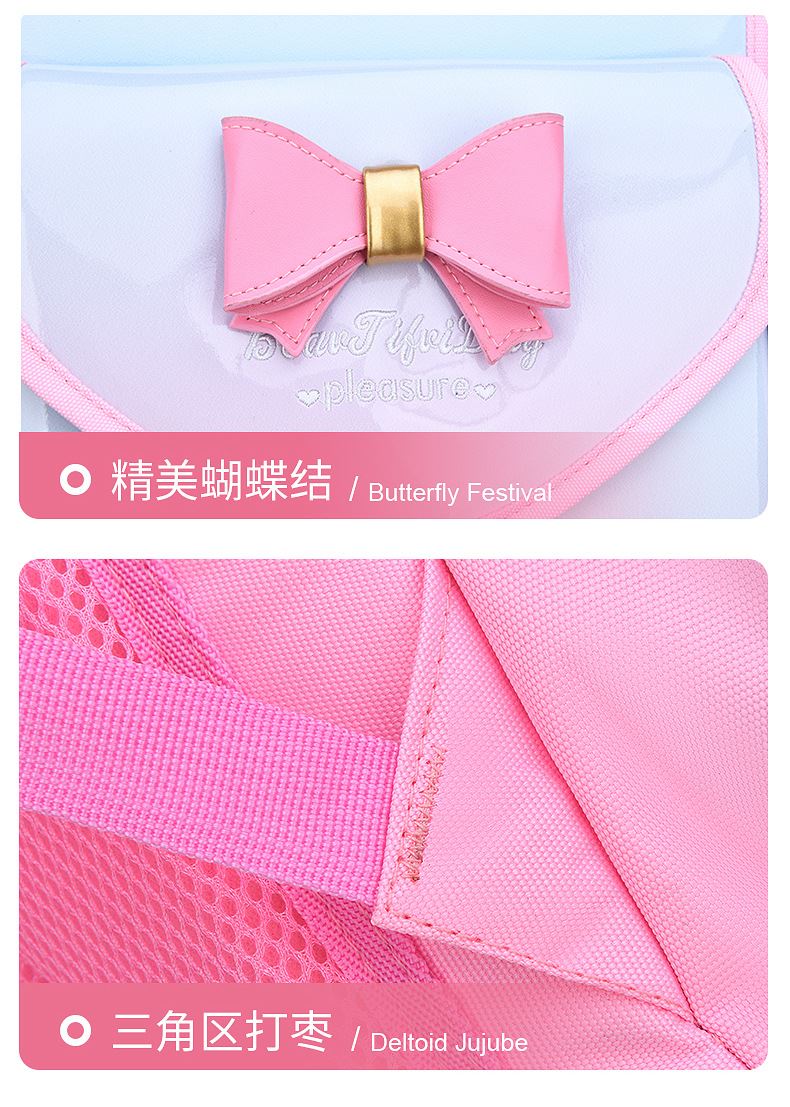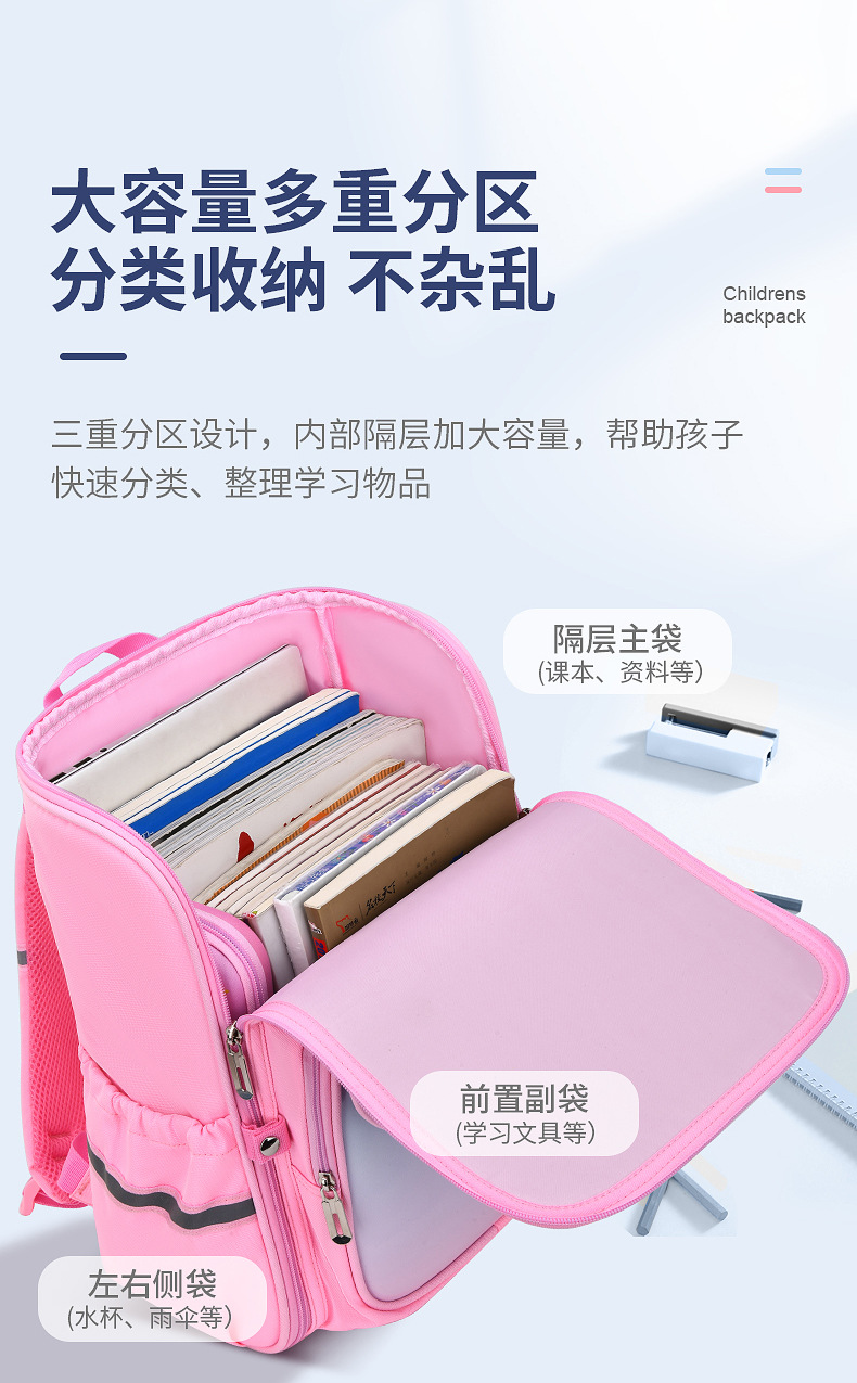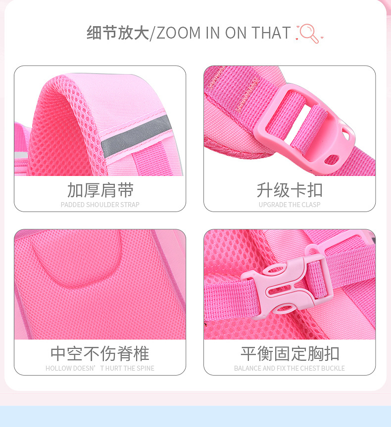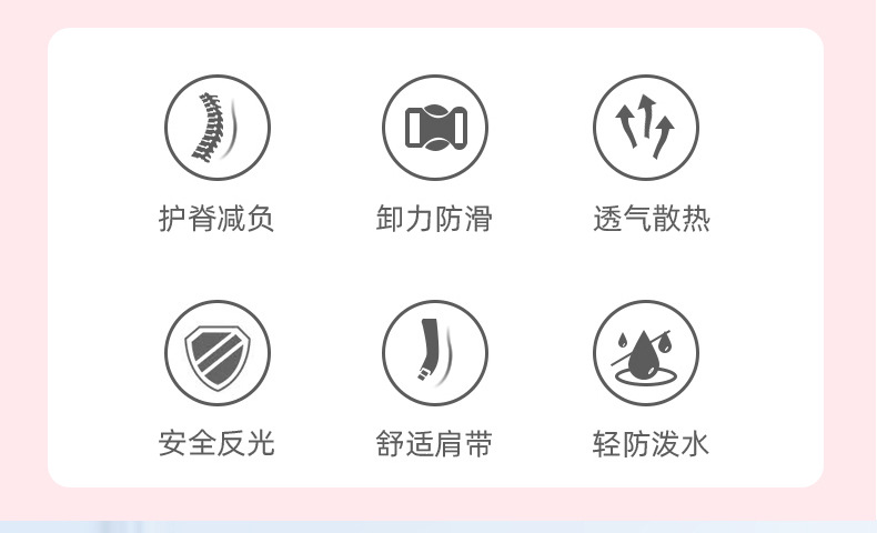 货号:SCH816 规格:40*28*16CM 颜色: 紫色/粉色/蓝色 ★主面料:防泼水尼龙布,里料:涤纶 ★双向金属拉片,方便拿取、放置物品 ★厚实的肩带设计,珍珠棉填充,减震透气 ★内部丰富的隔层,清晰放置各类日常物品 ★轻量化面料,立体加厚背垫,网孔透气 ★一体式开合,容易收纳,方便清洗 ★背带护脊,防滑脚垫,贴心反光条设计