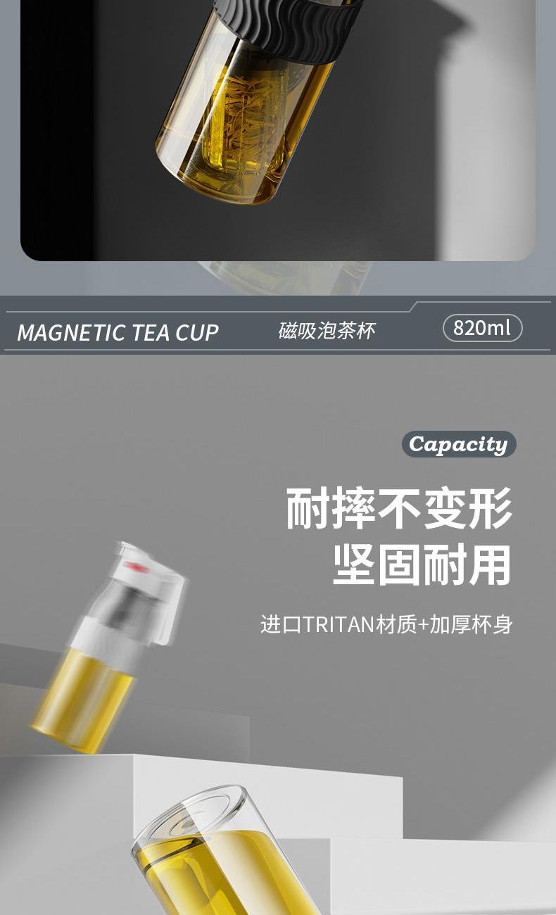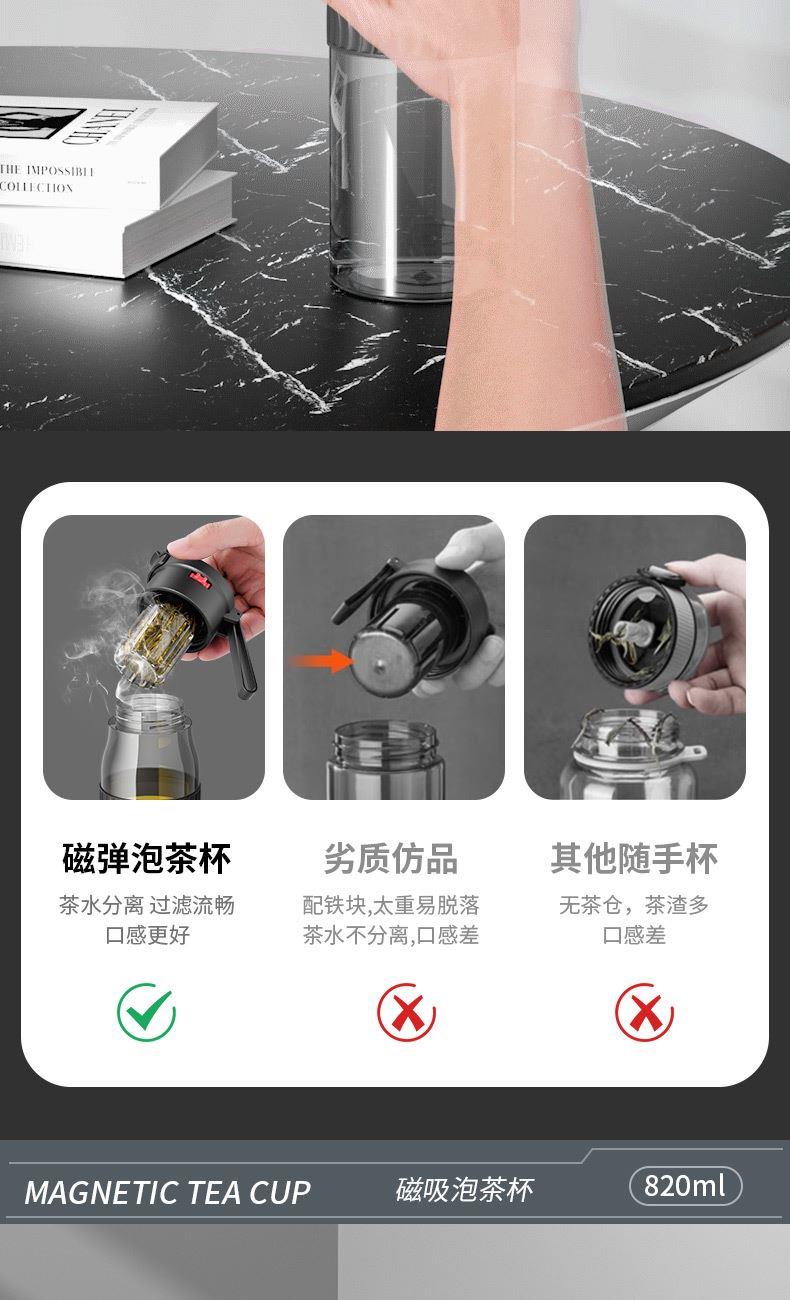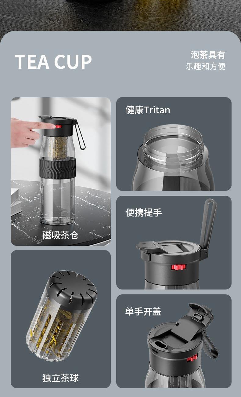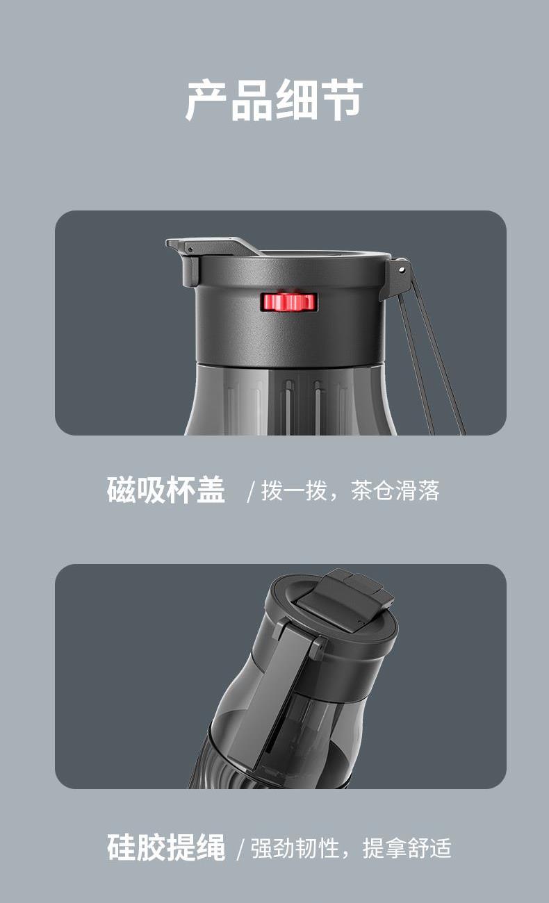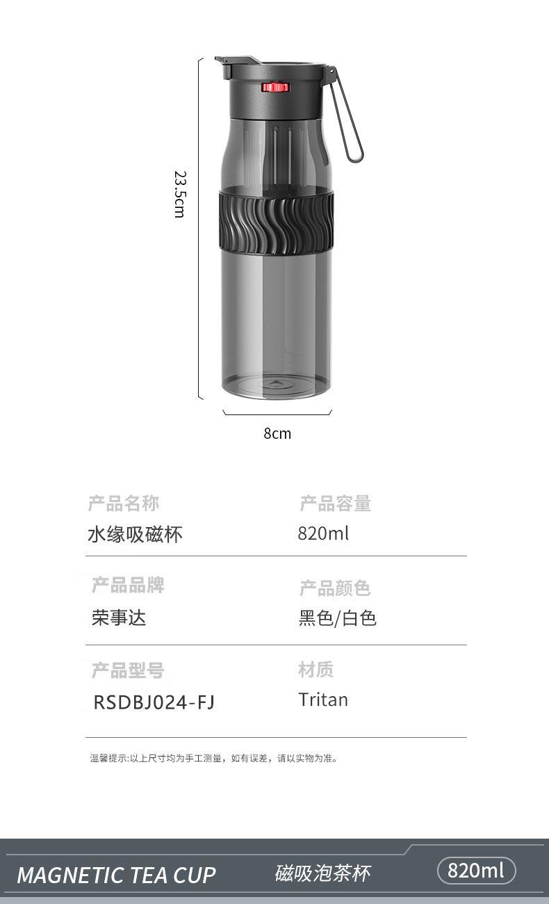 产品型号:RSDBJ024-FJ 产品容量:820ML 产品尺寸:高度23.5cm*底部直径8cm 产品材质:Tritan(食品接触用) 彩盒尺寸:8*8*27.1cm 外箱尺寸:49.5*41*57cm 进口Tritan材质,不含双酚A,不释放BPA母婴级别材质从根源呵护健康。装开水无异味,耐冷热温差-20℃-100℃,高温不变形,坚韧抗冲击性强,耐磨、耐磕碰; 独特设计,磁吸茶仓,磁铁与水0接触。一推一吸轻松控茶,单手开盖掀盖直饮,开盖幅度更大喝水从方便; 茶仓可轻松拆洗,不留死角残留;硅胶手提环舒适不勒手,轻松户外行。