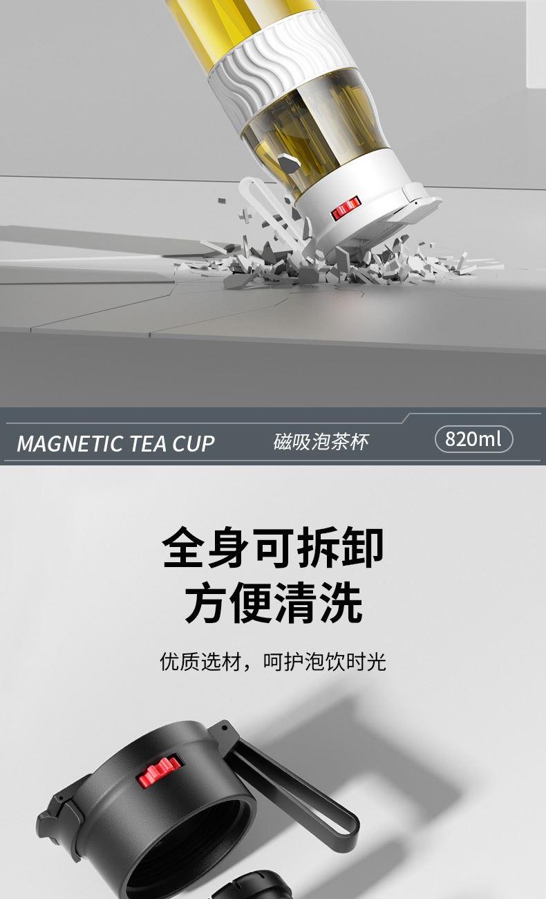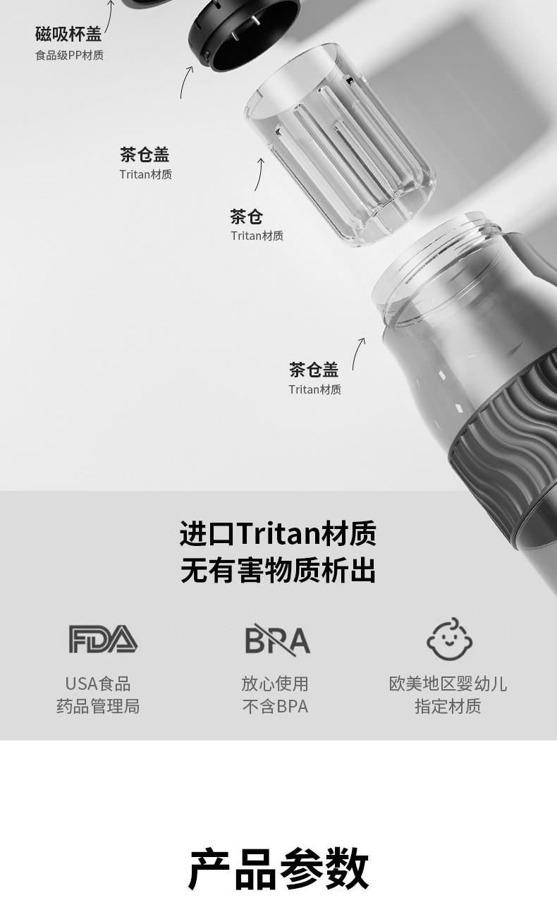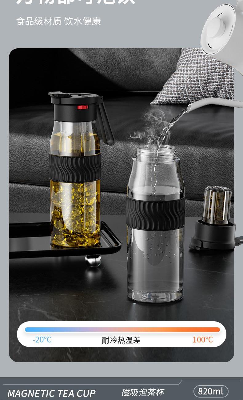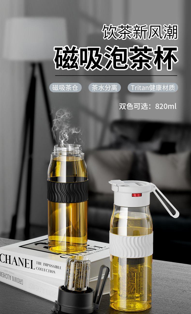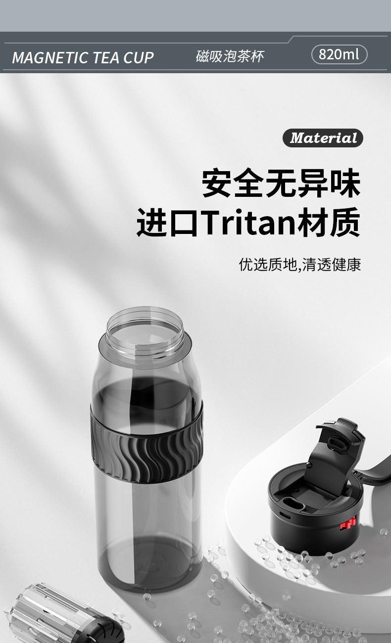 产品型号:RSDBJ024-FJ 产品容量:820ML 产品尺寸:高度23.5cm*底部直径8cm 产品材质:Tritan(食品接触用) 彩盒尺寸:8*8*27.1cm 外箱尺寸:49.5*41*57cm 进口Tritan材质,不含双酚A,不释放BPA母婴级别材质从根源呵护健康。装开水无异味,耐冷热温差-20℃-100℃,高温不变形,坚韧抗冲击性强,耐磨、耐磕碰; 独特设计,磁吸茶仓,磁铁与水0接触。一推一吸轻松控茶,单手开盖掀盖直饮,开盖幅度更大喝水从方便; 茶仓可轻松拆洗,不留死角残留;硅胶手提环舒适不勒手,轻松户外行。