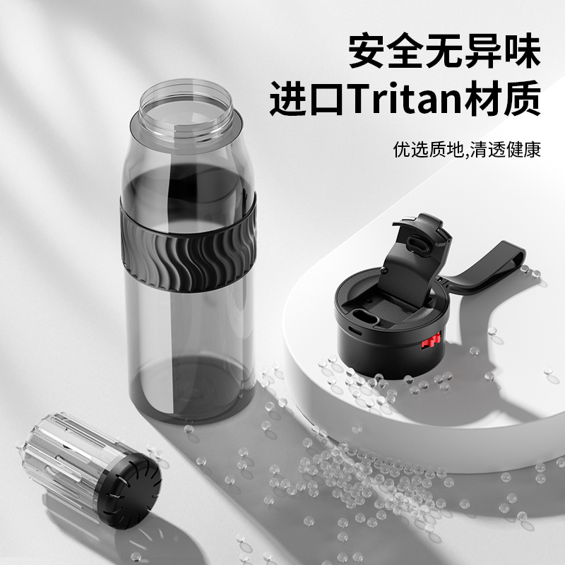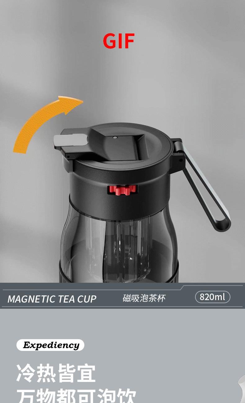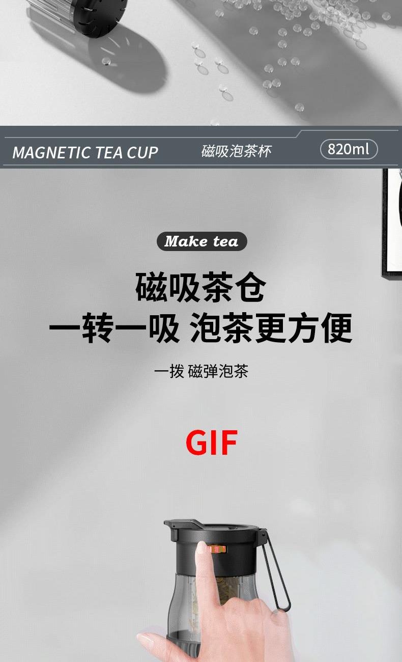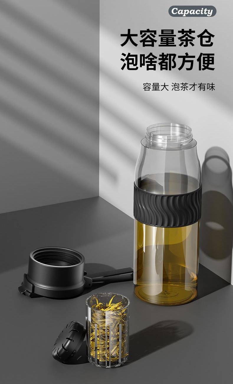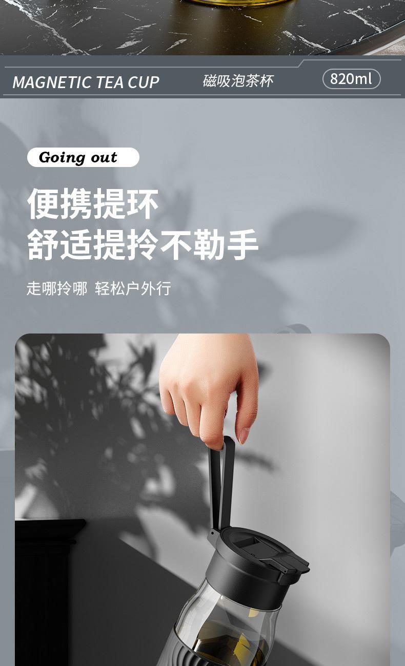 产品型号:RSDBJ024-FJ 产品容量:820ML 产品尺寸:高度23.5cm*底部直径8cm 产品材质:Tritan(食品接触用) 彩盒尺寸:8*8*27.1cm 外箱尺寸:49.5*41*57cm 进口Tritan材质,不含双酚A,不释放BPA母婴级别材质从根源呵护健康。装开水无异味,耐冷热温差-20℃-100℃,高温不变形,坚韧抗冲击性强,耐磨、耐磕碰; 独特设计,磁吸茶仓,磁铁与水0接触。一推一吸轻松控茶,单手开盖掀盖直饮,开盖幅度更大喝水从方便; 茶仓可轻松拆洗,不留死角残留;硅胶手提环舒适不勒手,轻松户外行。
