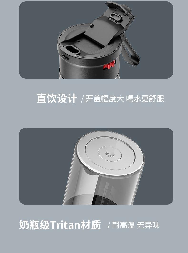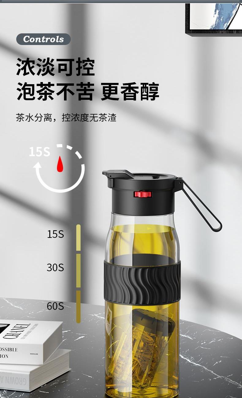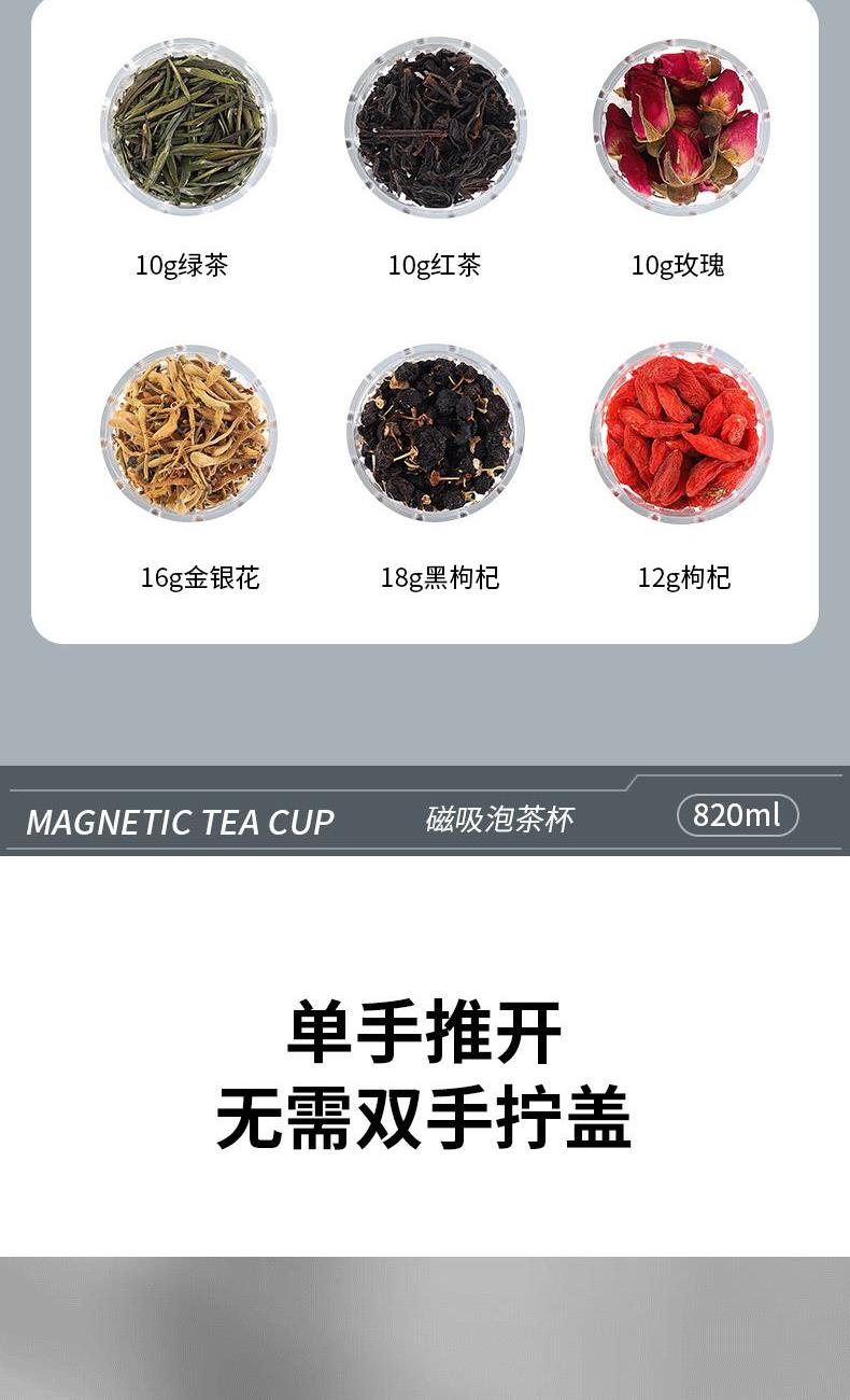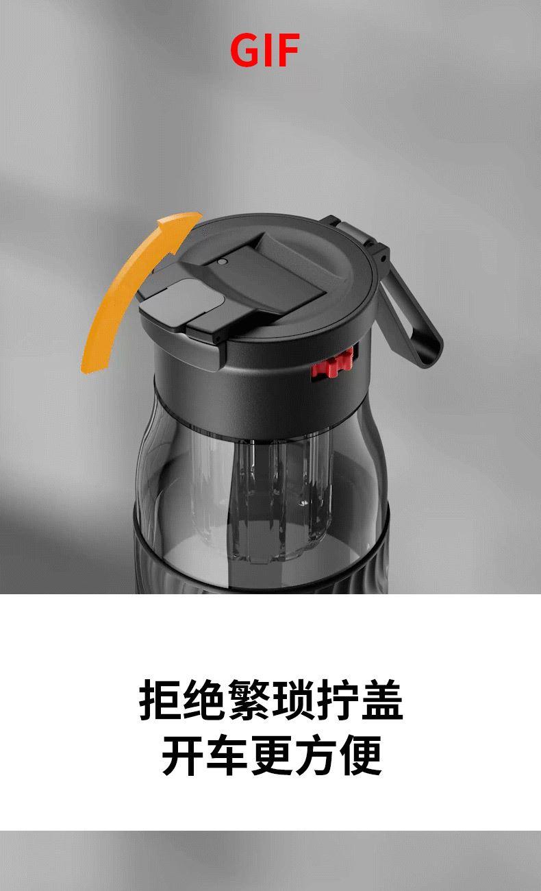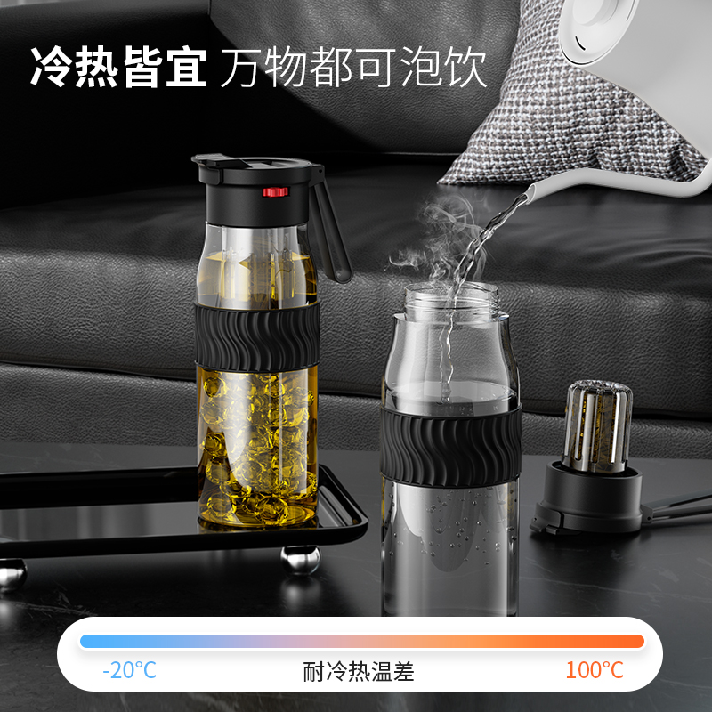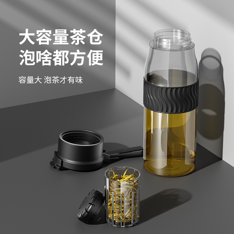 产品型号:RSDBJ024-FJ 产品容量:820ML 产品尺寸:高度23.5cm*底部直径8cm 产品材质:Tritan(食品接触用) 彩盒尺寸:8*8*27.1cm 外箱尺寸:49.5*41*57cm 进口Tritan材质,不含双酚A,不释放BPA母婴级别材质从根源呵护健康。装开水无异味,耐冷热温差-20℃-100℃,高温不变形,坚韧抗冲击性强,耐磨、耐磕碰; 独特设计,磁吸茶仓,磁铁与水0接触。一推一吸轻松控茶,单手开盖掀盖直饮,开盖幅度更大喝水从方便; 茶仓可轻松拆洗,不留死角残留;硅胶手提环舒适不勒手,轻松户外行。