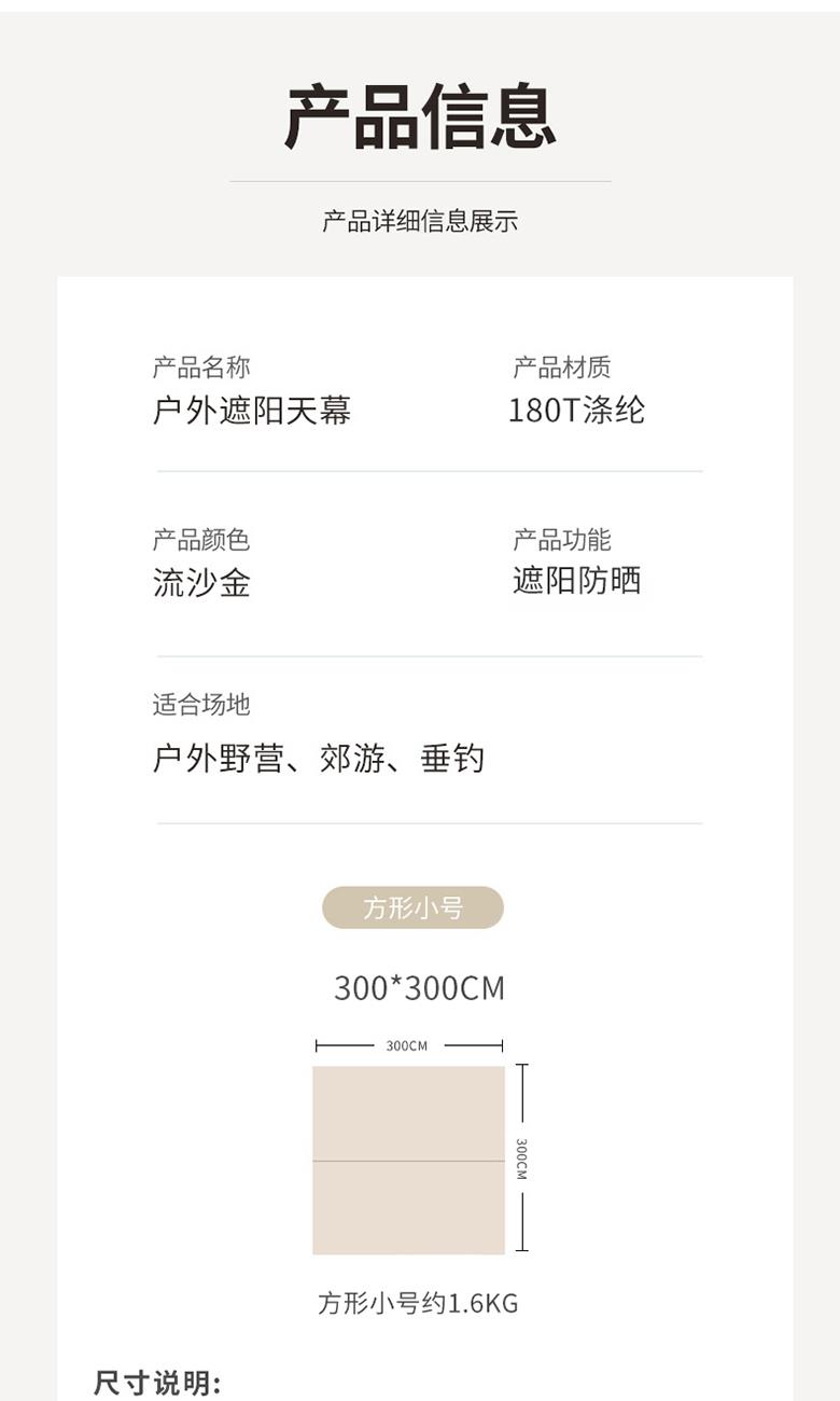桌椅材质:600D双层牛津布 +镀锌钢管 天幕材质:210D防水牛津布 卡式炉烤盘材质:铁 桌子尺寸:51*50*53cm 椅子尺寸:65*49*49cm 天幕尺寸:3*3m 卡式炉尺寸:26*8.2*34cm 烤盘尺寸:直径28cm 商品重量:约11kg