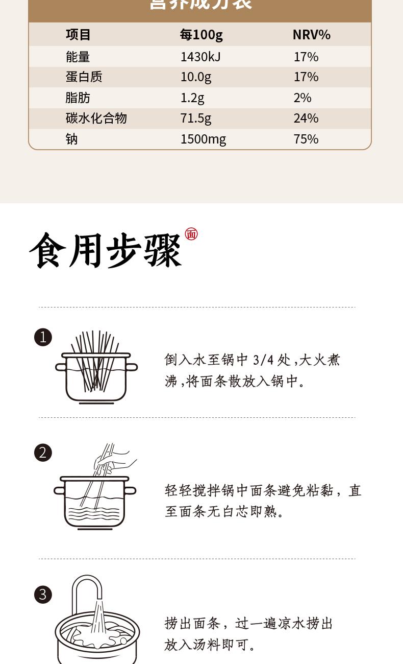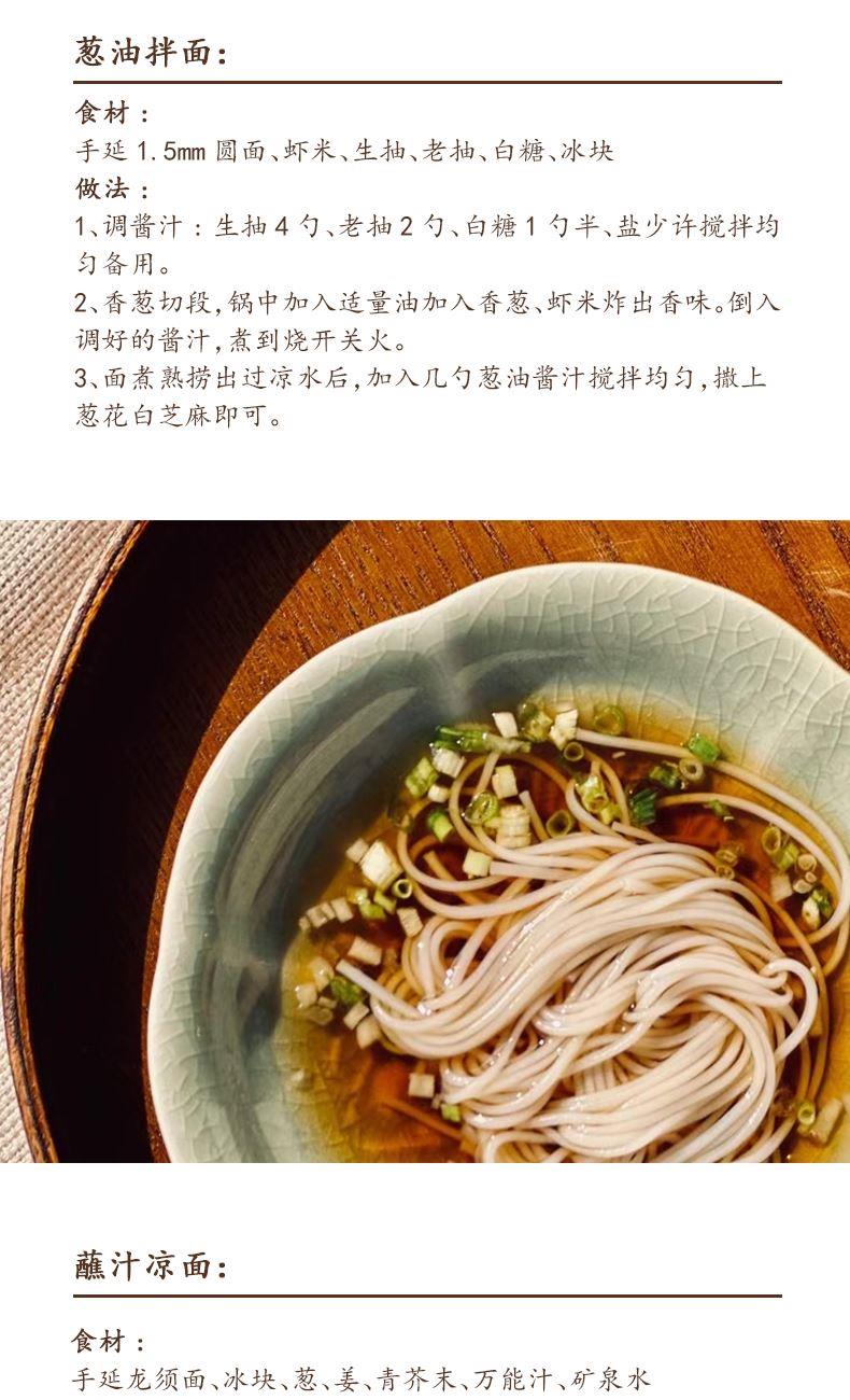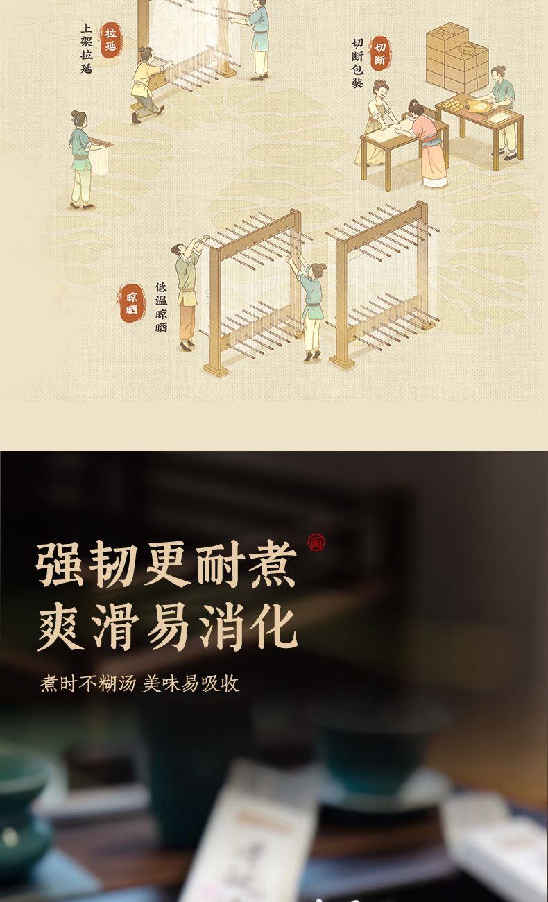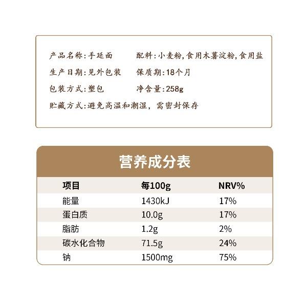 产品规格: 手延面(中宽3.0mm) 258g*3 1、二十道古法,六醒六抻更弹韧; 2、多熟成慢发酵,入味易熟好吸收 3、甄选进口澳麦麦源,口感弹韧,丝滑如稠 4、科学加持传统工艺,严格质控,美味安心享用