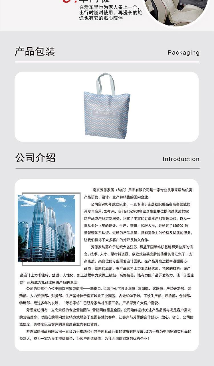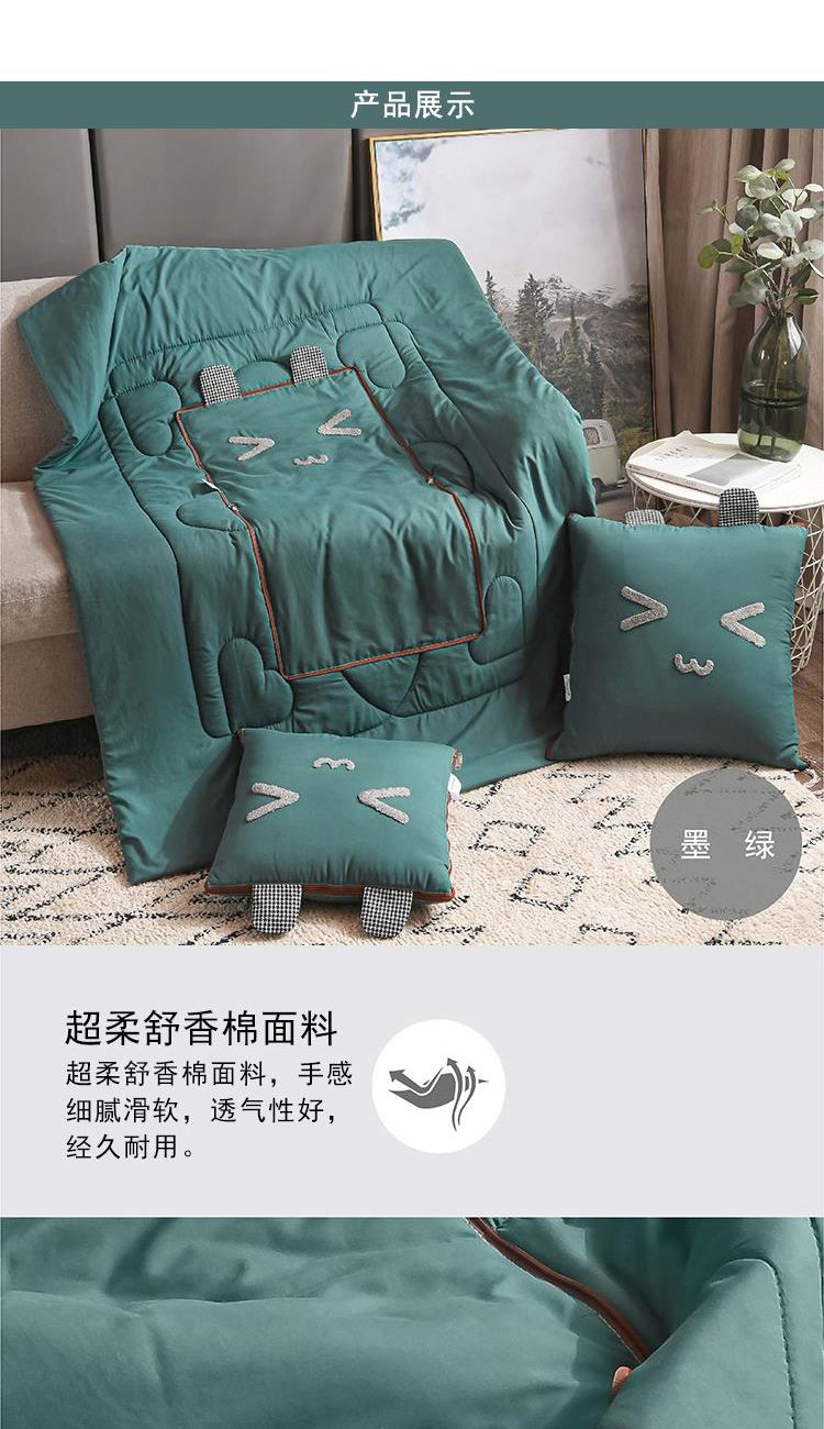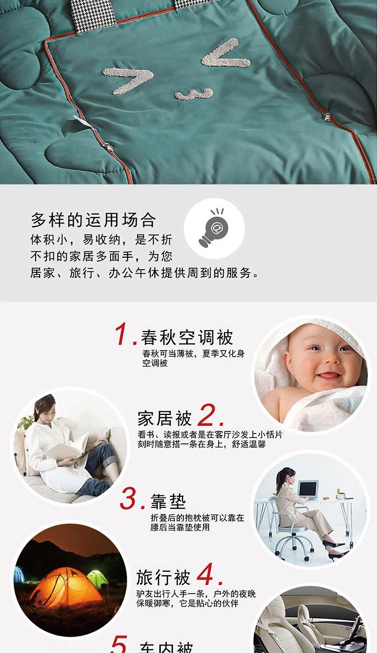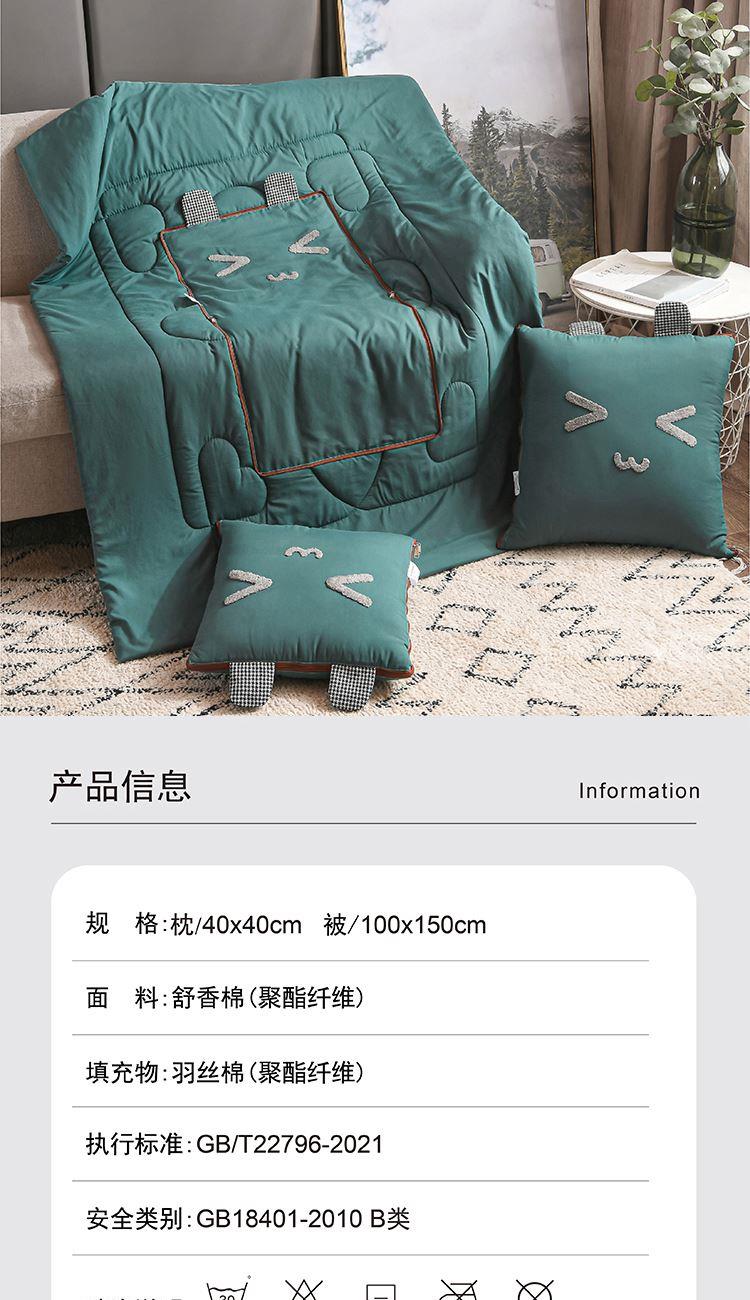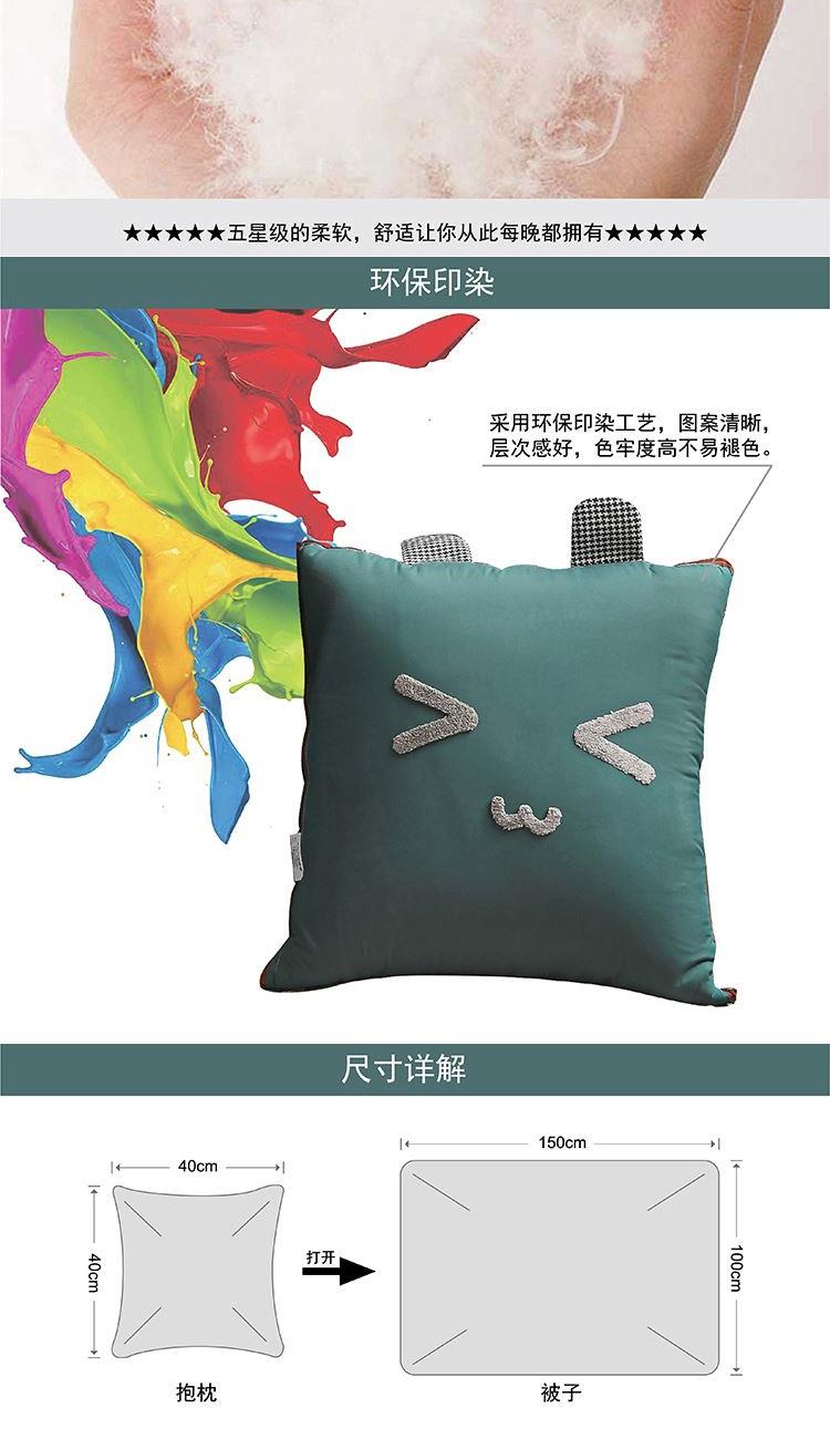 枕:40×40cm 被:100×150cm 【面 料】舒香棉(聚酯纤维) 【填充物】羽丝棉(聚酯纤维) 1.韩香棉面料,手感细腻滑软,填充优质羽丝棉,蓬松饱满; 2.独特时尚趣味设计,萌感实足; 3.一物多用,收纳是抱枕,打开是被子,是居家、旅行、办公午休的好帮手; 4.可定制客户LOGO,凸显效果;