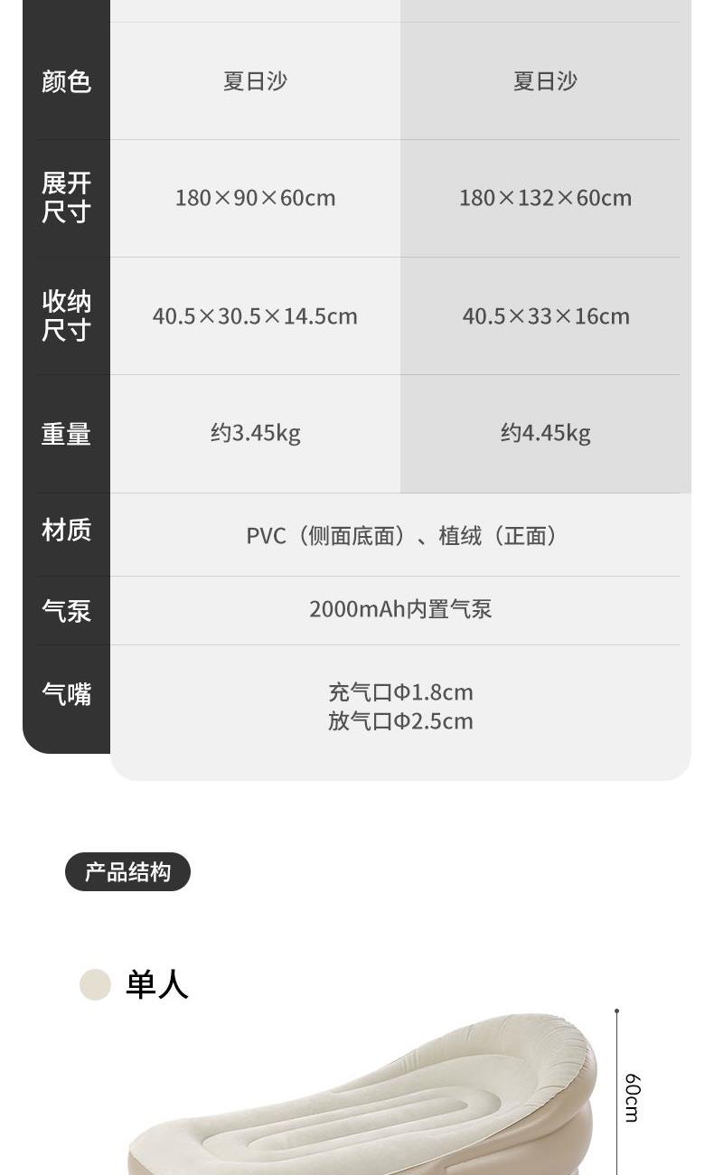 款式:单人 颜色:夏日沙 展开尺寸:180x90x60cm 收纳尺寸:40.5x30.5x14.5cm 重量:约3.45kg