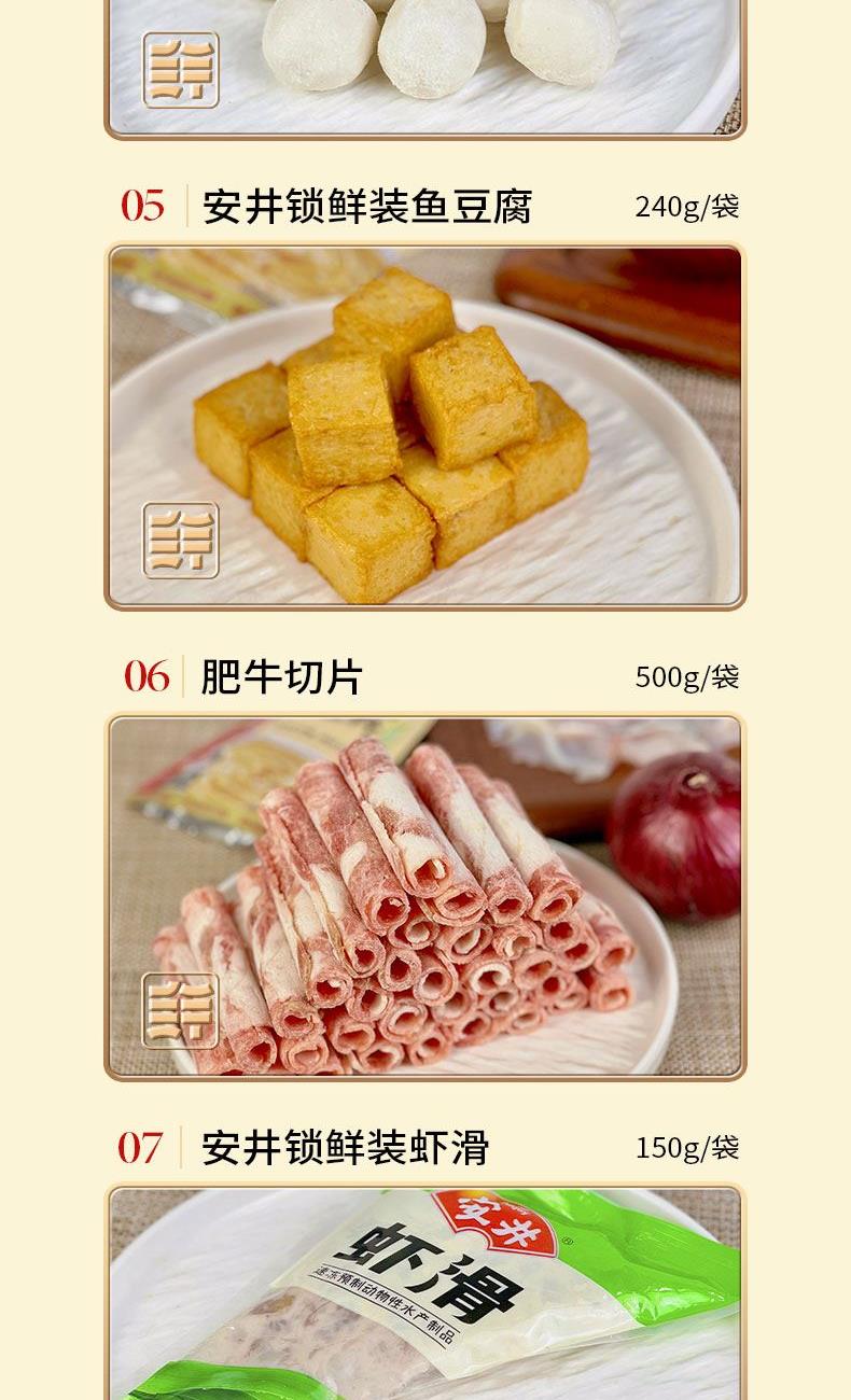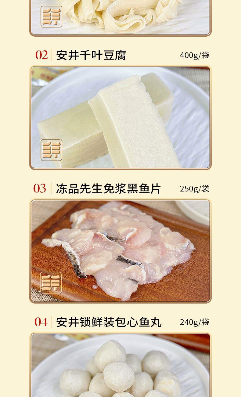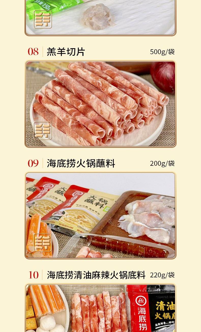 冻品先生30秒筋道面100g/袋 安井千叶豆腐400g/袋 安井冻品先生免浆黑鱼片250g/袋 安井锁鲜装包心鱼丸240g/袋 安井锁鲜装鱼豆腐240g/袋 肥牛切片200g/袋 安井锁鲜装虾滑150g/袋 羔羊切片500g/袋 海底捞火锅蘸料(原味)120g/袋 海底捞火锅蘸料(原味)120g/袋 海底捞清油麻辣火锅底料220g/袋 2540g