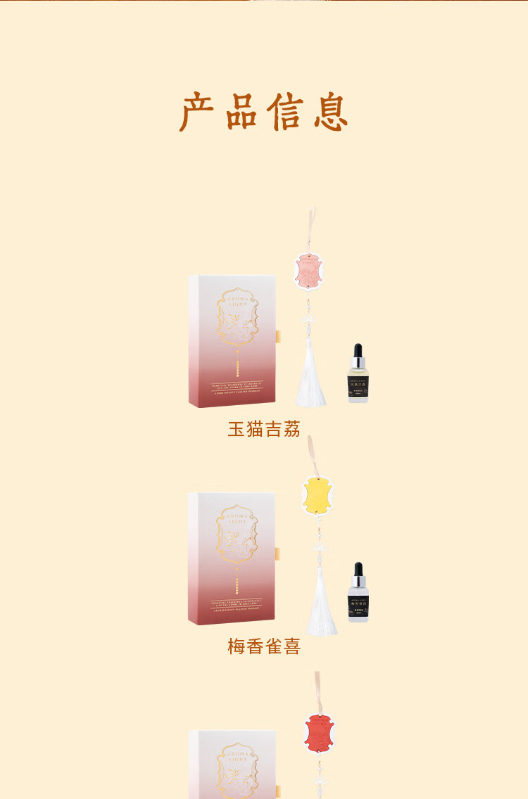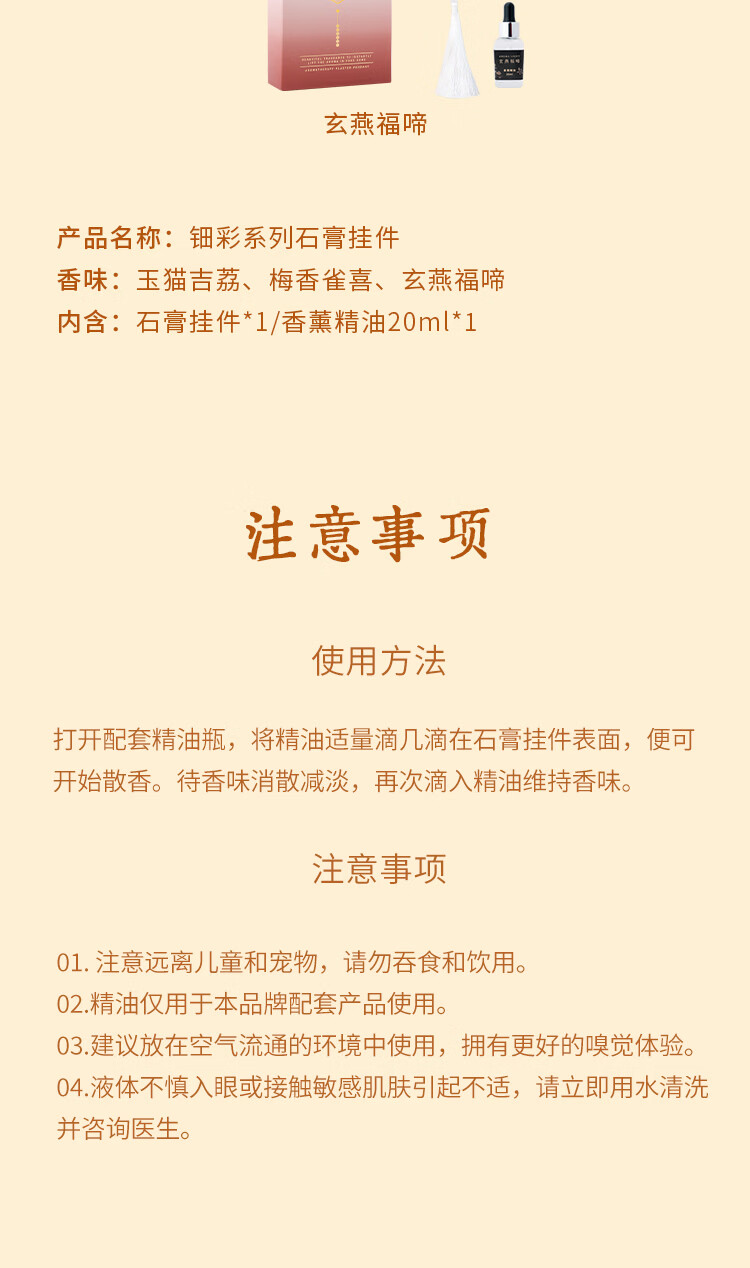 香味:玄燕福啼 香调:前调冬青香脂,中调肉桂丁香,后调冷杉雪松橡木苔 香味:梅香雀喜 香调:前调甜橙杏仁饼,中调梅花茉莉薄荷,后调麝香 香味:玉猫吉荔 香调:前调荔枝黑加仑香柠檬,中调玫瑰茉莉紫罗兰,后调雪松香根草广藿香 配置:石膏挂件*1/香薰精油20ml*1