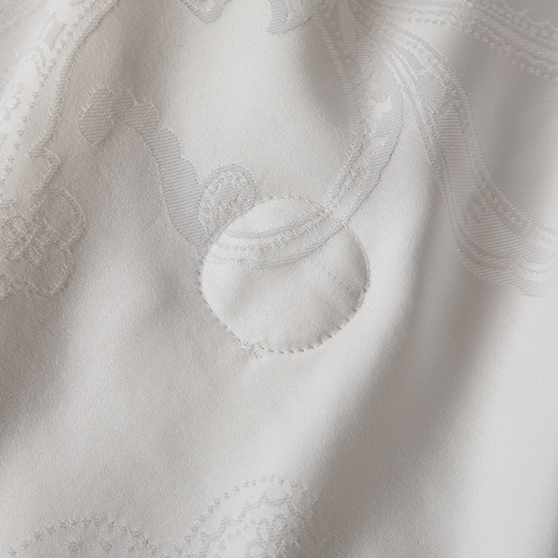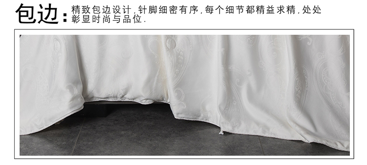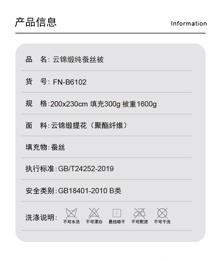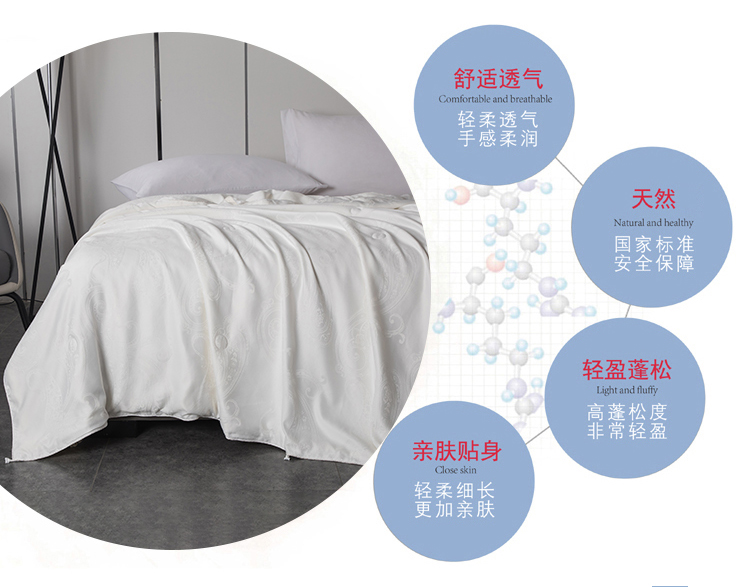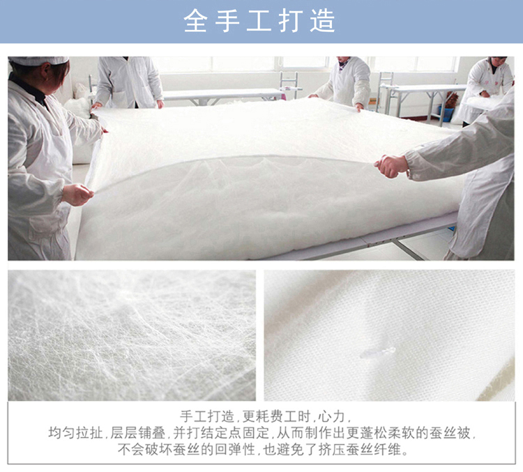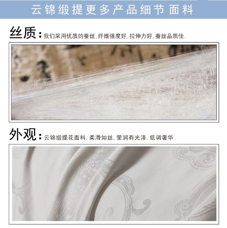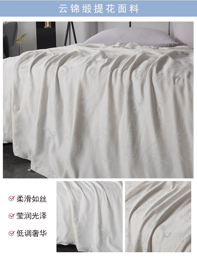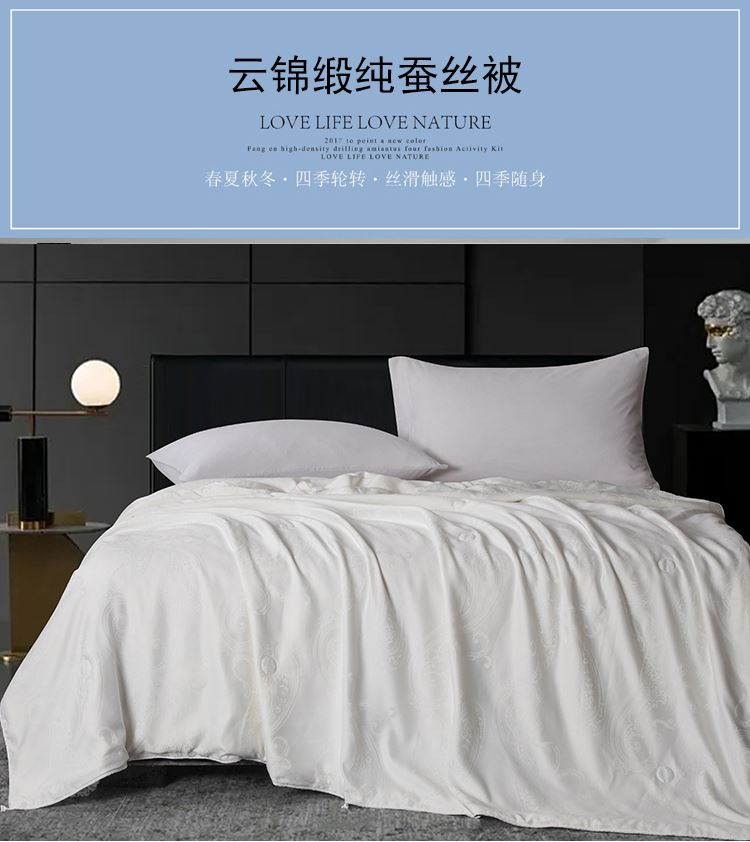 尺寸:200x230cm 填充物:300g 被重:1600g 【面 料】云锦缎提花(聚酯纤维) 【填充物】纯蚕丝 产品特点: 1.优质纯蚕丝填充,含有丰富丝素蛋白,多种氨基酸,,洁净舒适,尽享睡眠spa; 2.云锦缎提花面料,柔滑如丝,莹润有光泽,低调奢华; 3.纯蚕丝,无添加,更环保,蓬松轻柔,贴身抱合力强。
