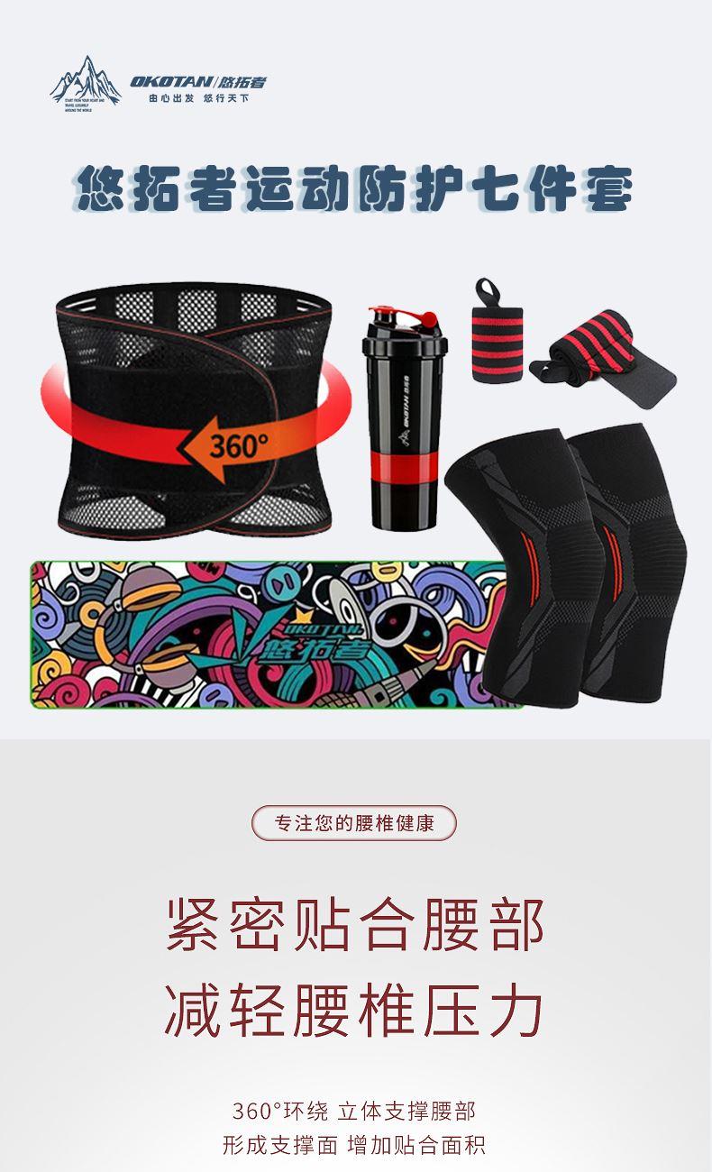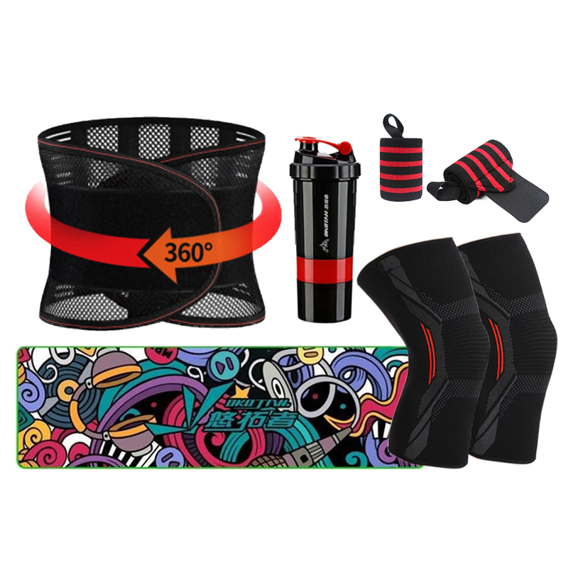 配置:运动透气护腰X1+运动护膝X1副+运动护腕X1对+运动毛巾X1 +运动多用水壶X1 产品材质:护腰护膝护腕针织弹力面料,水杯进口PP,运动毛巾冰丝面料 产品尺寸:均码【护腰默认L码,可选尺码】 颜色:图片色 产品卖点: 1.运动护腰透气,舒适不闷热,腰部支撑,保护腰椎,弹力织带,支撑钢板,双重固定防护。 2.护膝:戶外锻炼·骑行·打篮球·等运动种保护关节增强腿部的核心力量。 3.护腕:卧推硬拉,稳固支撑,手腕加压,稳固保护手腕等健身专业防护。 4. 冷感毛巾,速干冰丝面料。 5.三层运动摇摇杯,直饮杯加两层多用储物仓,方便便携。