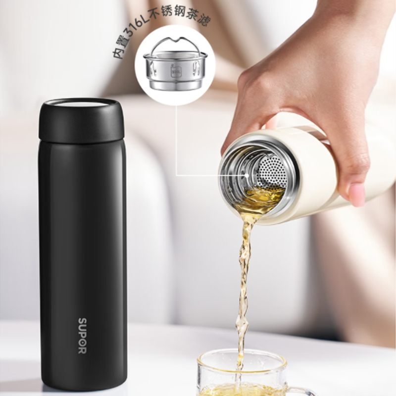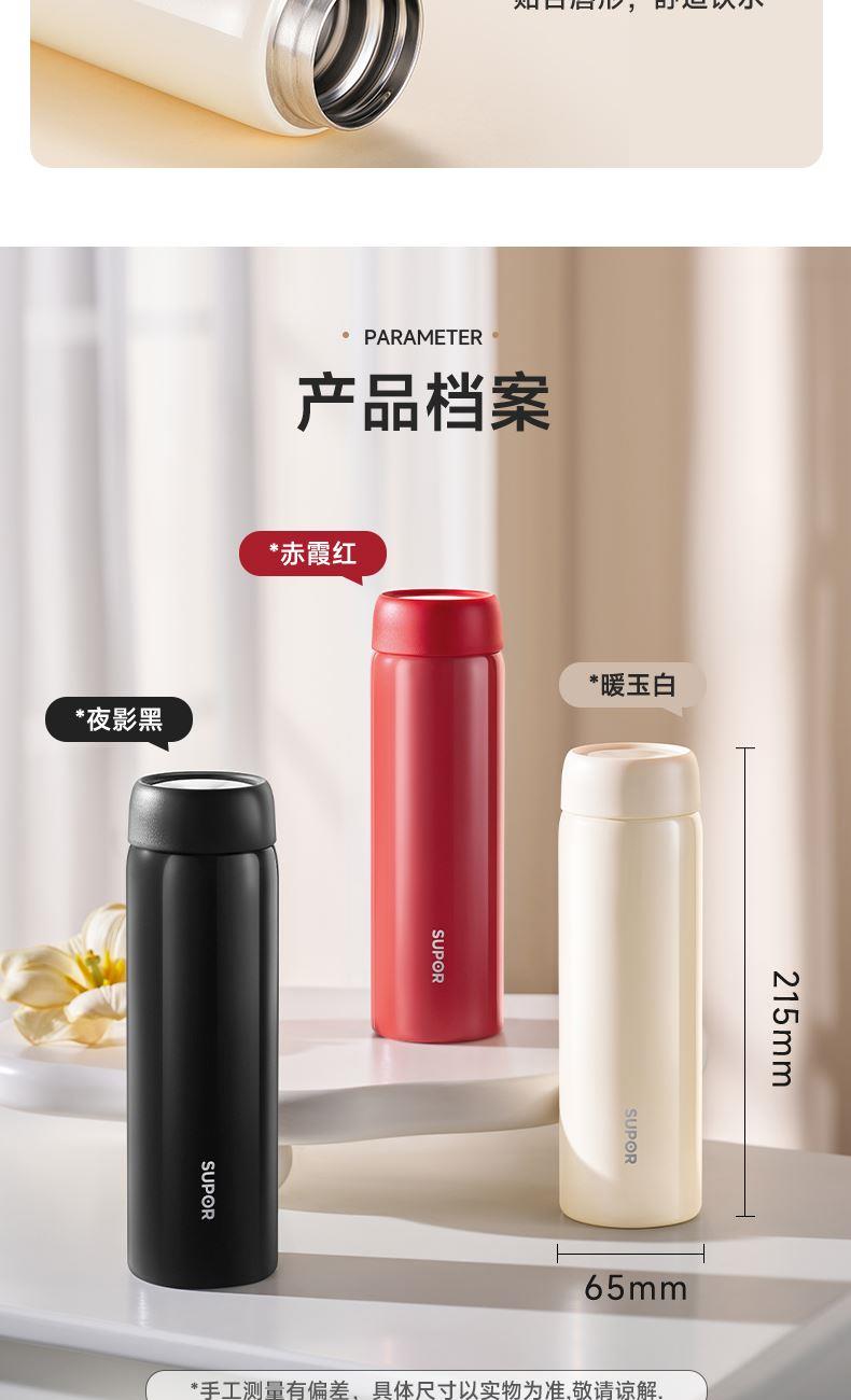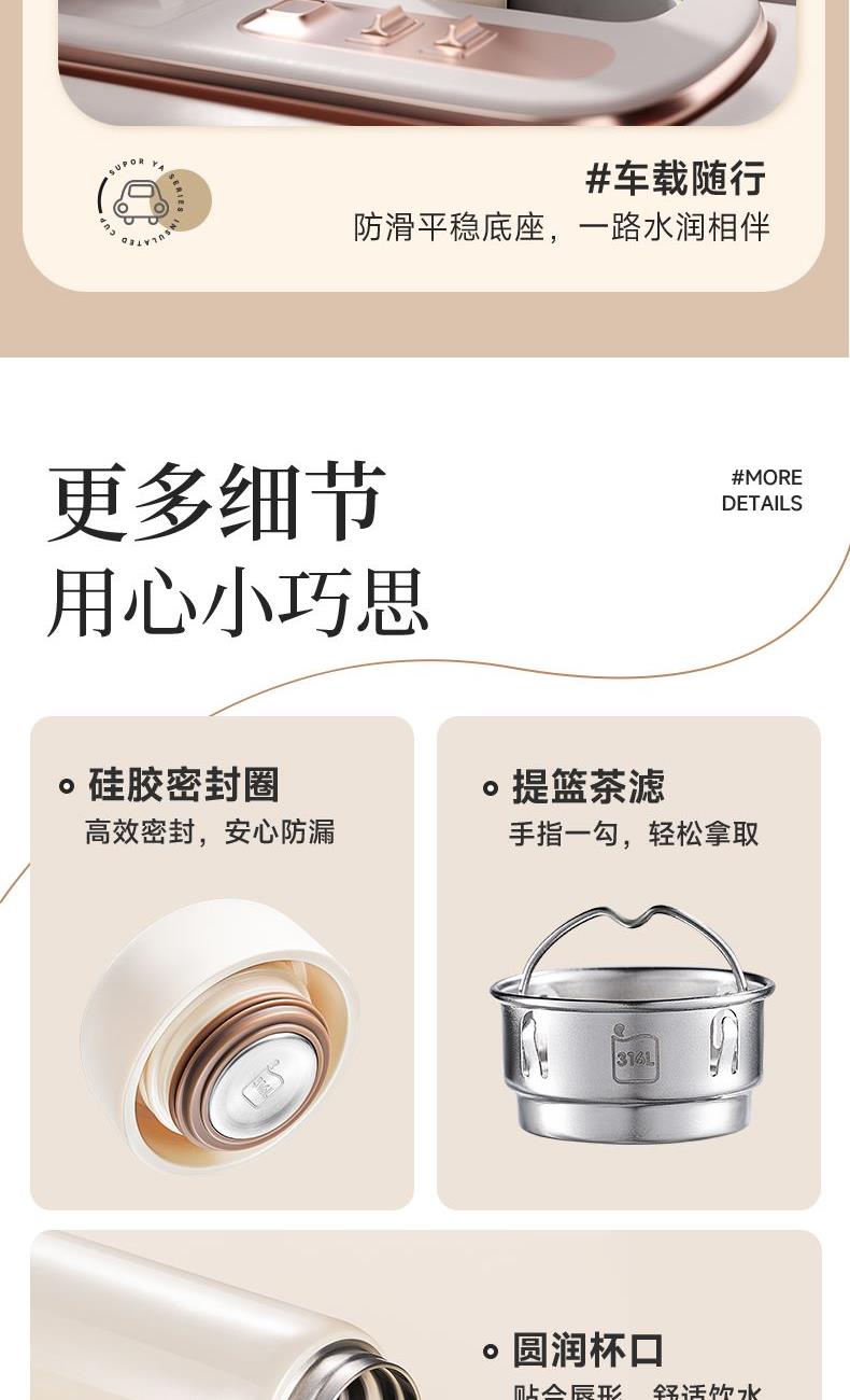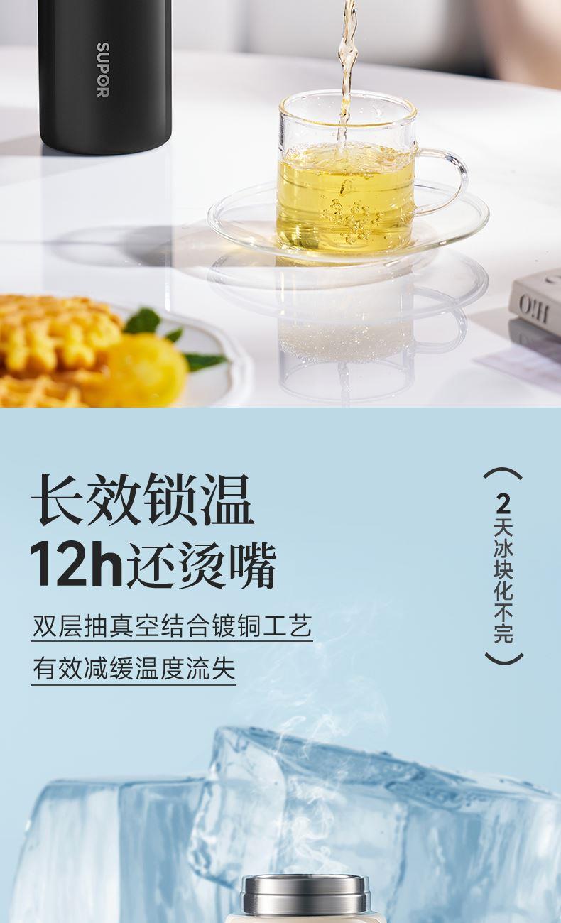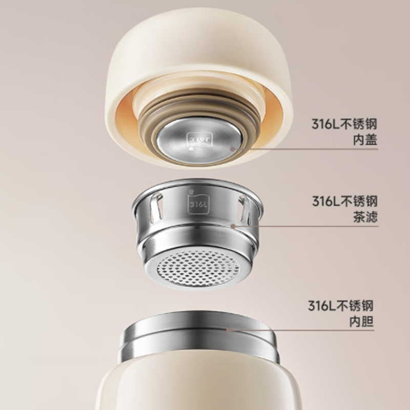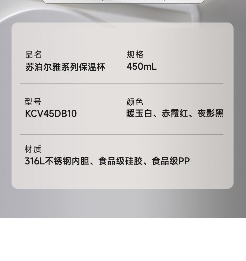 规格参数 产品说明 容量:450ml 材质:316L 功能卖点 1、316L不锈钢内胆,饮水(钢)好• 不锈钢,安全可靠,适 合各种饮品的冲泡 2、杯盖内置硅胶密封圈,密封防 撒漏 3、精巧小直径,入包随行无压力 4、2天冰块还不化*炎夏冰饮供应机,畅快度夏