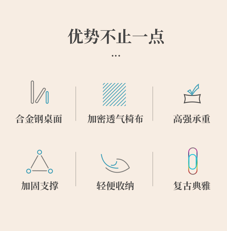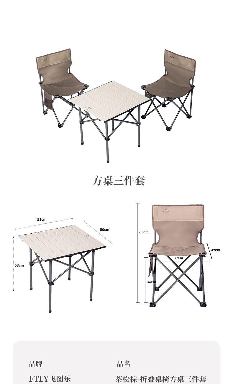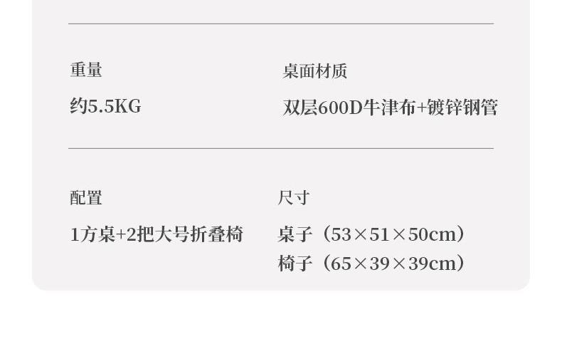材质:600D双层牛津布 +镀锌合计钢管 商品颜色:茶松棕 商品规格:三件套(一桌两椅)/五件套(一桌四椅) 桌子尺寸:51*50*53cm 椅子尺寸:65*39*39cm 商品重量:5.6kg/8kg 商品承重:120kg 1、升级合金钢磨砂桌面,防水耐腐蚀; 2、加大号便携折叠椅,久坐不累; 3、一桌多椅,折叠收纳,不占空间 ; 4、高承重,高负荷,舒适享受; 5、轻奢配色,贴近自然 需要同款三件套联系我司业务