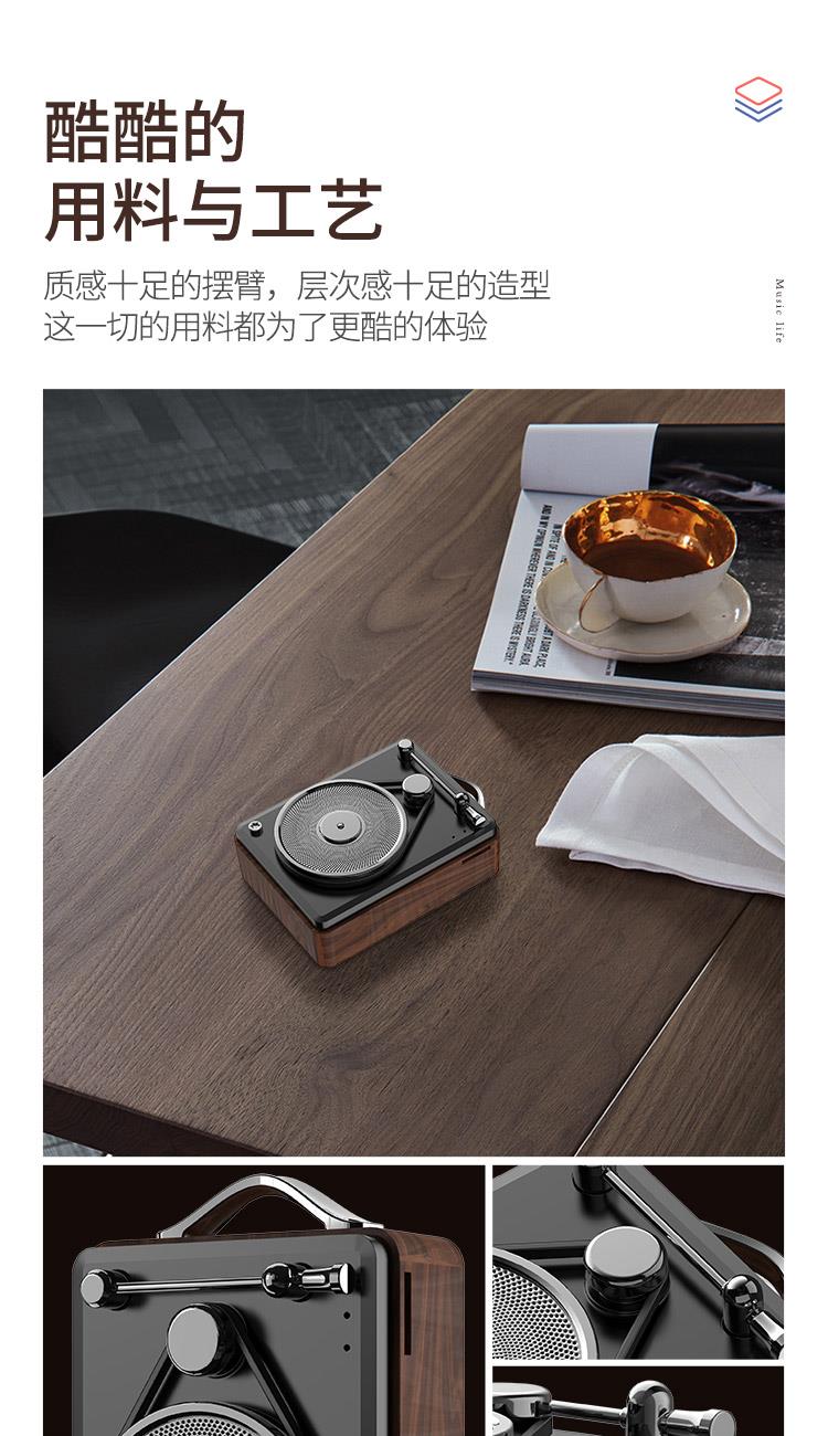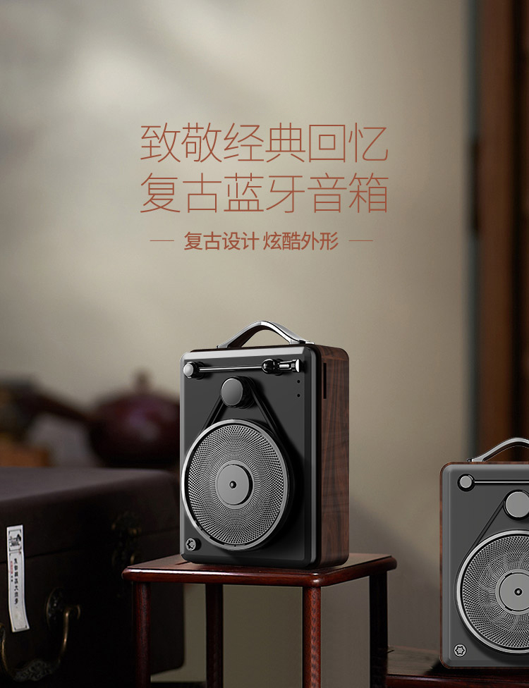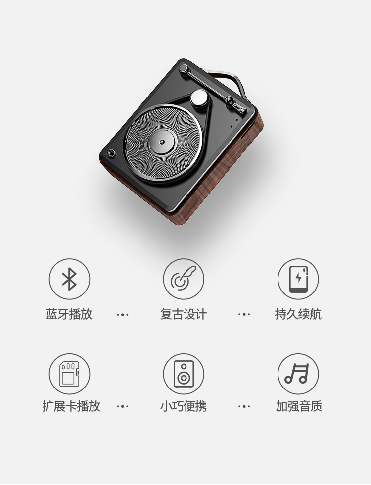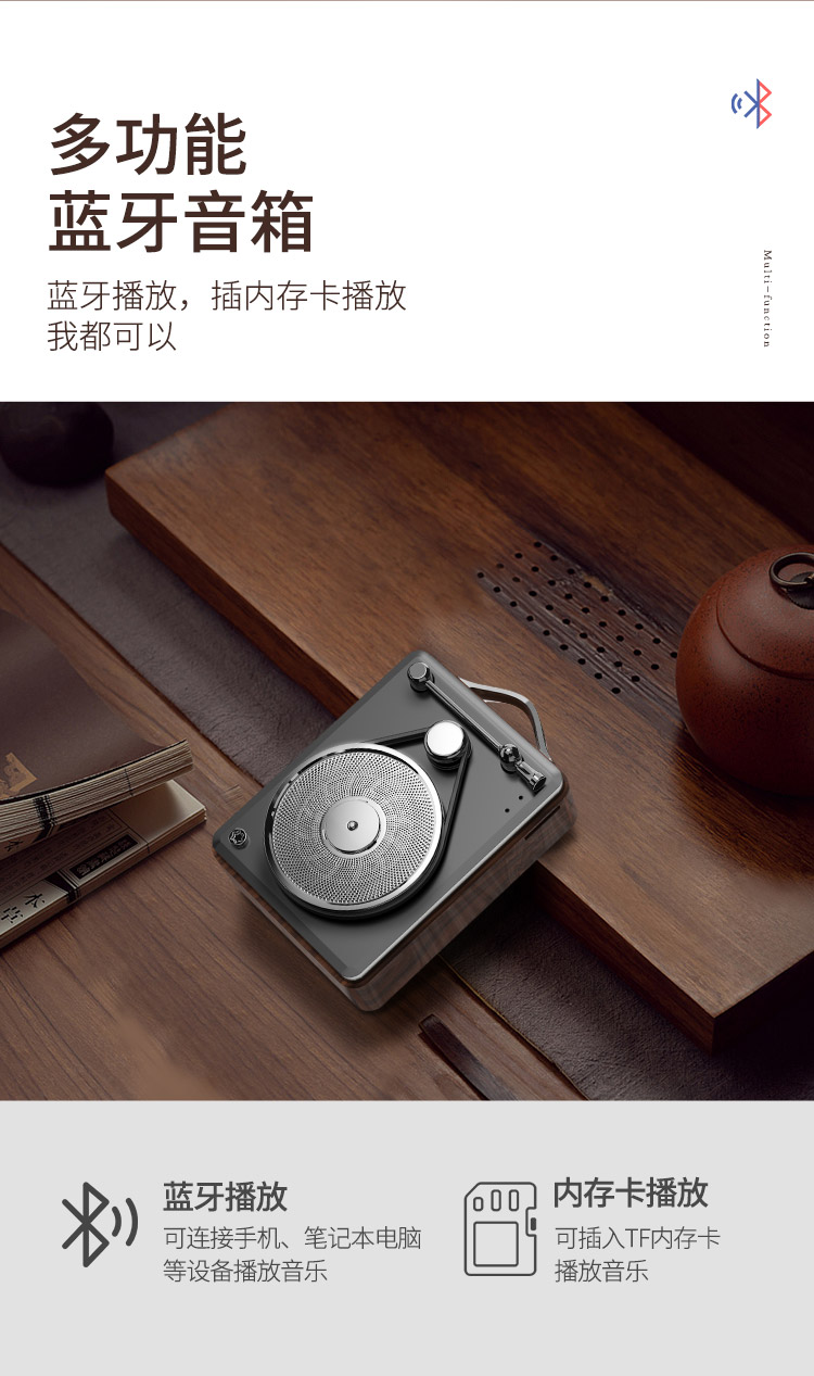 经典复古唱片机蓝牙音响 颜色:木纹色 材质:ABS 尺寸:115*73*64mm 包装:彩盒包装 【功能特点】: 经典复古,岁月留声 经典旋钮控制音量大小 蓝牙连接/插卡播放/USB播放/音频线 5.4蓝牙芯片连接稳定