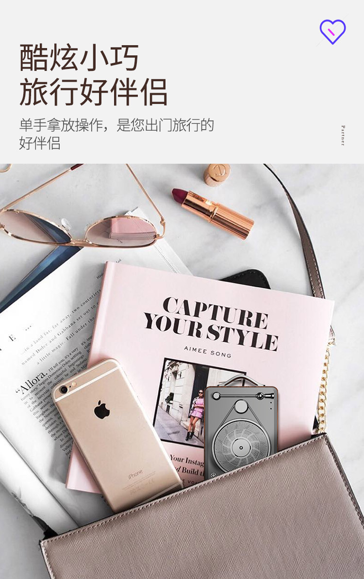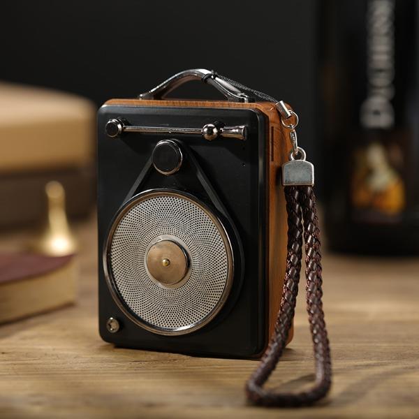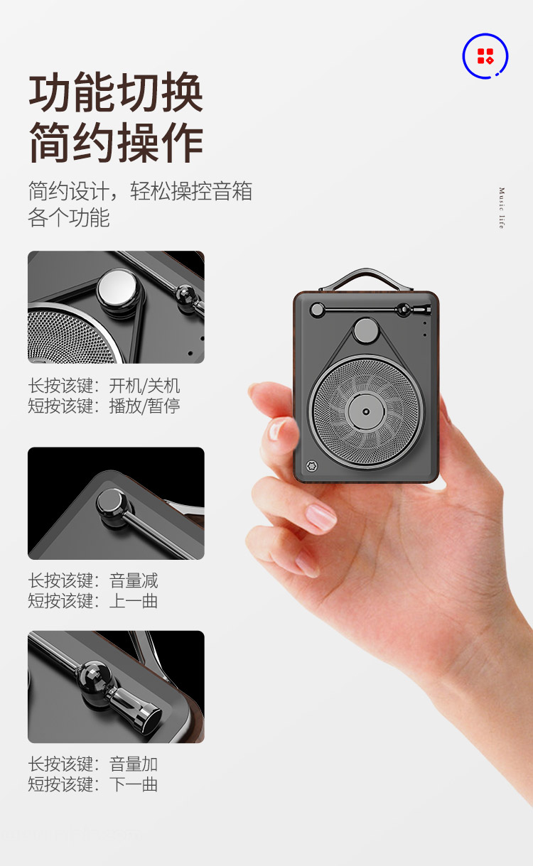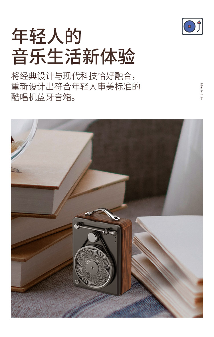 经典复古唱片机蓝牙音响 颜色:木纹色 材质:ABS 尺寸:115*73*64mm 包装:彩盒包装 【功能特点】: 经典复古,岁月留声 经典旋钮控制音量大小 蓝牙连接/插卡播放/USB播放/音频线 5.4蓝牙芯片连接稳定