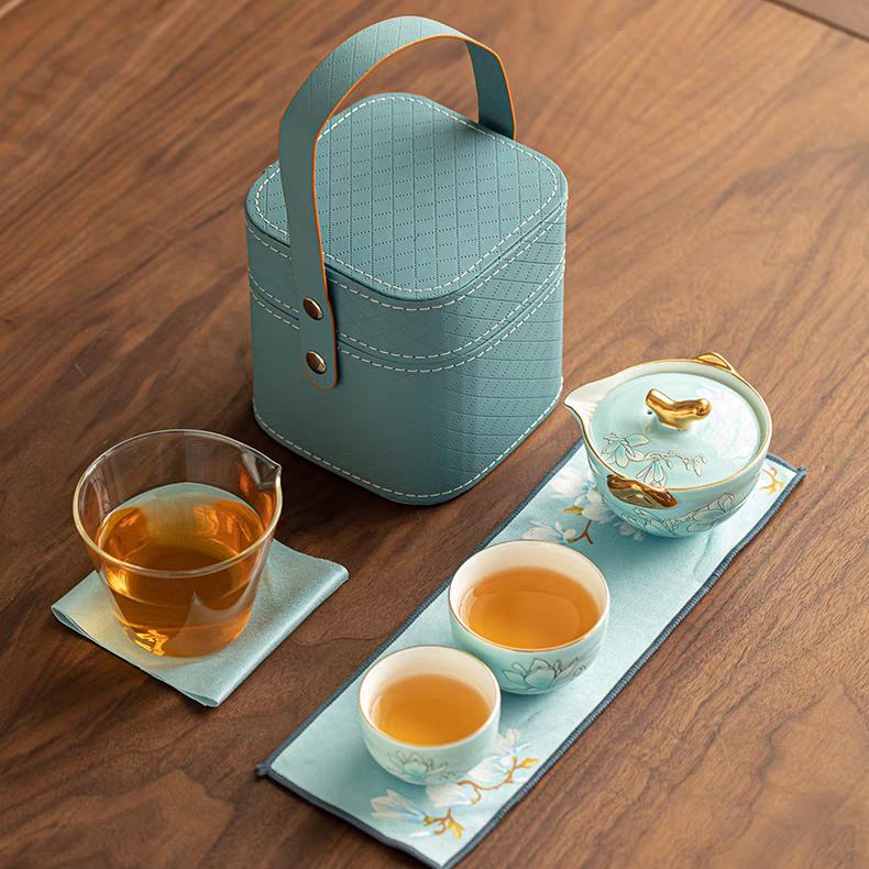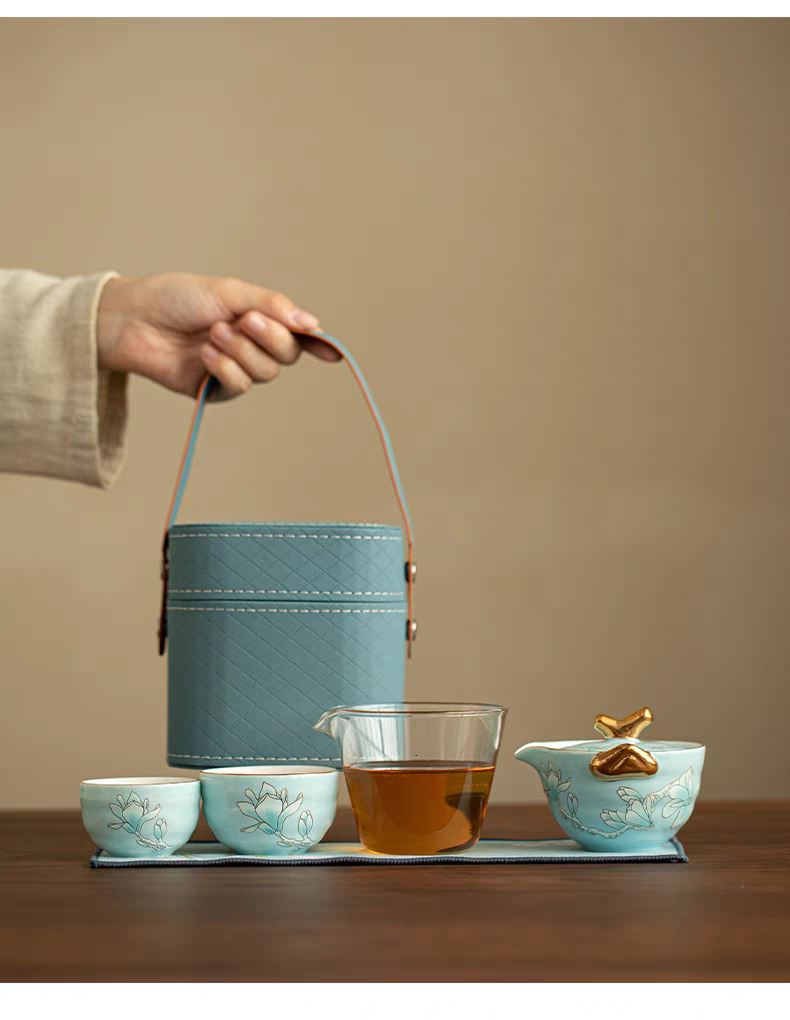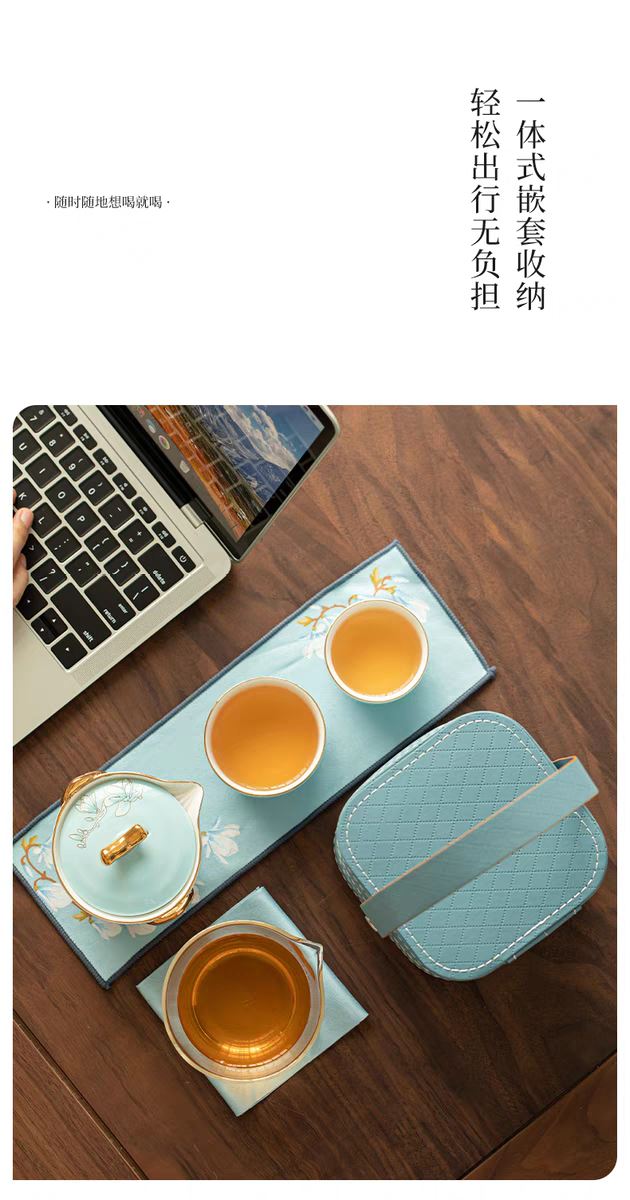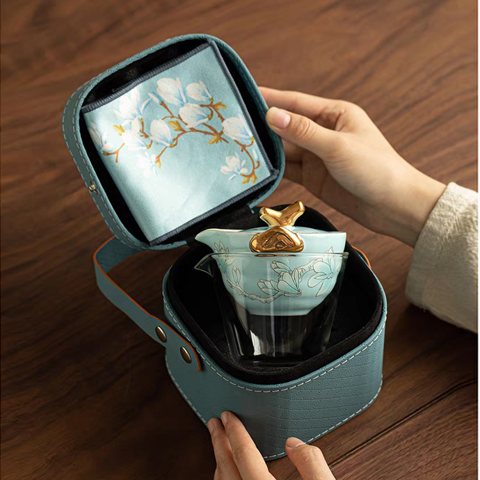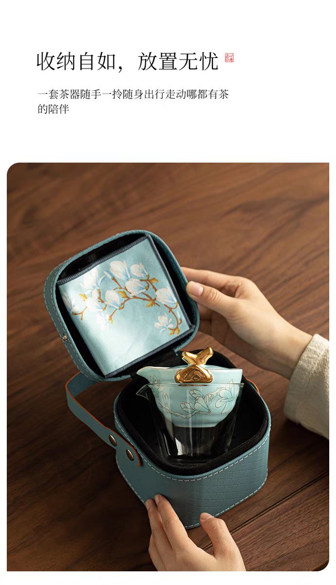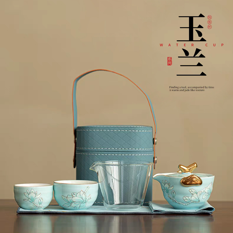 尾桥下窑鎏金枝上玉兰旅行茶具套装一壶二杯便携功夫泡茶套装