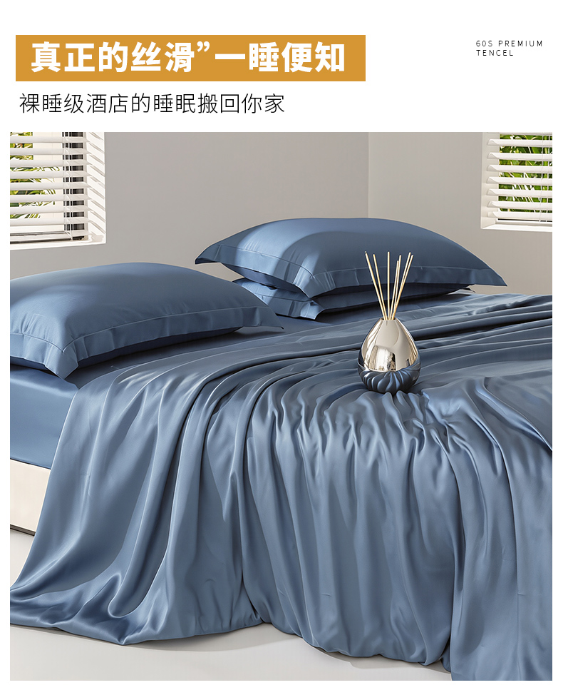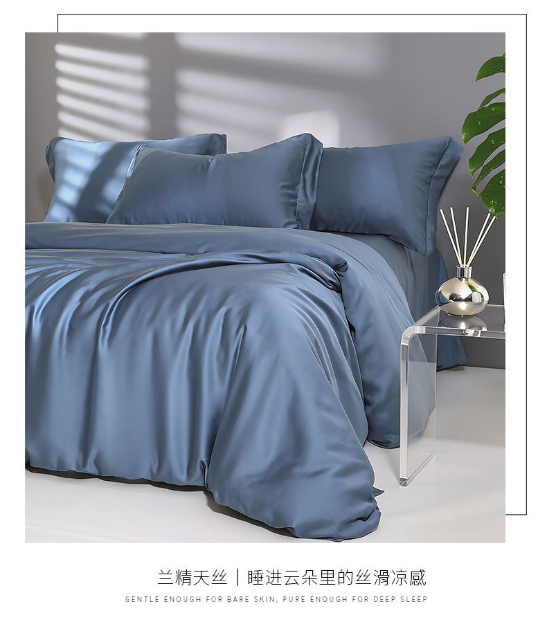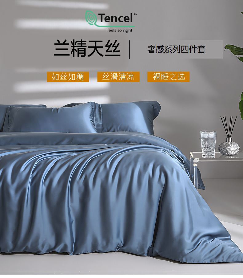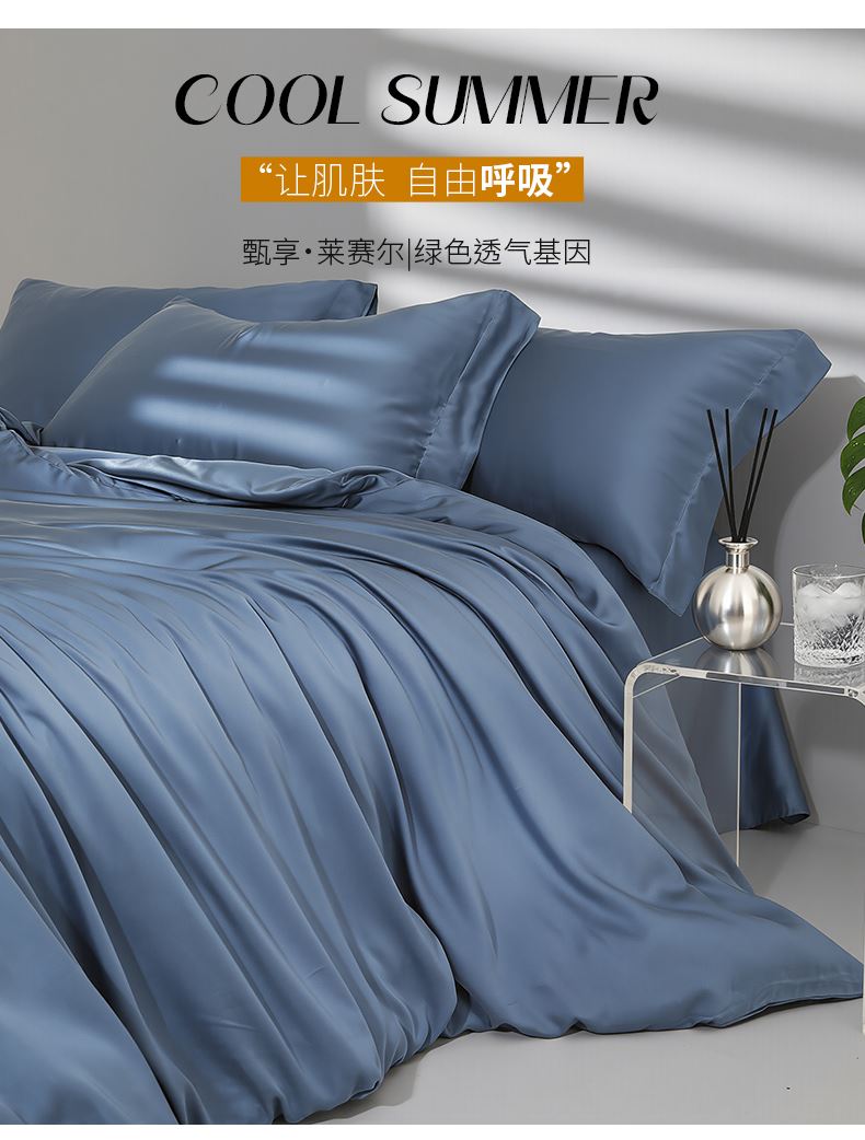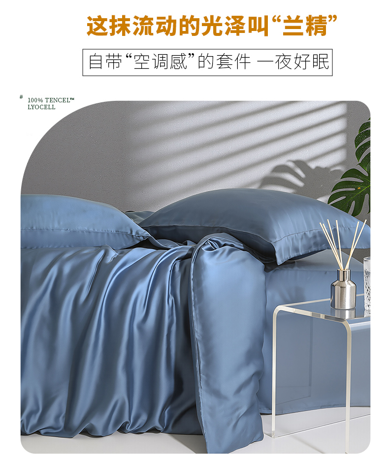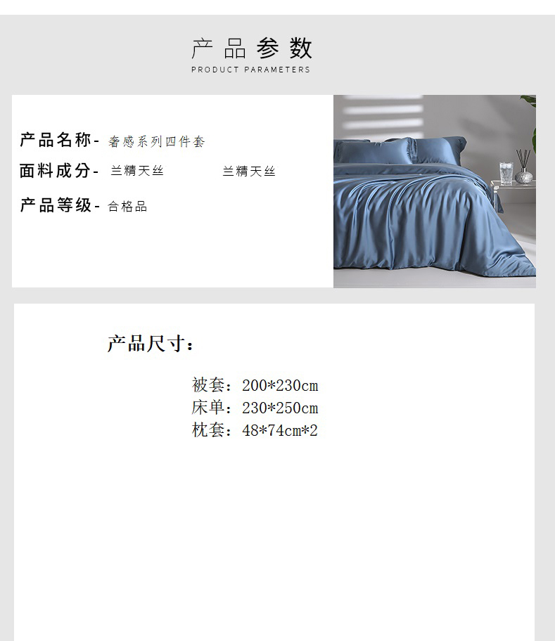 被套:200*230cm 床单:230*250cm 枕套:48*74cm*2 面料:兰精天丝 产品包装:精美礼盒 产品特点: 兰精天丝面料似乎注定就为盛夏而生,清爽飘逸垂坠丝般的光泽具有湿气管理功能,可自然地吸收和释放人体湿气亲和肌肤,提供持久的舒适感受,持久柔软、抑制细菌滋生色泽稳定持久亮丽即使经过多次洗涤也不易褪色。