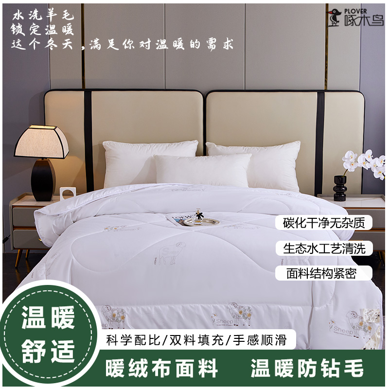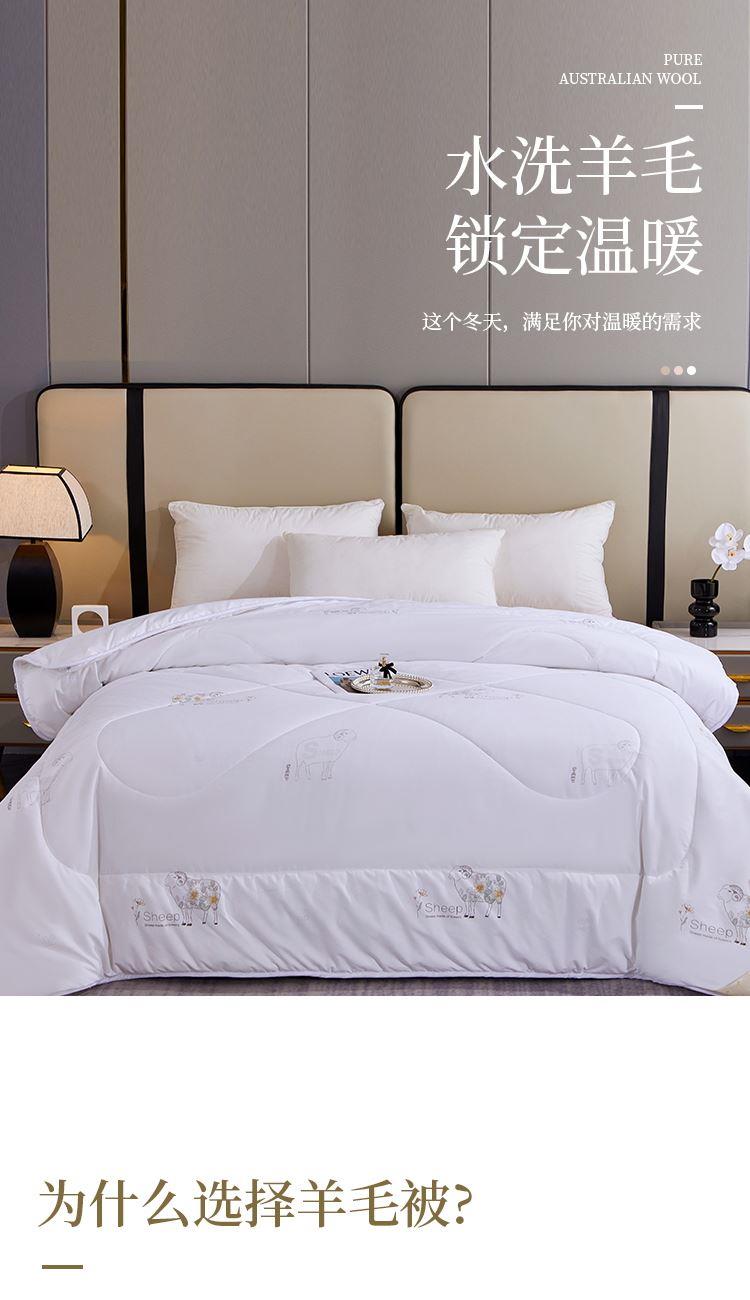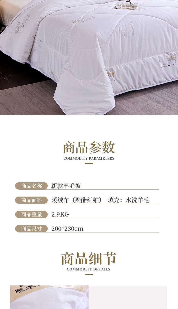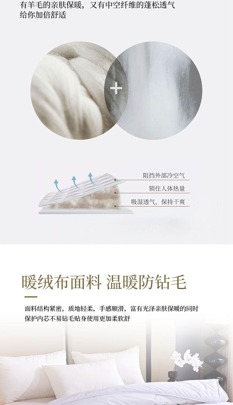 规格:200*230cm 填充:水洗羊毛 面料:仿羽布(聚酯纤维) 重量:2.9kg 1.采用暖绒面料,手感细腻舒适,透气性好,非常适合裸睡 2.采用羊毛填充,使用新型水洗工艺,健康安全,无异味 3.严谨绗缝工艺,可固定填充物和面料不易板结和变形