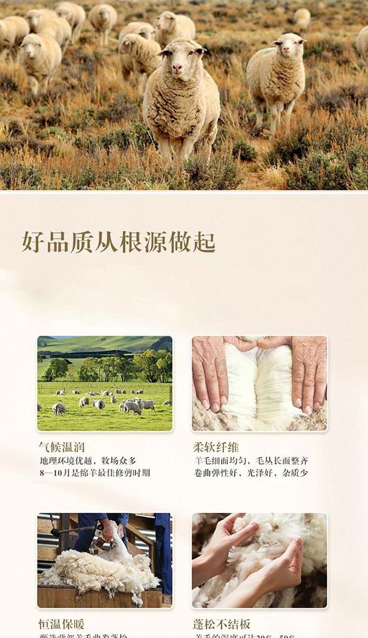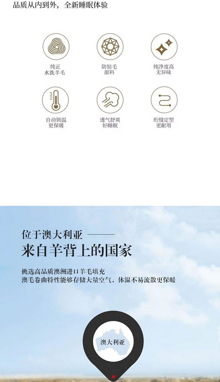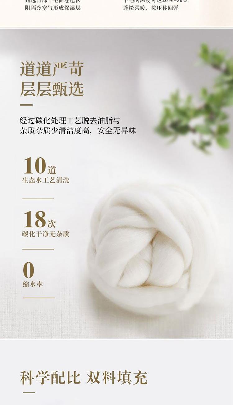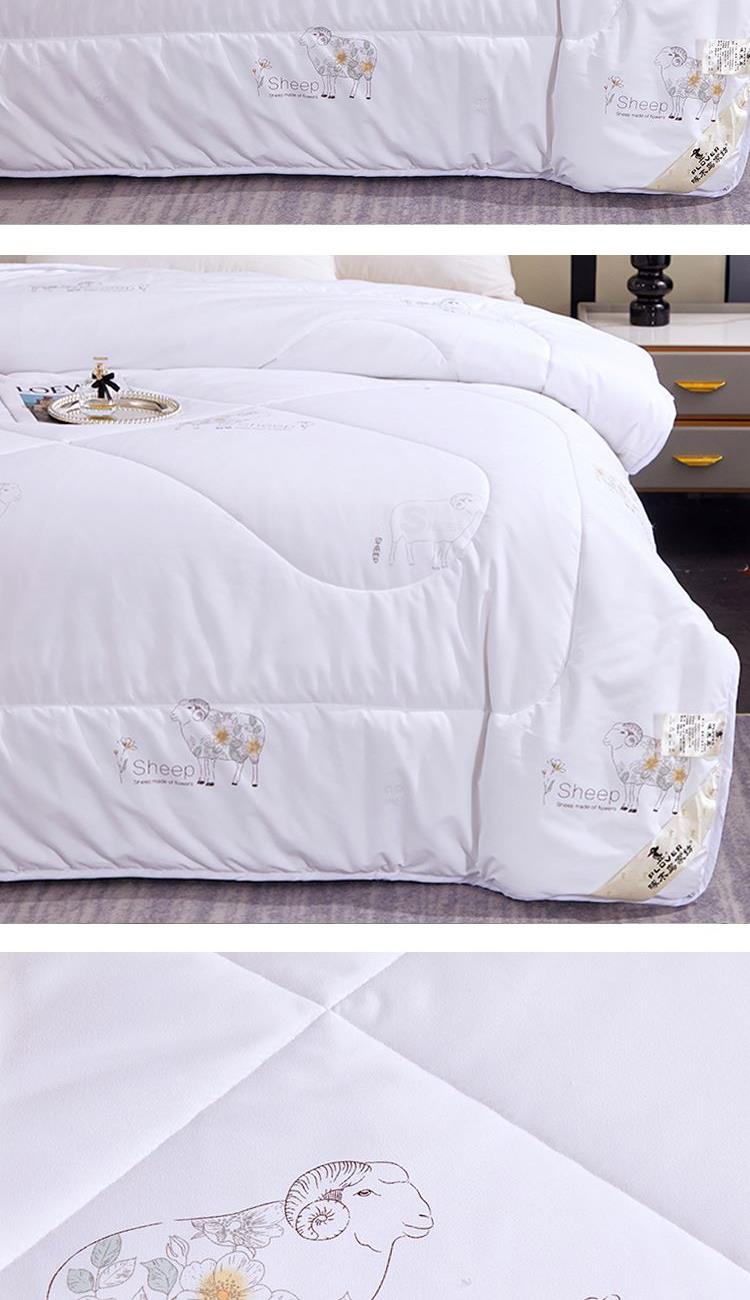 规格:200*230cm 填充:水洗羊毛 面料:仿羽布(聚酯纤维) 重量:2.9kg 1.采用暖绒面料,手感细腻舒适,透气性好,非常适合裸睡 2.采用羊毛填充,使用新型水洗工艺,健康安全,无异味 3.严谨绗缝工艺,可固定填充物和面料不易板结和变形
