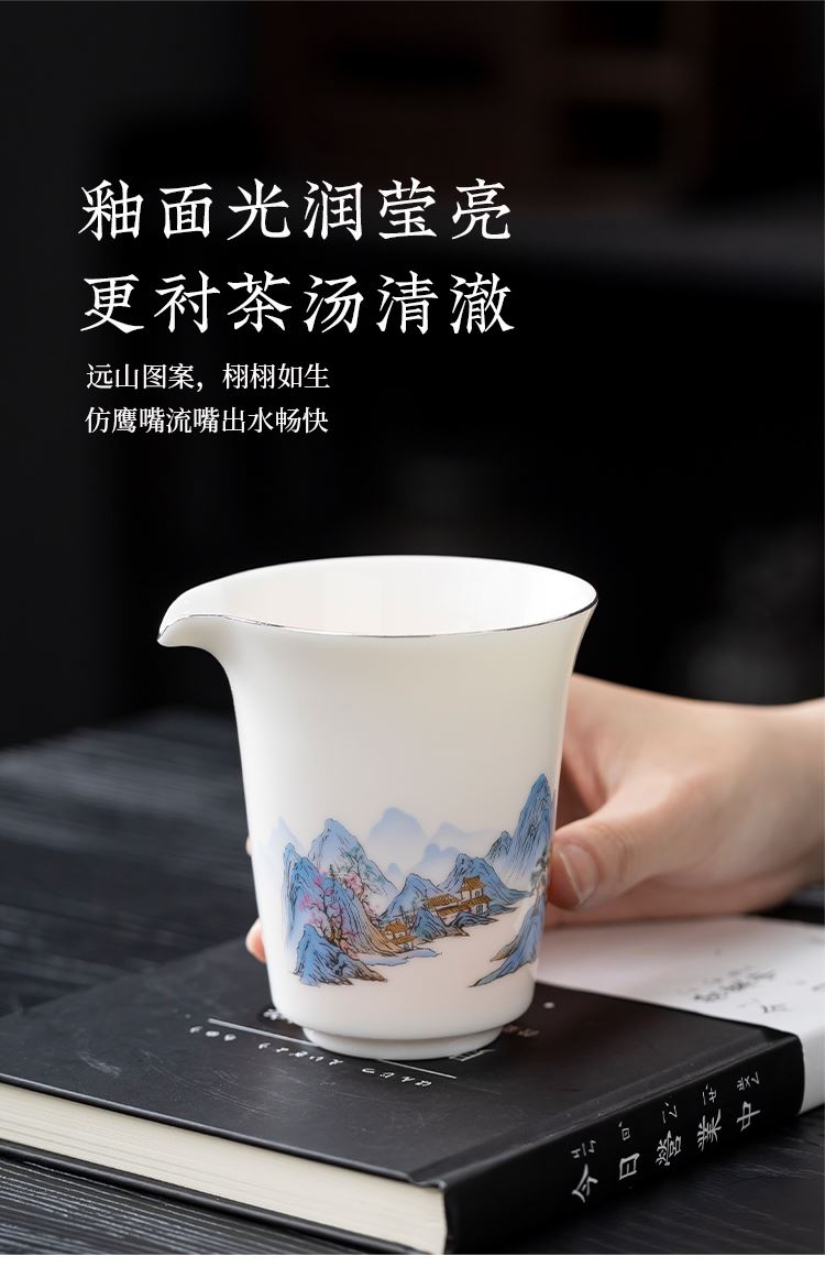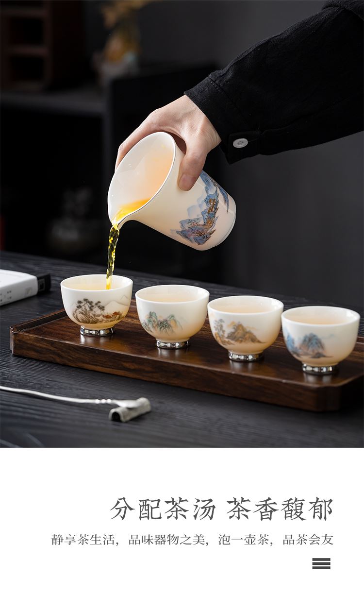 配置:品茗杯*4 陶瓷公道杯*1 壶*1 礼盒*1 腰封*1 材质:羊脂玉 礼盒尺寸:宽12.1cm/高12.6cm/长42cm 产品容量: 品茗杯:60ml 壶:220ml 公道杯230ml