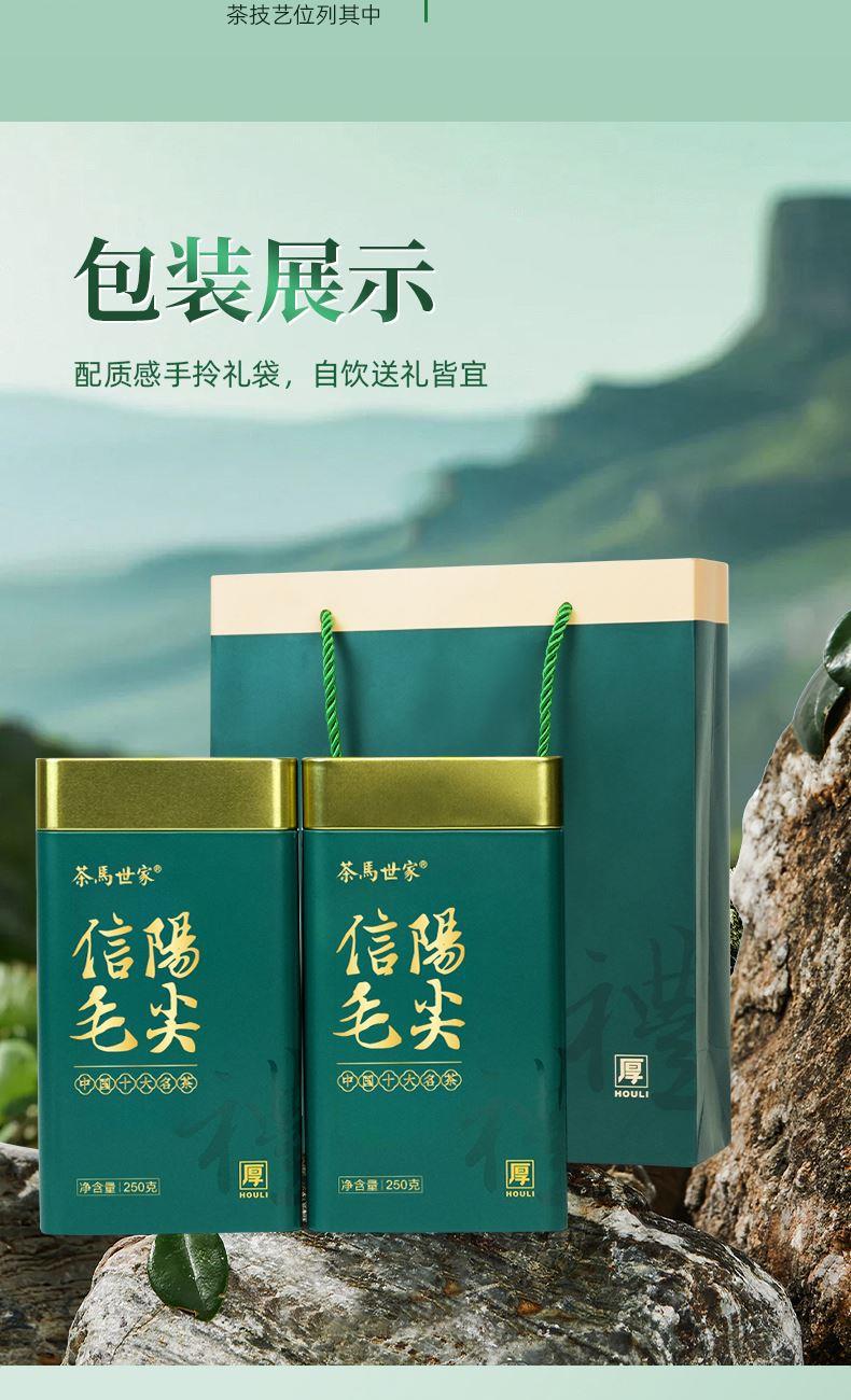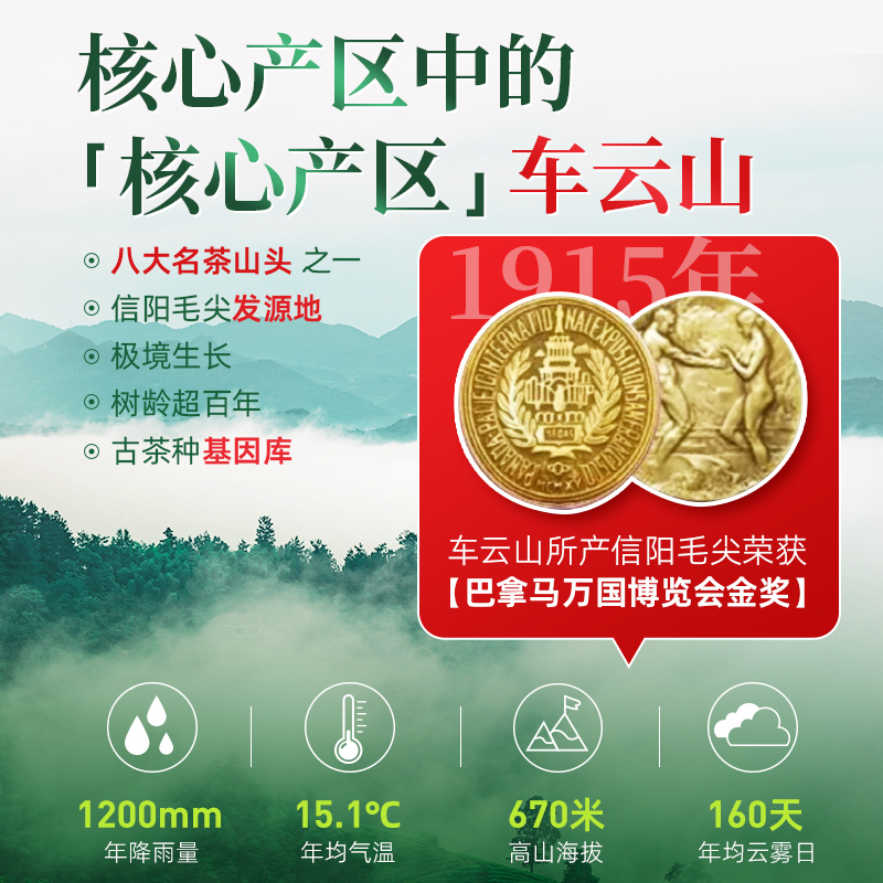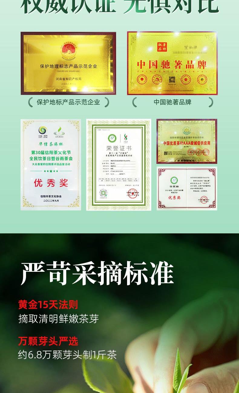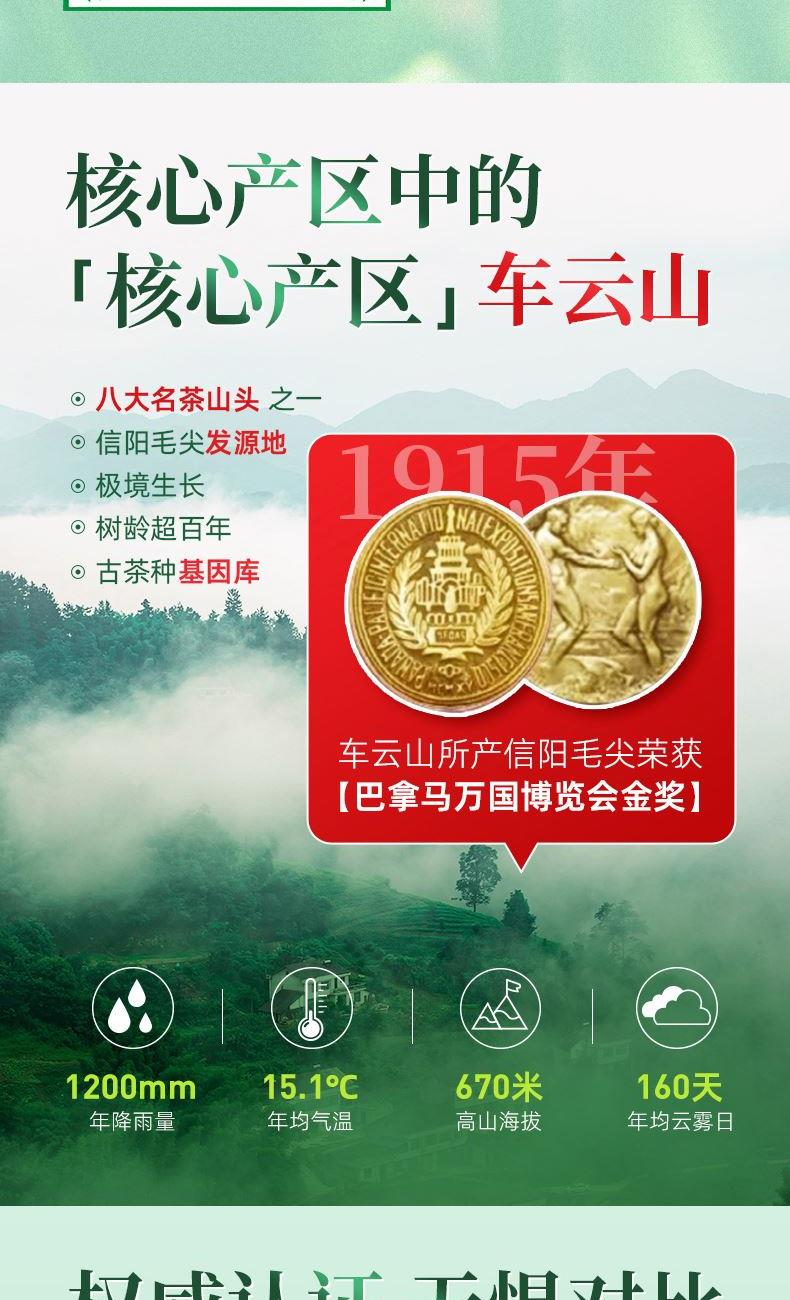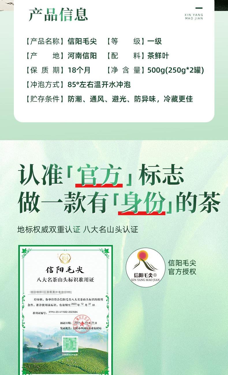 【等级】一级 【产名】信阳毛尖 【产地】河南信阳 【配料】茶鲜叶己 【保 质 期】18个月 【净 含 量】500g(250g*2罐) 【冲泡方式】85°左右温开水冲泡 【贮存条件】防潮、通风、避光、防异味,冷藏更佳 卖点: 1、地理标志认证,非遗工艺。 2、产自于信阳毛尖核心产区“车云山”,茶山平均海拔600米,全年平均气温15.1℃,昼夜温差大,气候湿润,雨量充沛,茶叶内含物质丰富。 3、手工传统炒茶,保留茶叶的品质和原始风味,制作技艺被列入非物质文化遗产名录。 4、清明期间采摘,精选一芽一叶、一芽二叶,确保茶叶的鲜嫩与匀整。 5、干茶白毫显露,细、圆、紧、光、直,香气鲜高,茶毫浮动,叶底色泽鲜活,柔软有弹性。 6、半斤装口粮茶,办公室茶,自饮、待客皆宜。