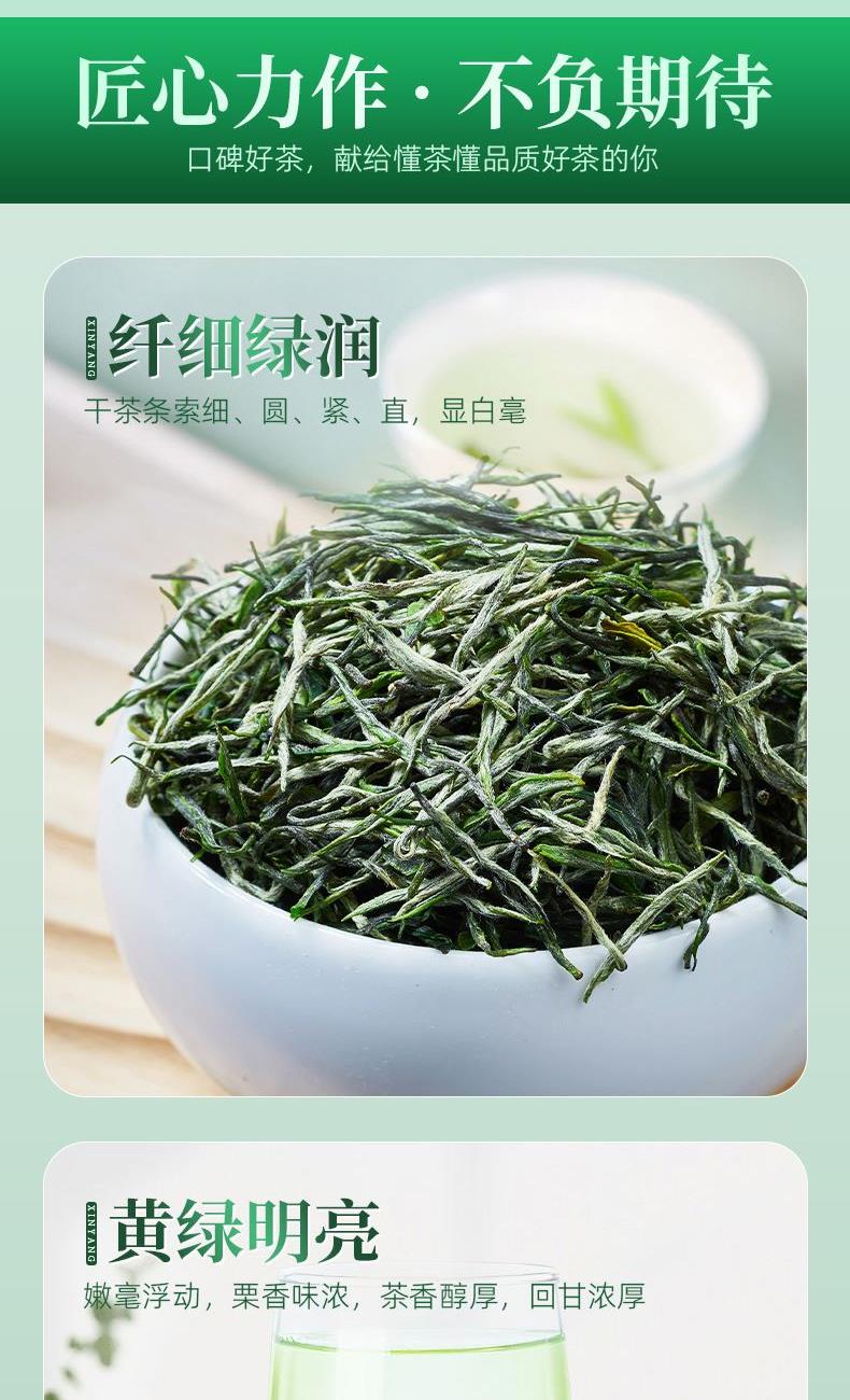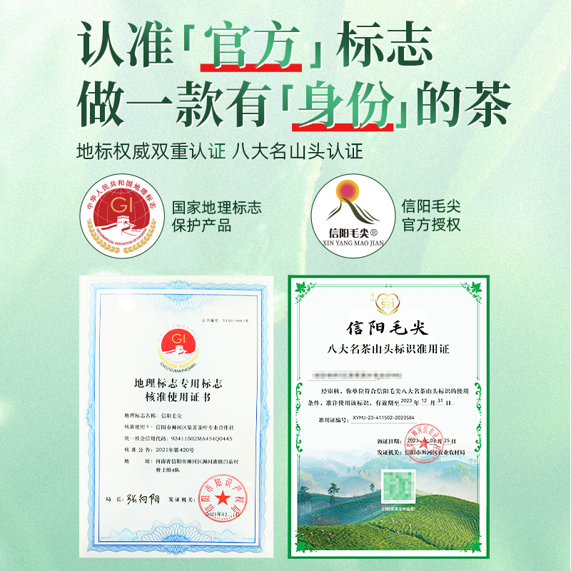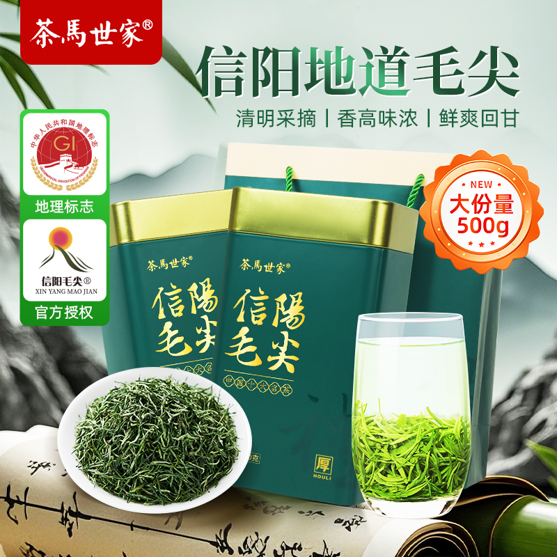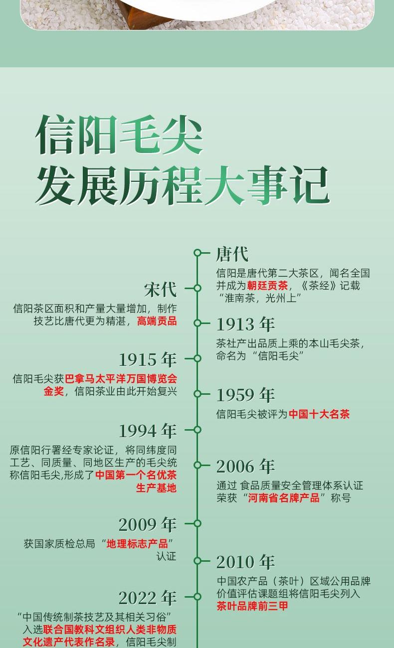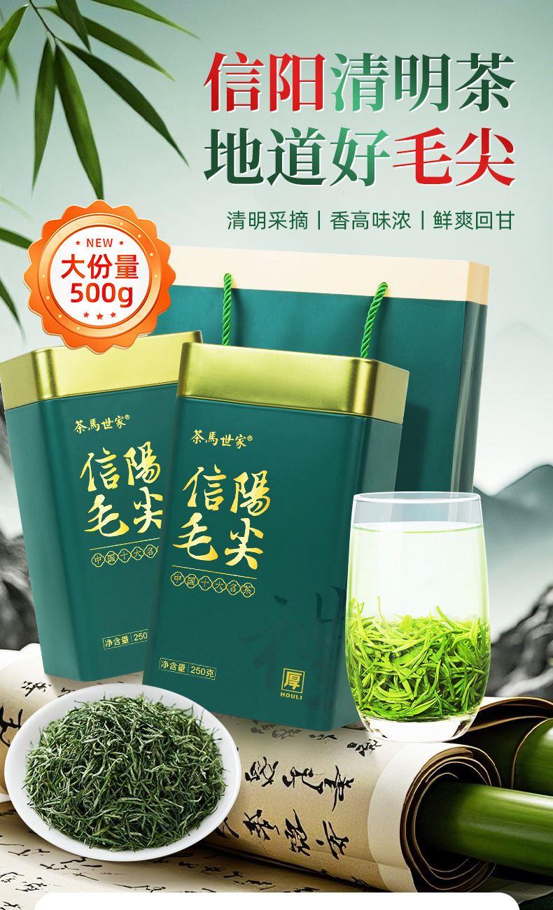 【等级】一级 【产名】信阳毛尖 【产地】河南信阳 【配料】茶鲜叶己 【保 质 期】18个月 【净 含 量】500g(250g*2罐) 【冲泡方式】85°左右温开水冲泡 【贮存条件】防潮、通风、避光、防异味,冷藏更佳 卖点: 1、地理标志认证,非遗工艺。 2、产自于信阳毛尖核心产区“车云山”,茶山平均海拔600米,全年平均气温15.1℃,昼夜温差大,气候湿润,雨量充沛,茶叶内含物质丰富。 3、手工传统炒茶,保留茶叶的品质和原始风味,制作技艺被列入非物质文化遗产名录。 4、清明期间采摘,精选一芽一叶、一芽二叶,确保茶叶的鲜嫩与匀整。 5、干茶白毫显露,细、圆、紧、光、直,香气鲜高,茶毫浮动,叶底色泽鲜活,柔软有弹性。 6、半斤装口粮茶,办公室茶,自饮、待客皆宜。