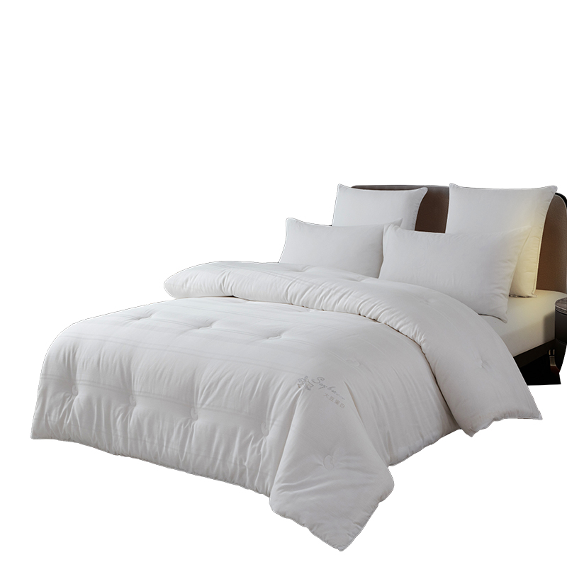 尺寸:200x230cm 填充物:2000g 被重:3100g 【面 料】全棉 【填充物】大豆蛋白纤维、超细羽丝纤维(聚酯纤维) 产品特点: 1.全棉贡缎提花面料,触感柔软,细腻亲肤,环保; 2.整张大豆蛋白纤维、超细羽丝纤维双料填充,柔软蓬松、蓄暖透气,轻盈不压身,舒适更升级; 3.细节用心,定点绗缝,本色布被角扣,烫钻装饰与产品浑然一体彰显高品质
