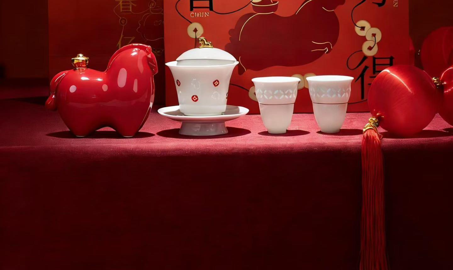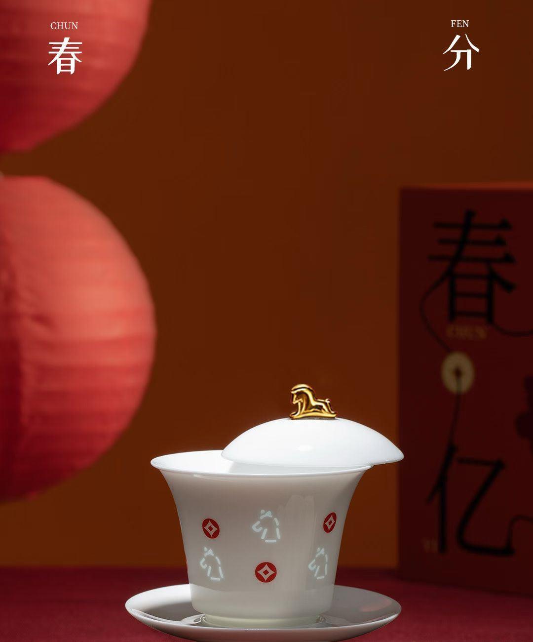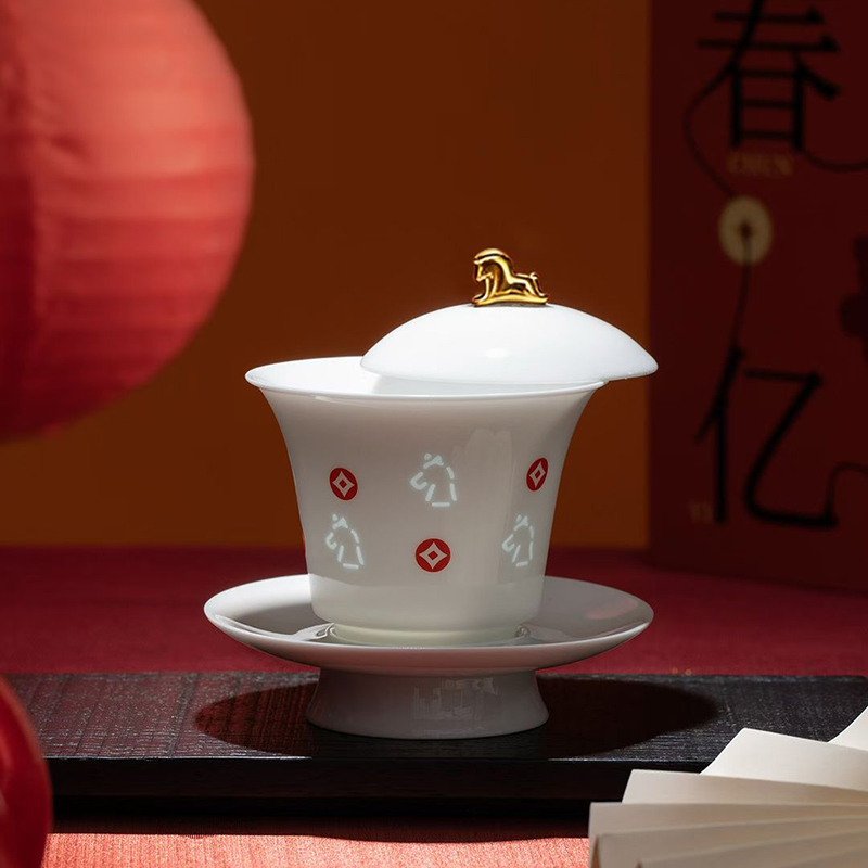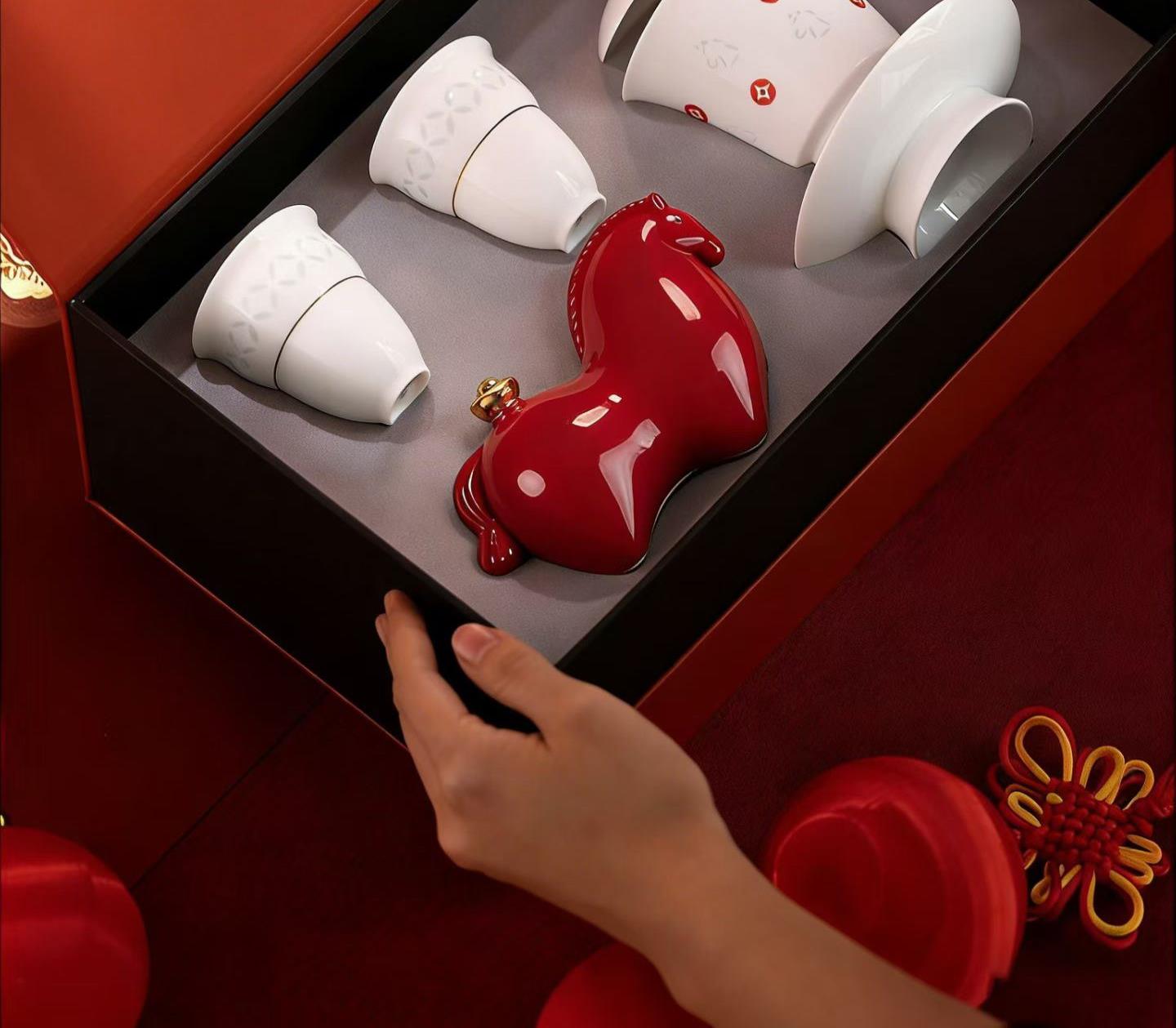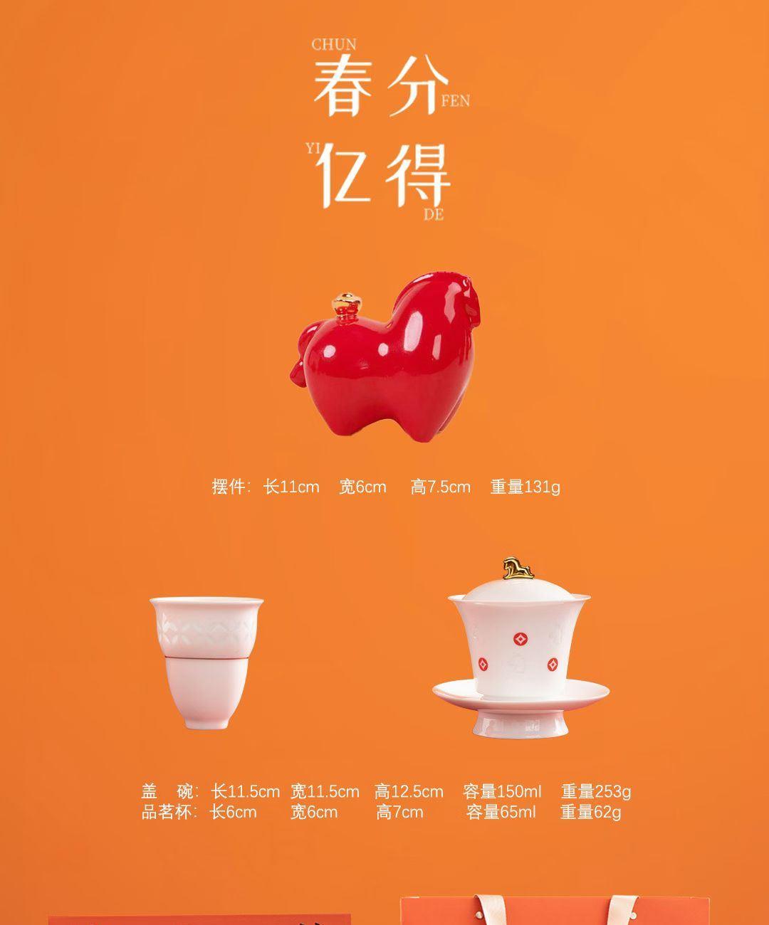 配置:盖碗*1,茶杯*2,小马摆件*1. 尺寸:盖碗11.5*12.5cm 容量150ml, 茶杯6*7cm 容量65ml。 小马摆件11*6*7.5cm, 礼盒:32*12.5*20.5cm。