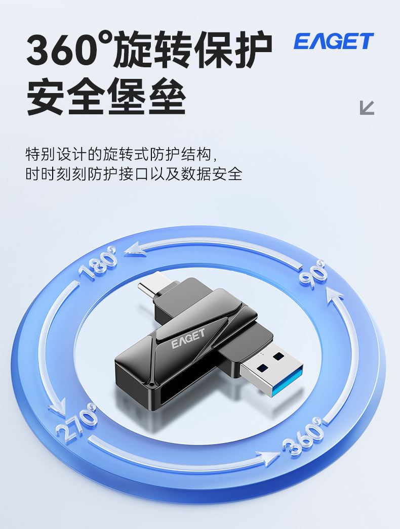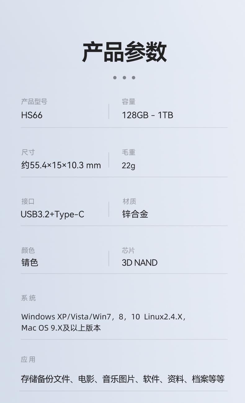 双接口均采用USB3.2,广泛兼容和更多设备对口 3D NAND 芯片 360°旋转保护安全堡垒 锖色电镀金属效果,坚固耐用 产品尺寸:55.4x15x10.3 mm 单品重量:22g