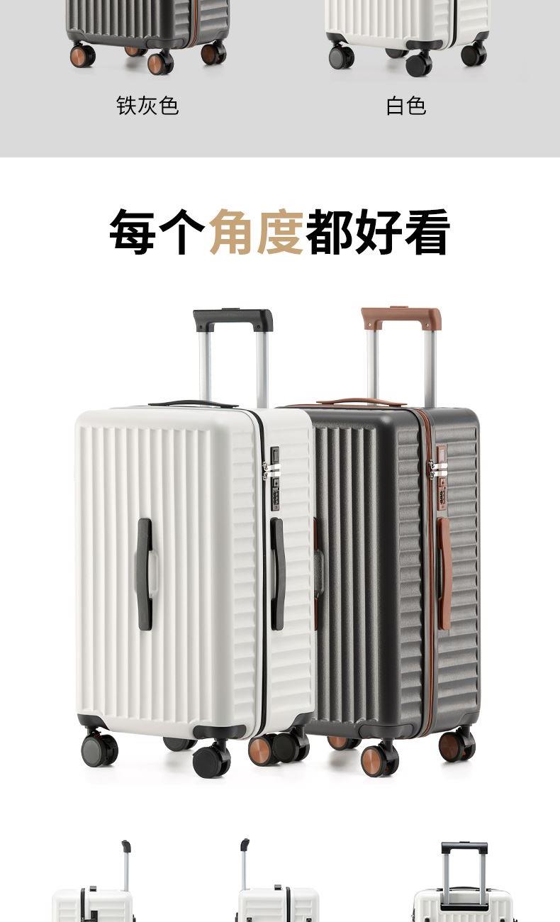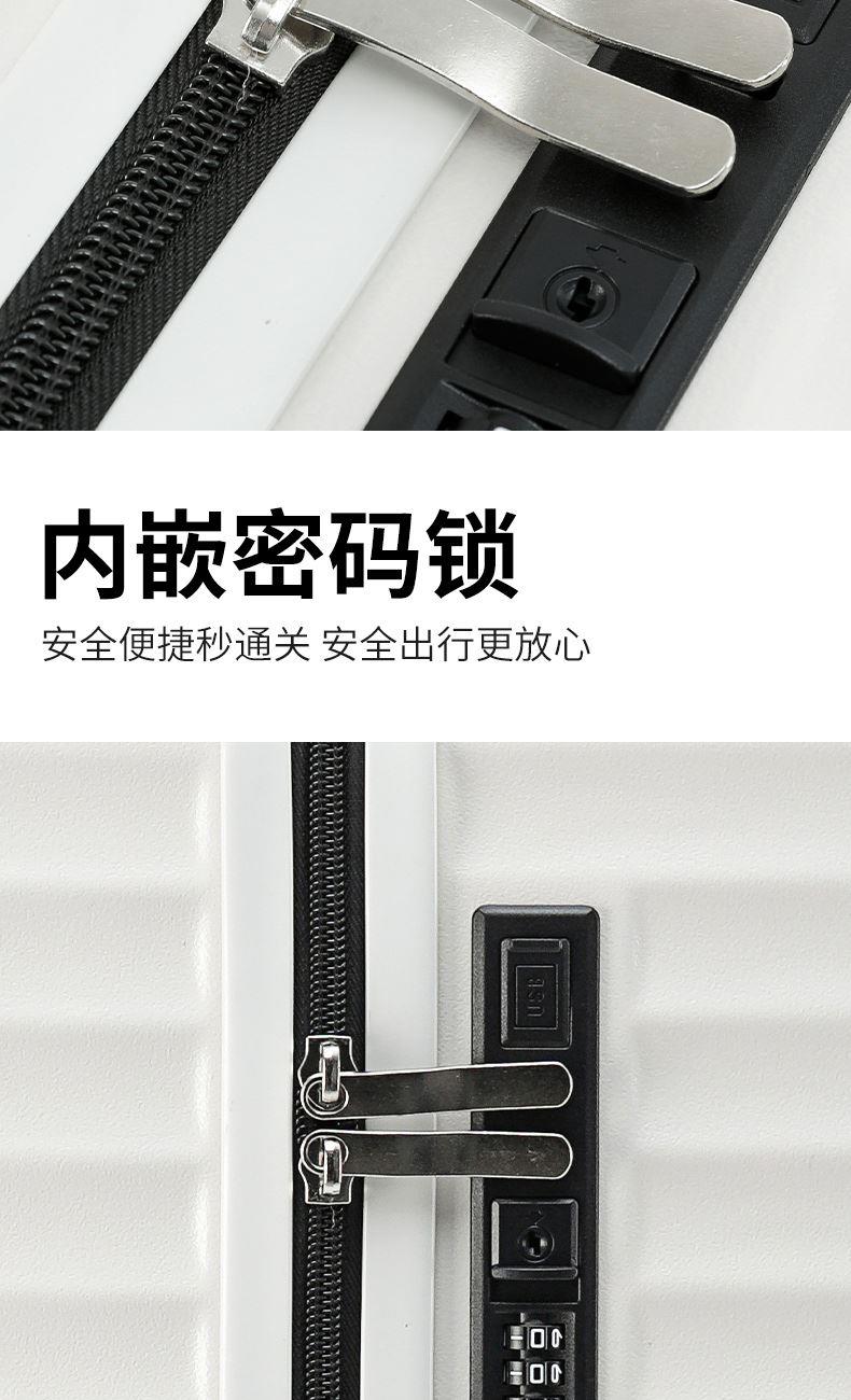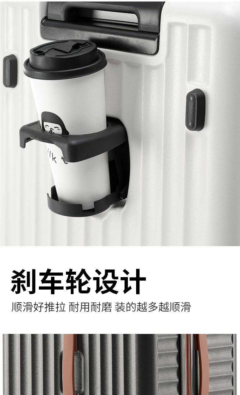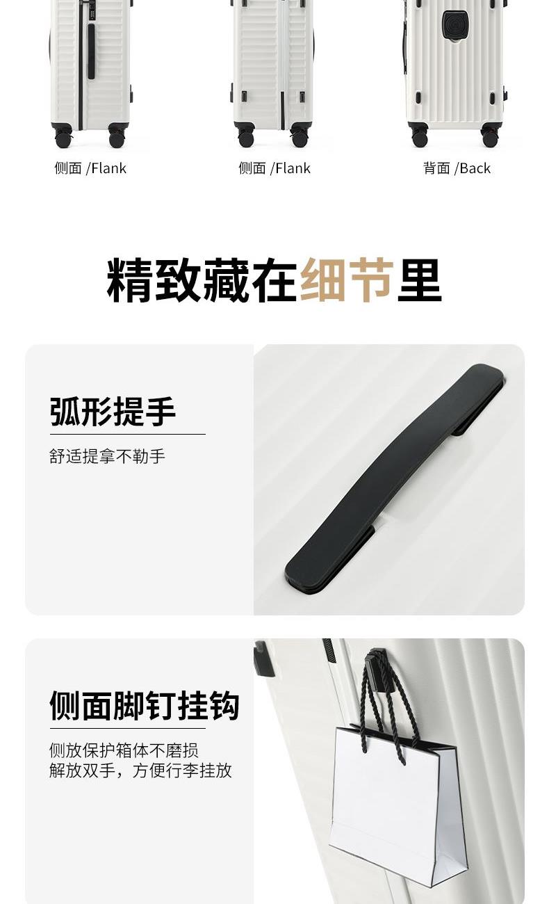 1.合金顺滑拉杆,管壁厚实,经久耐用。 2.采用ABS一体成型工艺,具有冲击强度高,耐摩擦的特点,坚固强韧,从容面对各种挑战。 3.灵活飞机八轮,360°旋转,带刹车,稳定顺滑,让旅途更省心。 4.USB充电口+杯架便捷出行设计。 5.内里干湿分离。