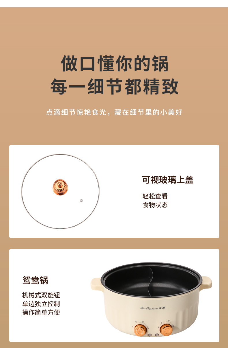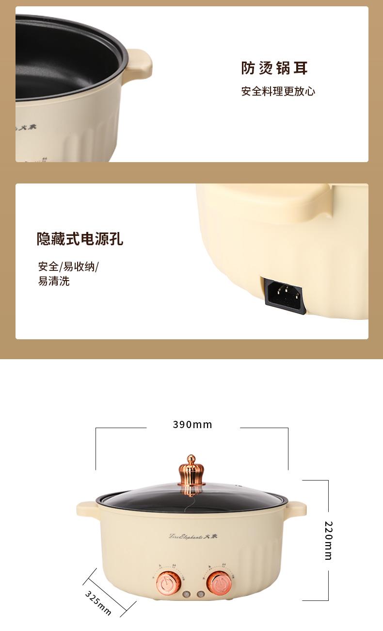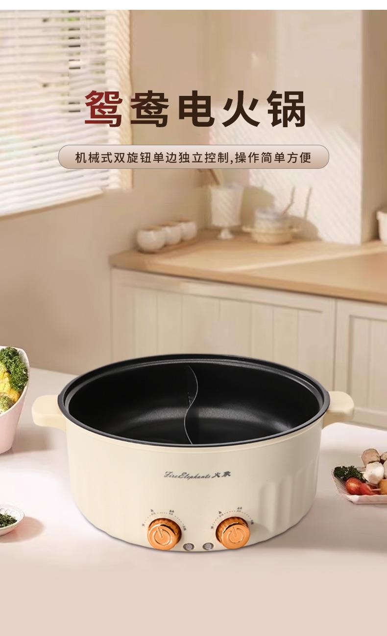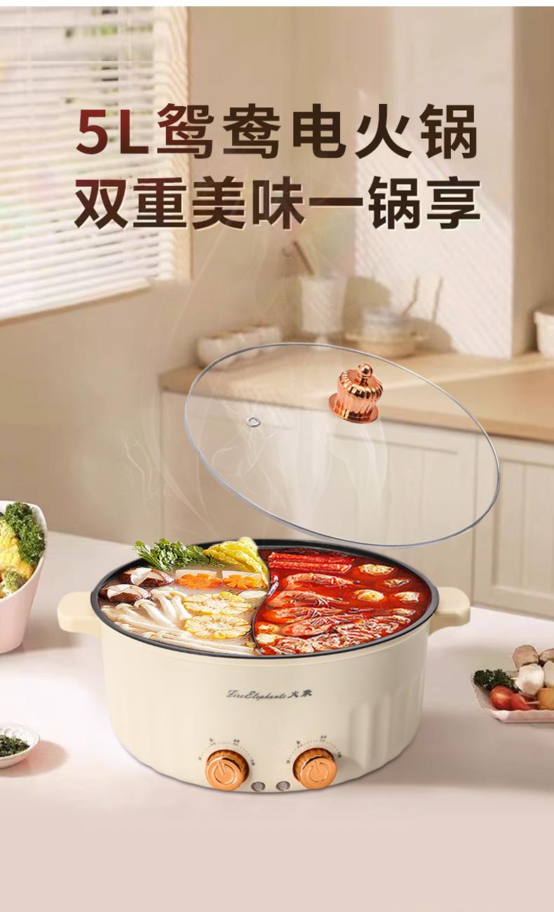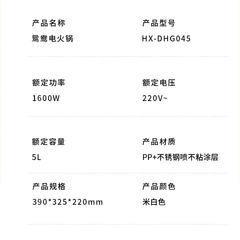 额定功率:1600W 额定电压:220V~ 额定频率:50Hz 额定容量:5L 产品净重/毛重:1.5kg/1.8kg 产品材质:PP+不锈钢喷不粘涂层 产品颜色:米白色 产品规格:390*325*220mm 彩盒尺寸:323*210*323mm 外箱尺寸:665*435*665mm 鸳鸯火锅一机多能,双格可同时使用也可以单独使用,鸳鸯火锅、独立火锅,轻松应对; 透明玻璃上盖,烹煮过程一目了然; 机械式双旋钮单边独立控制,操作简单方便; 食品级不粘涂层,久用不沾,一冲即净; 设有无水干烧自动跳断保护,安全料理更放心。