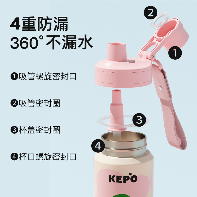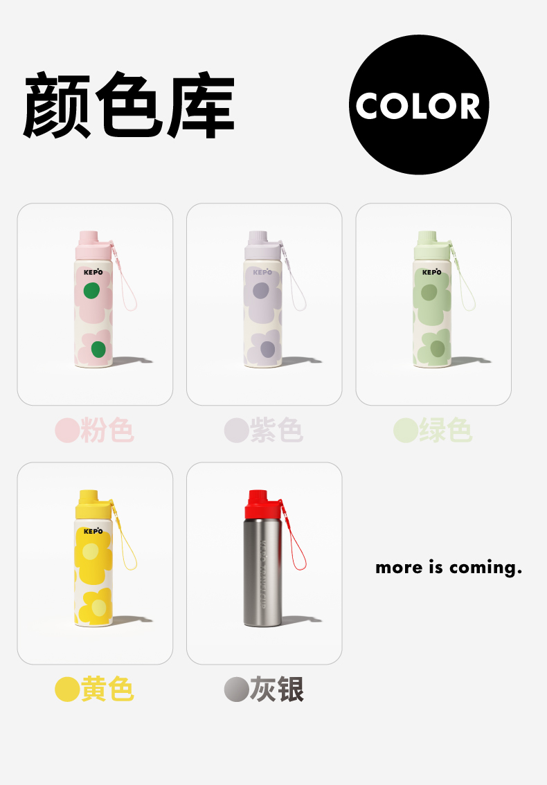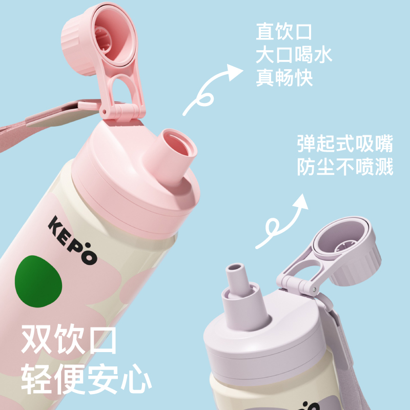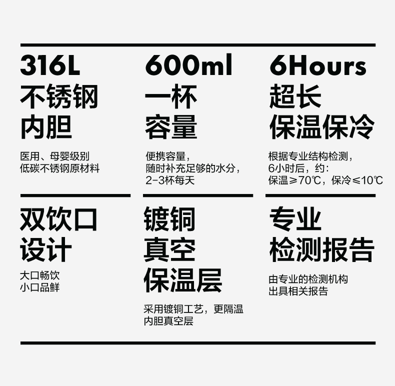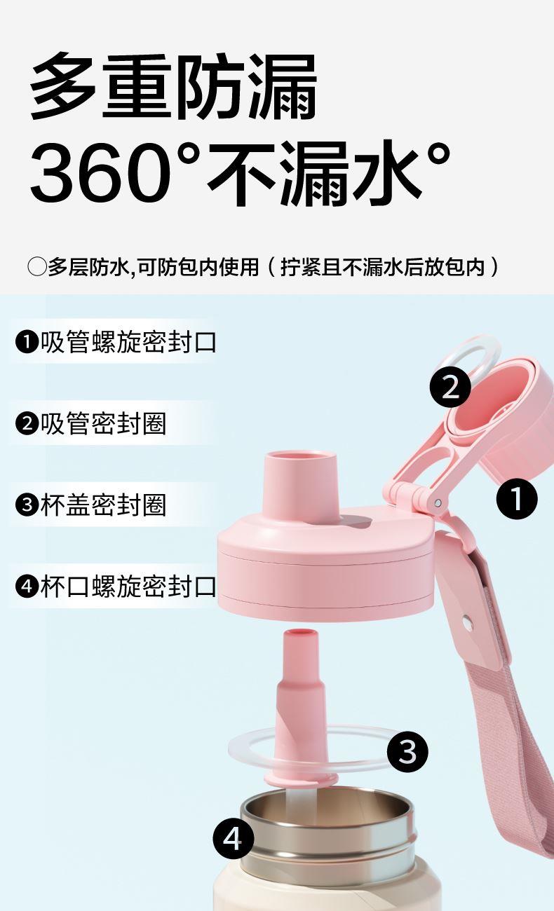 材质:316L不锈钢、硅胶、PP 颜色:灰色、粉色、紫色、绿色、黄色 包装:彩盒 (1)双饮设计,直饮、吸管畅快喝水 (2)提手设计 (3)多重密封设计 (4)长效保温、保冷(12H)