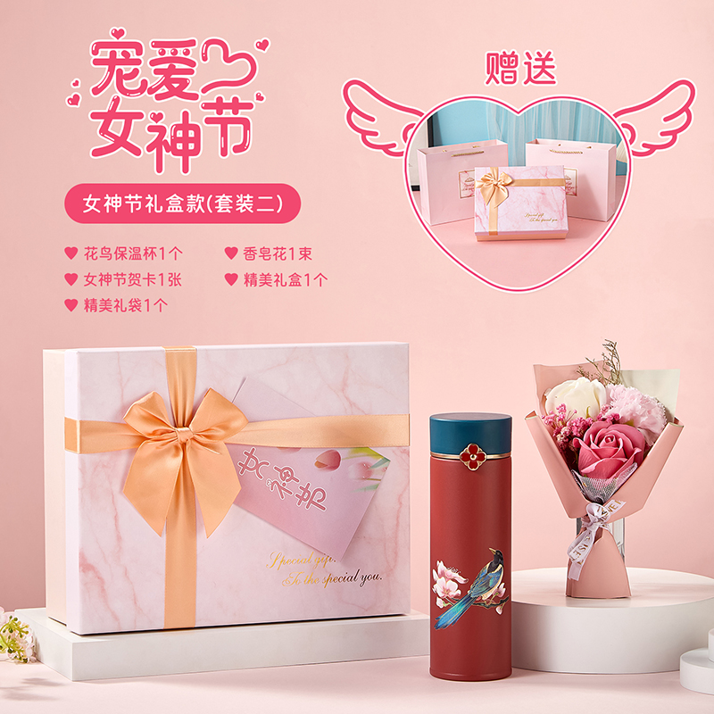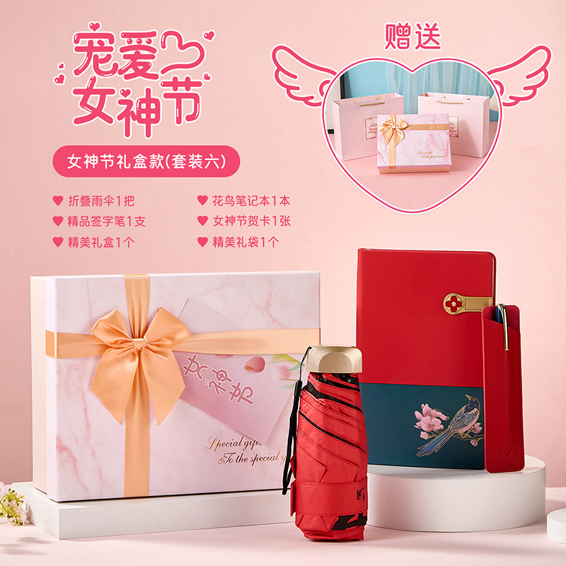 1.注:商城报价对应首张主图款式! 其他套装参考细节图,费用另计! 2. 咨询下单请备注好产品信息! 3.首图款式产品明细:女神节礼盒款(套装四): 折叠雨伞1把 花鸟保温杯1个 女神节贺卡1张 精美礼盒1个 精美礼袋1个