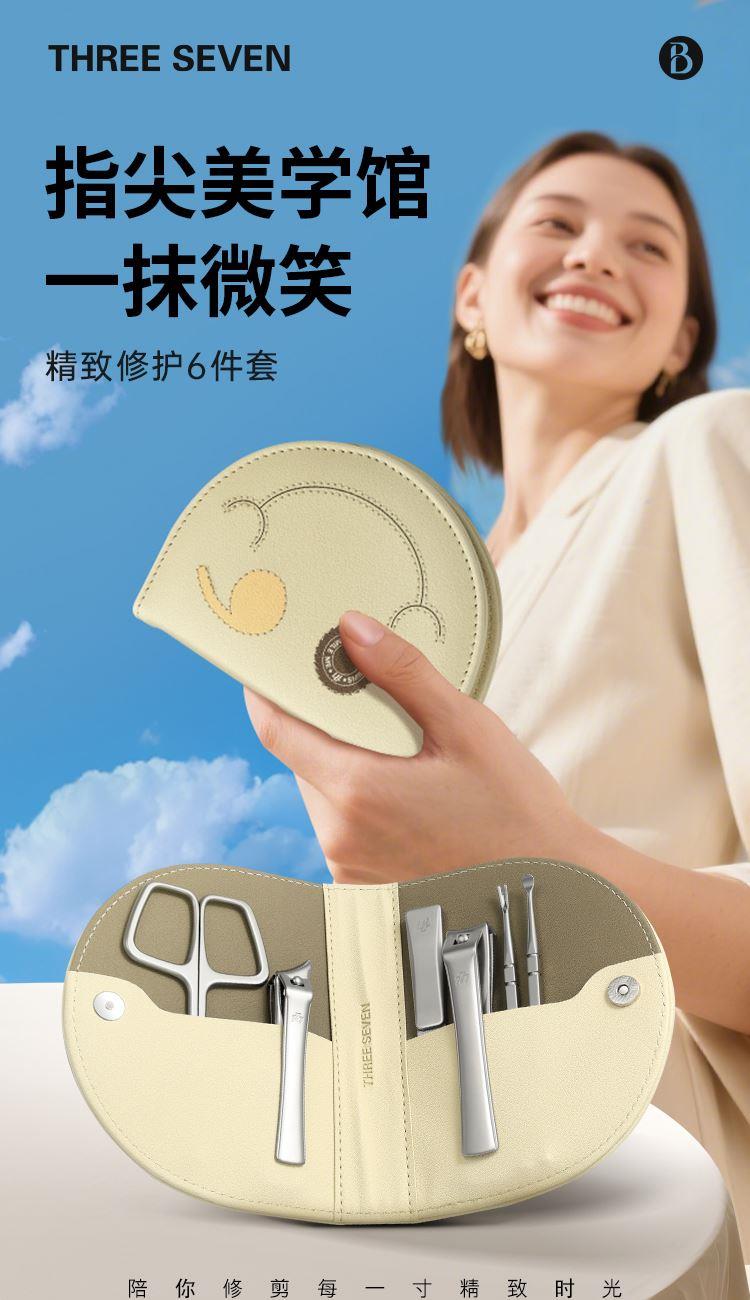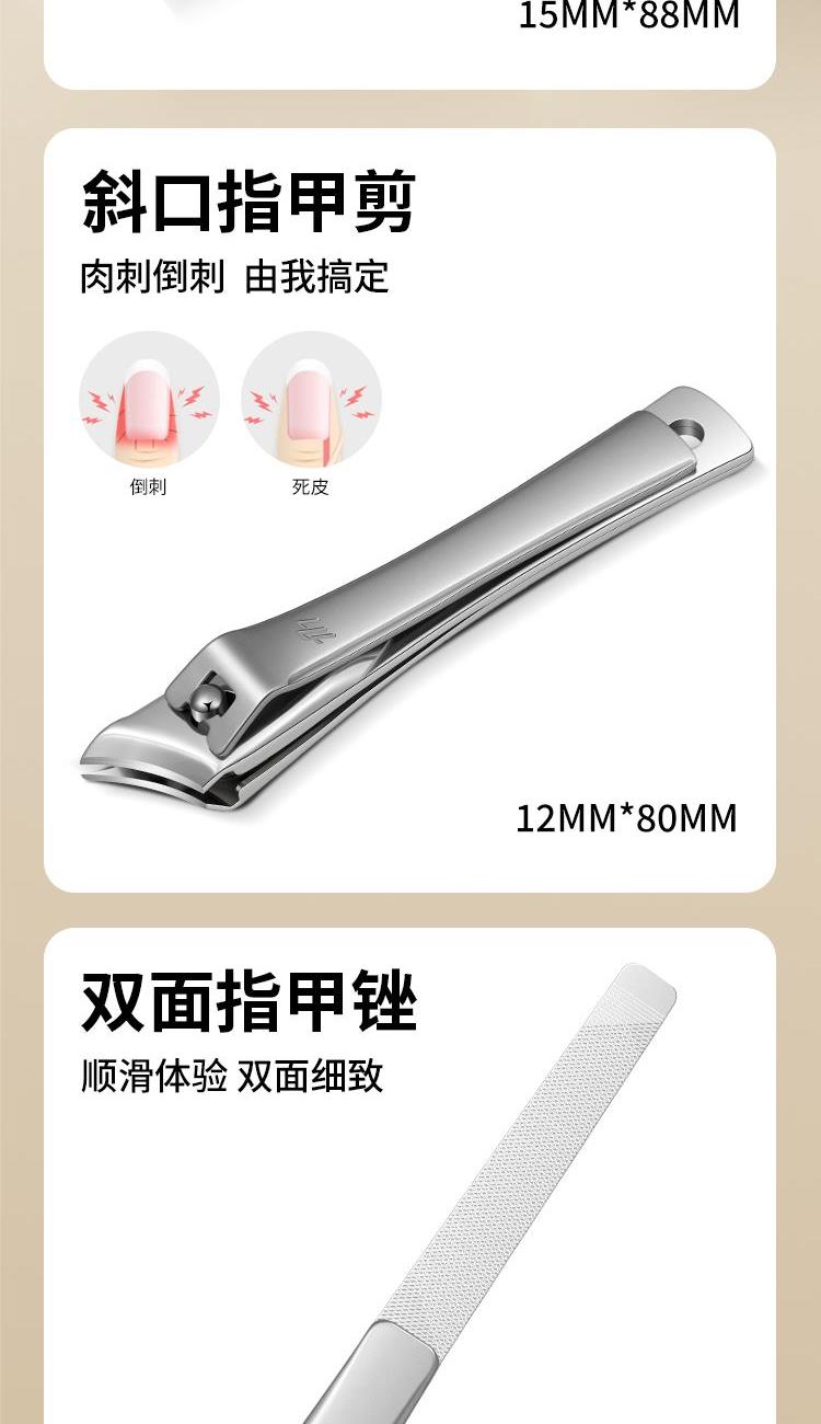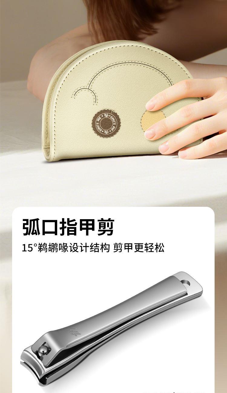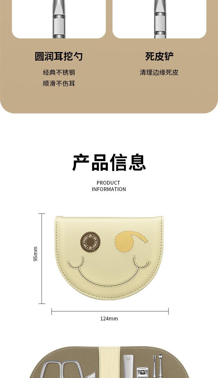 材质:优质不锈钢 规格:128*83*15mm 产品颜色:棕色 套装内容:6件套 产品配件:大号平口、中号斜口、安全剪、锉片、死皮铲、耳挖 产品卖点: 1)萌趣皮套,颜值在线:可爱造型皮套,精致又吸睛,把 “美学馆” 装进口袋,拿在手上尽显俏皮与时尚,为日常护理增添愉悦感。 2)6 件套装,全面呵护:包含多样美甲美护工具,从修剪到精细护理,一套搞定,满足指尖修护需求,让每一次护理都细致入微。 3)便携随行,时尚精致:小巧易携的设计,不管是出门在外还是居家使用,都能轻松拿出,守护指尖精致,绽放自信微笑。